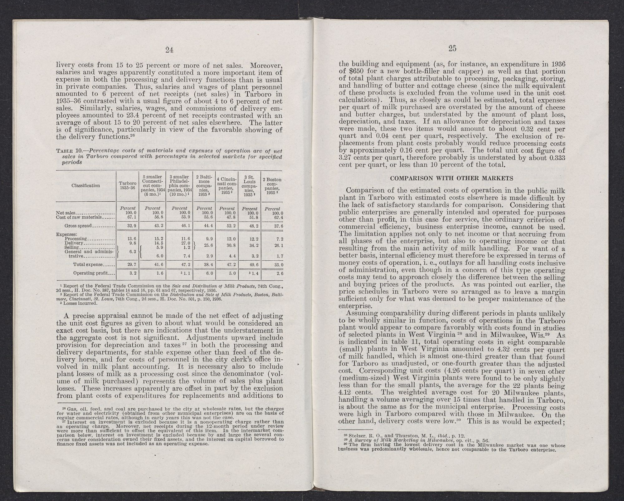 31 The remuneration to employees in the Tarboro enterprise probably is somewhat above competitive rates for the particular section of the country. (The route men are paid premiums for increased sales volumes, the same as in competitive markets.)32 In general, milk was utilized in about the same manner in the three areas under consideration. During those periods for which corresponding cost data are given, the proportion of eligible bottling milk used for whole milk and cream, and for other purposes was as follows: Tarboro, 52, 25, and 23 percent, respectively; Milwaukee, 51, 13, and 36 percent, respectively; West Virginia plants, 53, 19, and 28 percent, respectively. No reconciliation could be made of differences in the cost data due to differences in byproducts manufactured.major importance. Moreover, with average costs of materials in 1935-36 about 20 percent or more higher than in 1933 and about 7 percent higher than in 1934 and with wage rates in even more striking contrast,33 adjustments of costs in the several markets to a comparable basis likely would reveal the results for Tarboro in a more favorable position than is indicated in table 10.