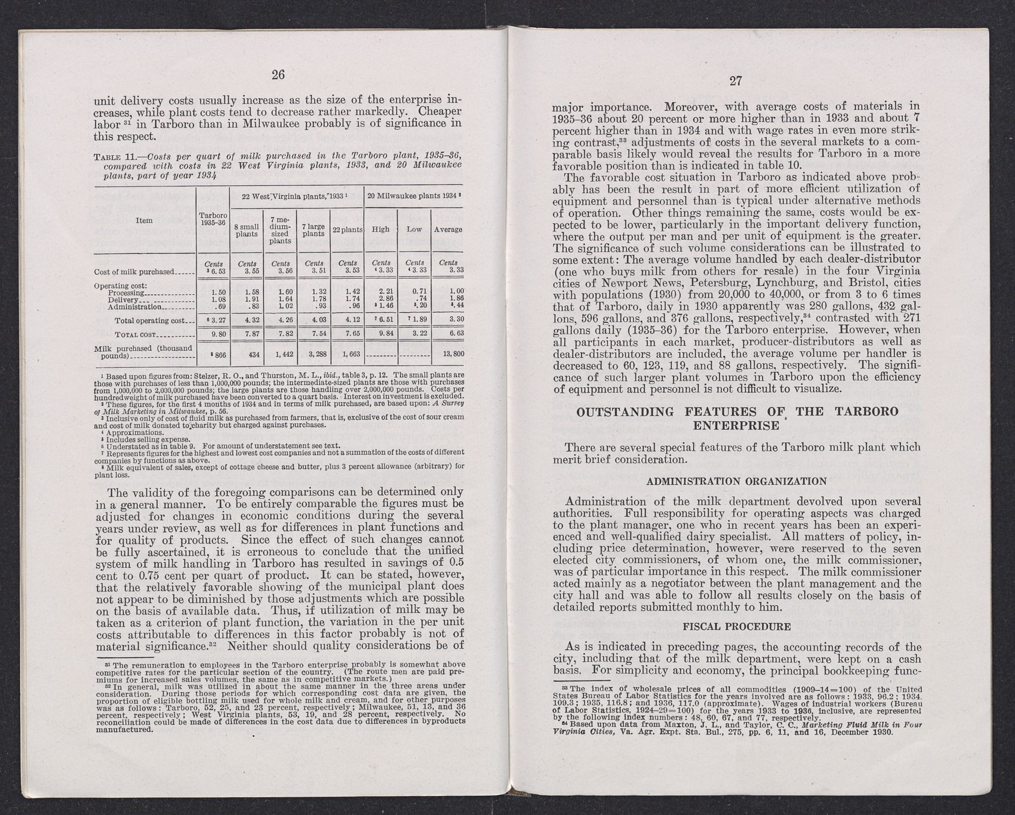 6. The money cost of processing and delivering milk and other dairy products in the Tarboro municipal plant averaged 3.27 cents per quart of milk handled during the year 1935-36, of which volume about 58 percent was sold in bottled form. This cost is exclusive of charges for the equivalent of depreciation, interest, and taxes. As closely as could be computed, these costs (depreciation at rates typical for this type of enterprise, interest at 5 percent, and taxes at then prevailing rates) probably would add not over 10 percent to the total unit cost as given above. While delivery costs in conventional accounting are prorated over the volume of products or points actually dispensed on the delivery routes, rather than over the total volume handled in the plant as in this case, rough comparison with operating costs in other markets is permissible if the same bases are used throughout. On this basis, the estimated cost in this market was found to be about the same as for an average of privately operated but much larger plants in Milwaukee, Wis., during the first 4 months of 1934, and from 0.5 to 0.75 cent per quart (similarly for all fluid products expressed in milk equivalent) less than that for 22 various-sized plants in West Virginia during 1933.