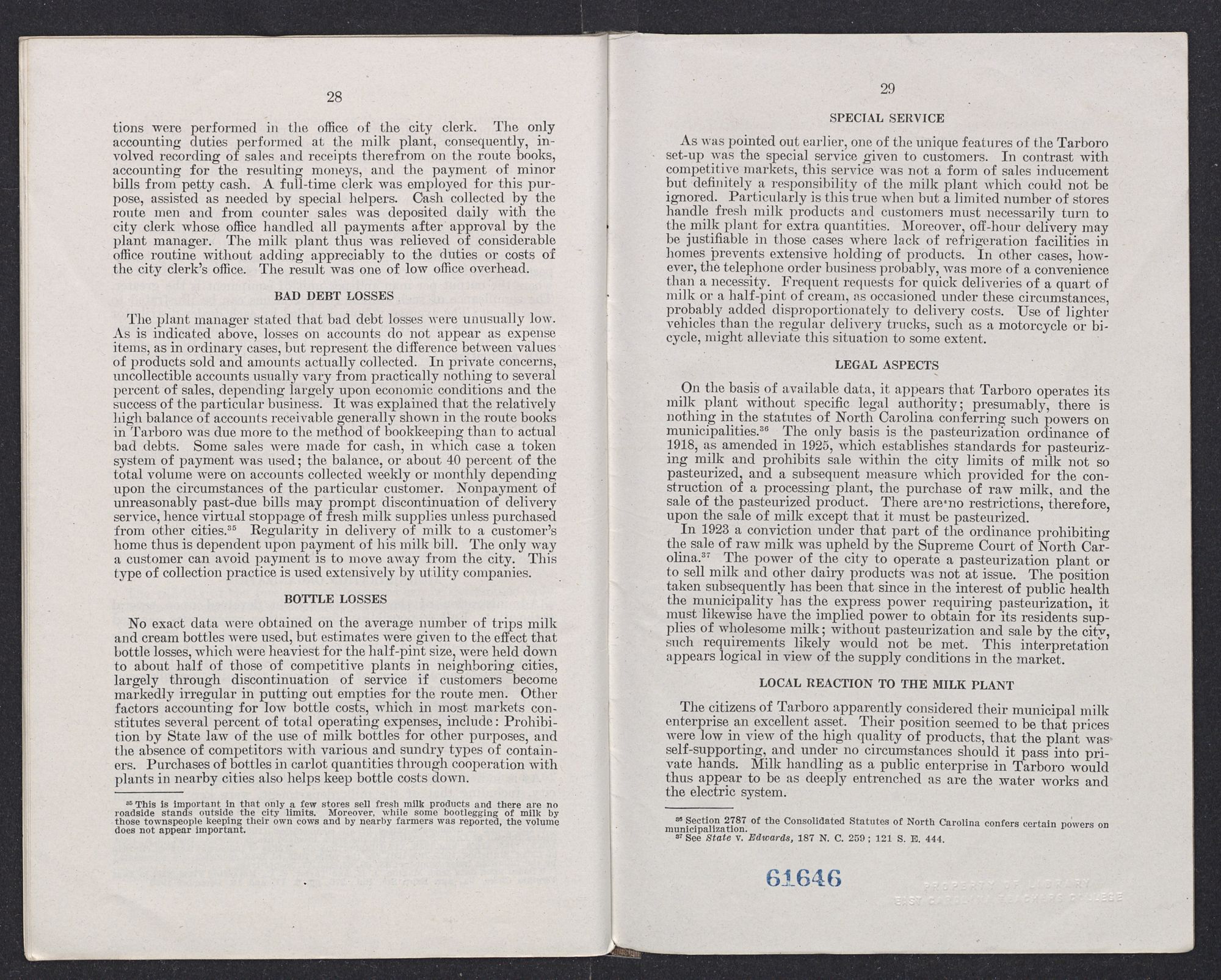 BAD DEBT LOSSESThe plant manager stated that bad debt losses were unusually low. As is indicated above, losses on accounts do not appear as expense items, as in ordinary cases, but represent the difference between values of products sold and amounts actually collected. In private concerns, uncollectible accounts usually vary from practically nothing to several percent of sales, depending largely upon economic conditions and the success of the particular business. It was explained that the relatively high balance of accounts receivable generally shown in the route books in Tarboro was due more to the method of bookkeeping than to actual bad debts. Some sales were made for cash, in which case a token system of payment was used; the balance, or about 40 percent of the total volume were on accounts collected weekly or monthly depending upon the circumstances of the particular customer. Nonpayment of unreasonably past-due bills may prompt discontinuation of delivery service, hence virtual stoppage of fresh milk supplies unless purchased from other cities.35 Regularity in delivery of milk to a customer's home thus is dependent upon payment of his milk bill. The only way a customer can avoid payment is to move away from the city. This type of collection practice is used extensively by utility companies.