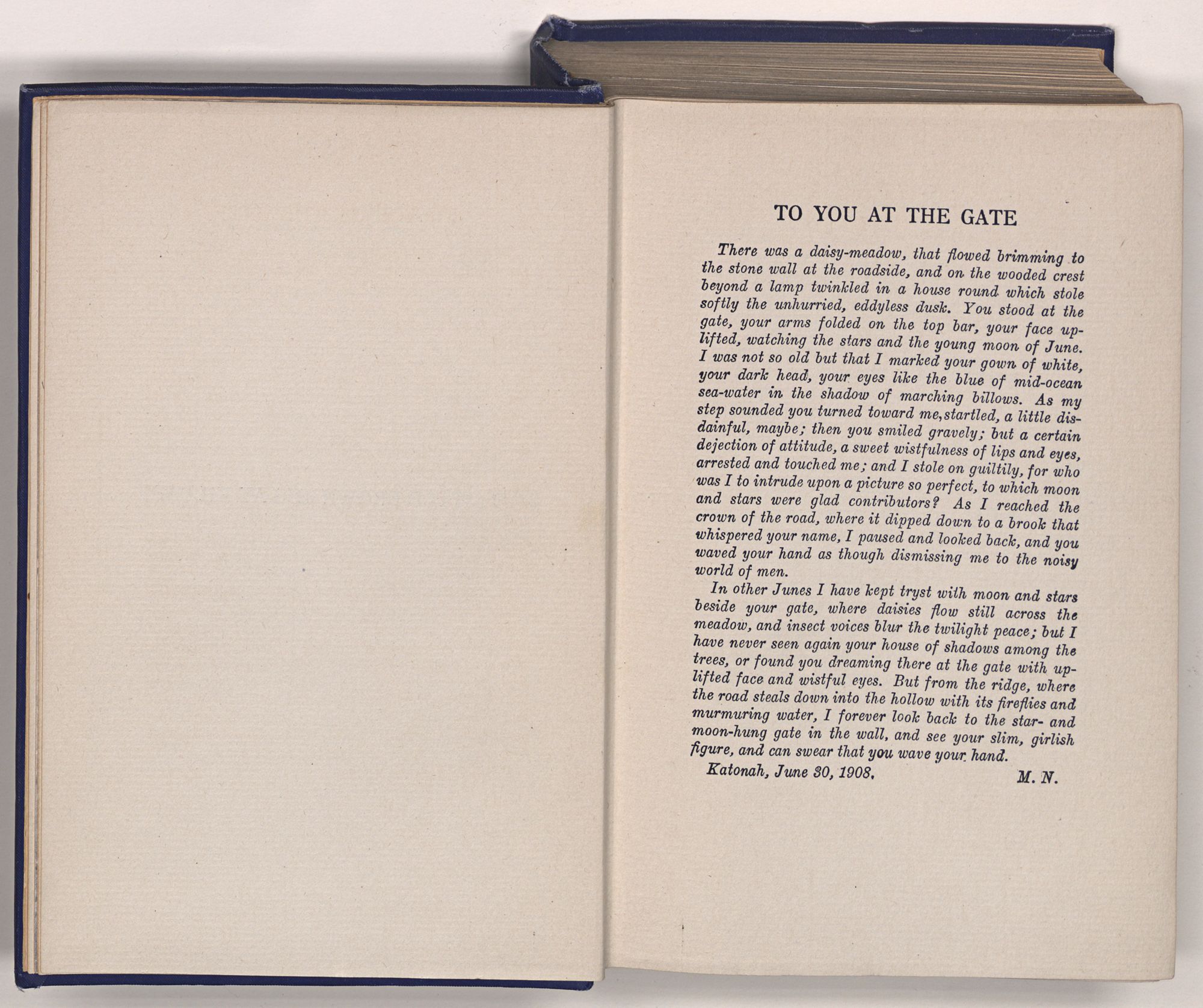 In other Junes I have kept tryst with moon and stars beside your gate, where daisies flow still across the meadow, and insect voices blur the twilight peace; but I have never seen again your house of shadows among the trees, or found you dreaming there at the gate with uplifted face and wistful eyes. But from the ridge, where the road steals down into the hollow with its fireflies and murmuring water, I forever look back to the star- and moon-hung gate in the wall, and see your slim, girlish figure, and can swear that you wave your hand.
