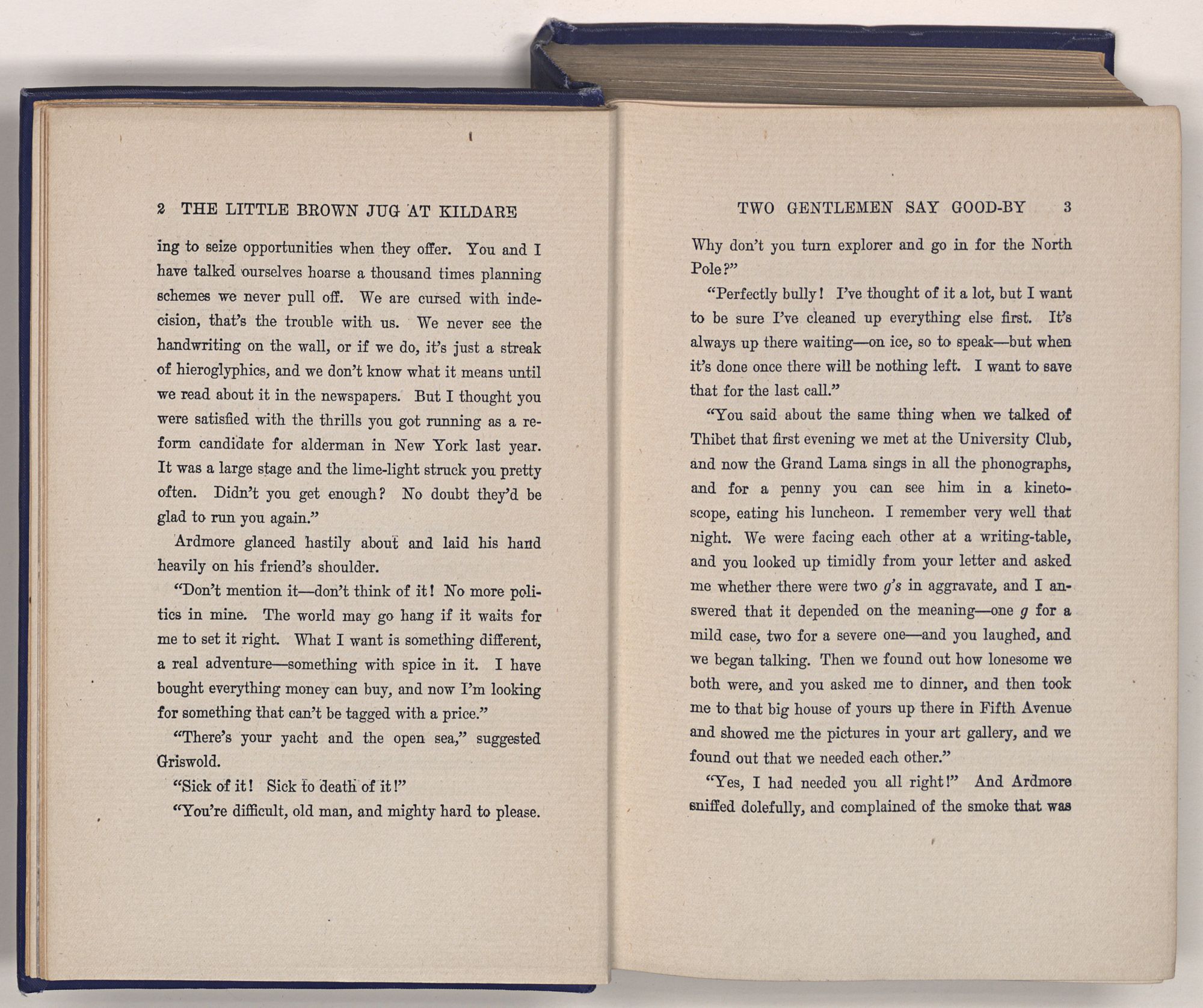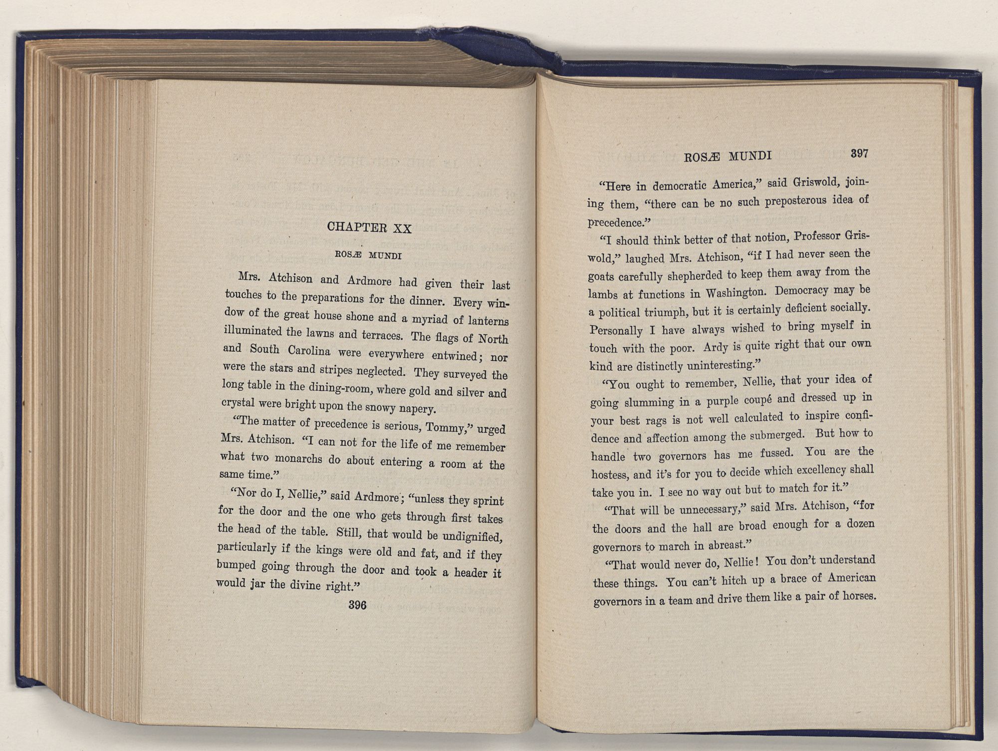 “You said about the same thing when we talked of Thibet that first evening we met at the University Club, and now the Grand Lama sings in all the phonographs, and for a penny you can see him in a kinetoscope, eating his luncheon. I remember very well that night. We were facing each other at a writing-table, and you looked up timidly from your letter and asked me whether there were two g's in aggravate, and I answered that it depended on the meaning—one g for a mild case, two for a severe one—and you laughed, and we began talking. Then we found out how lonesome we both were, and you asked me to dinner, and then took me to that big house of yours up there in Fifth Avenue and showed me the pictures in your art gallery, and we found out that we needed each other.”