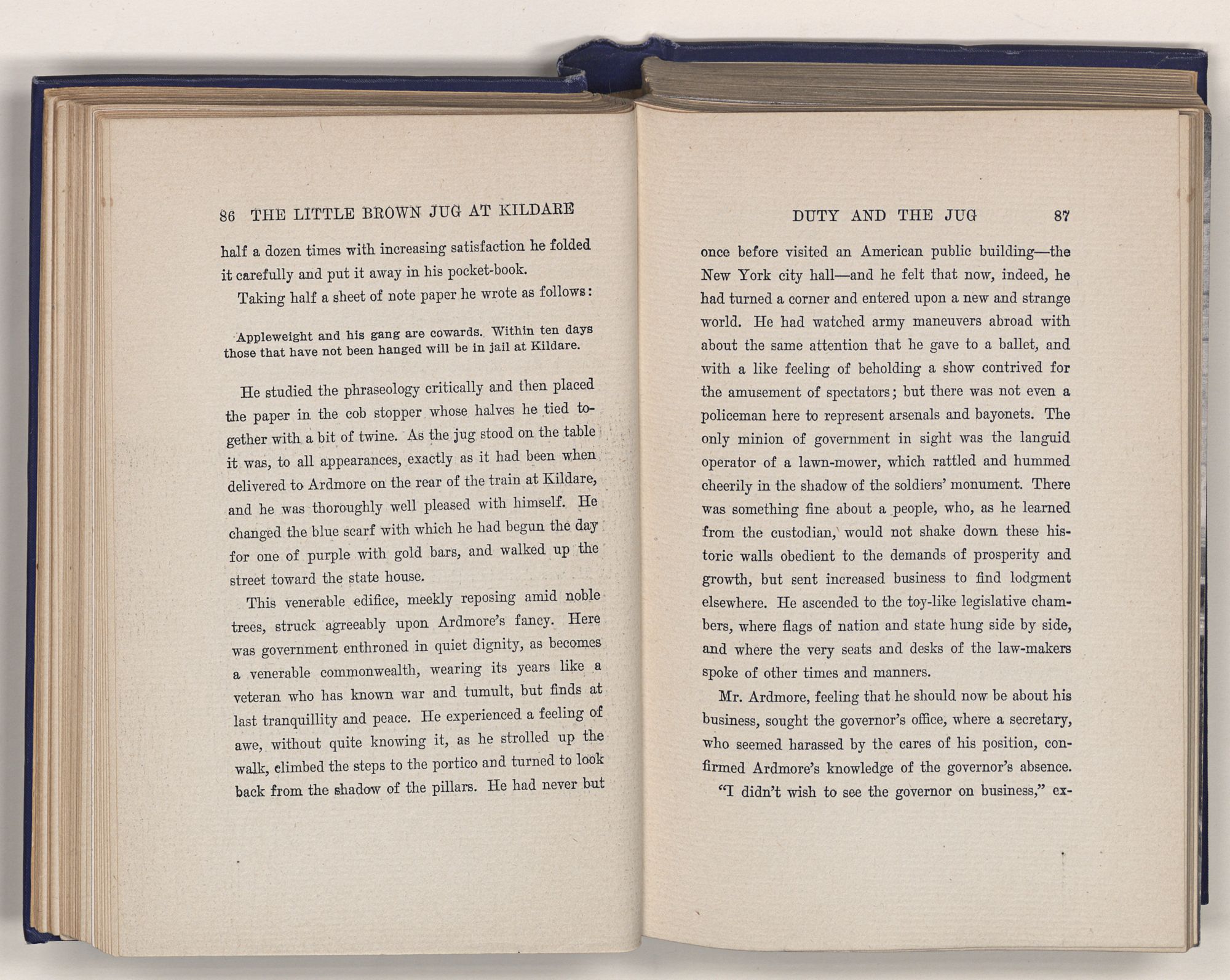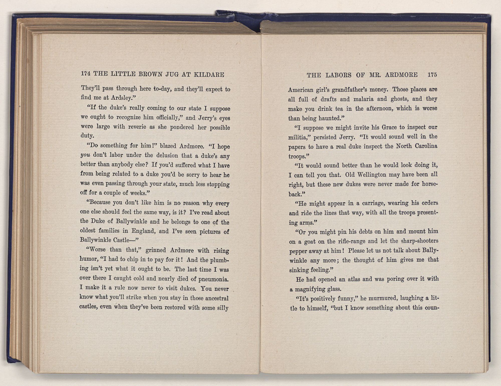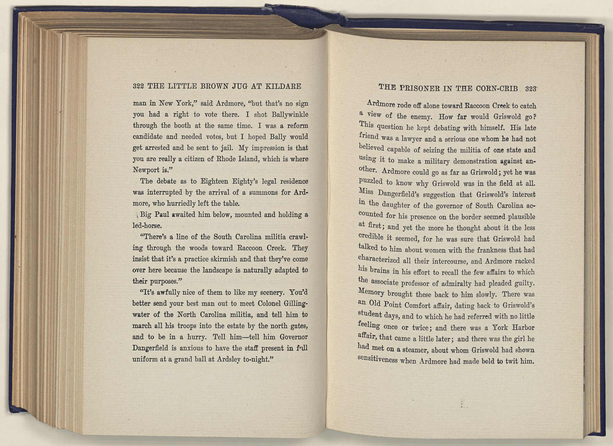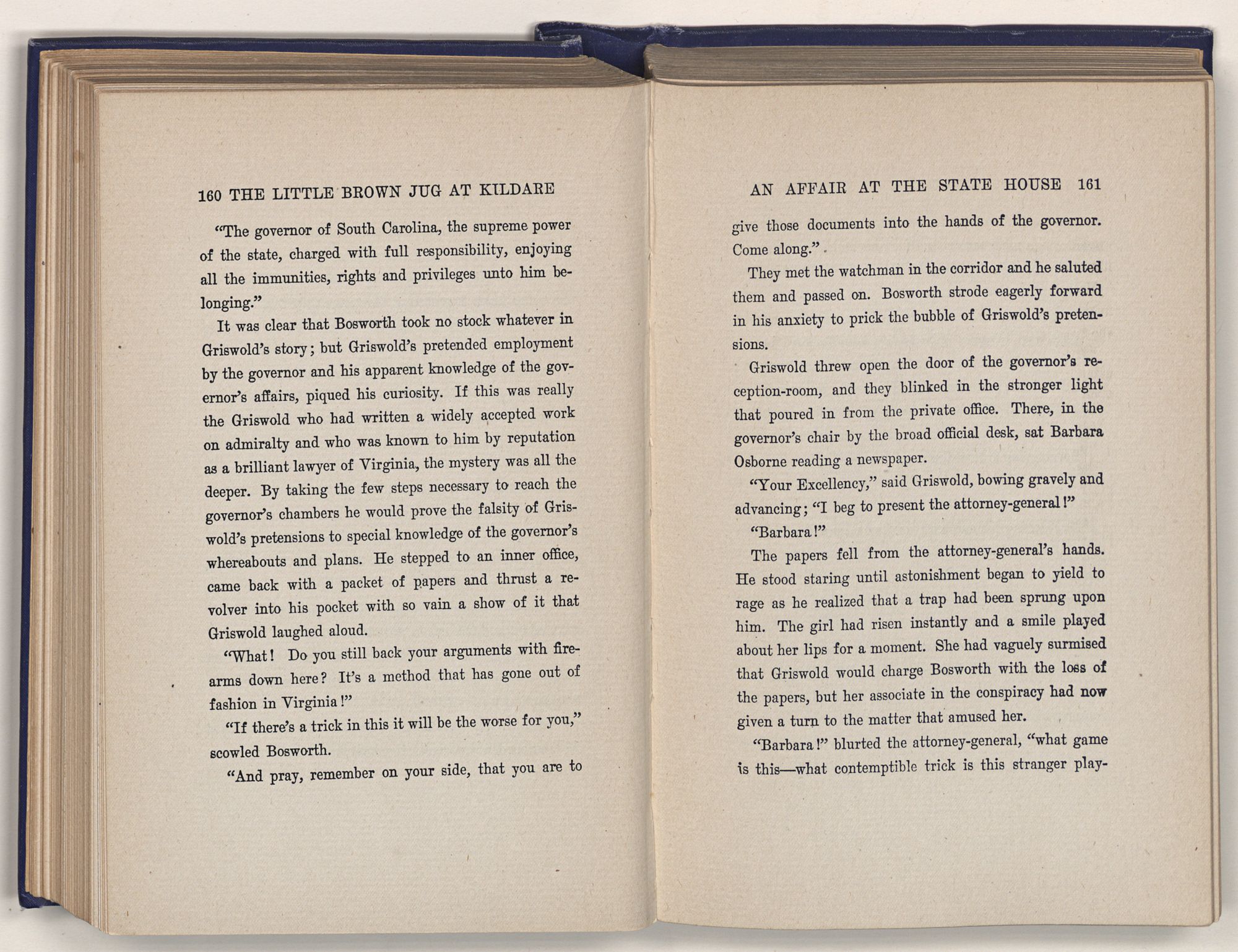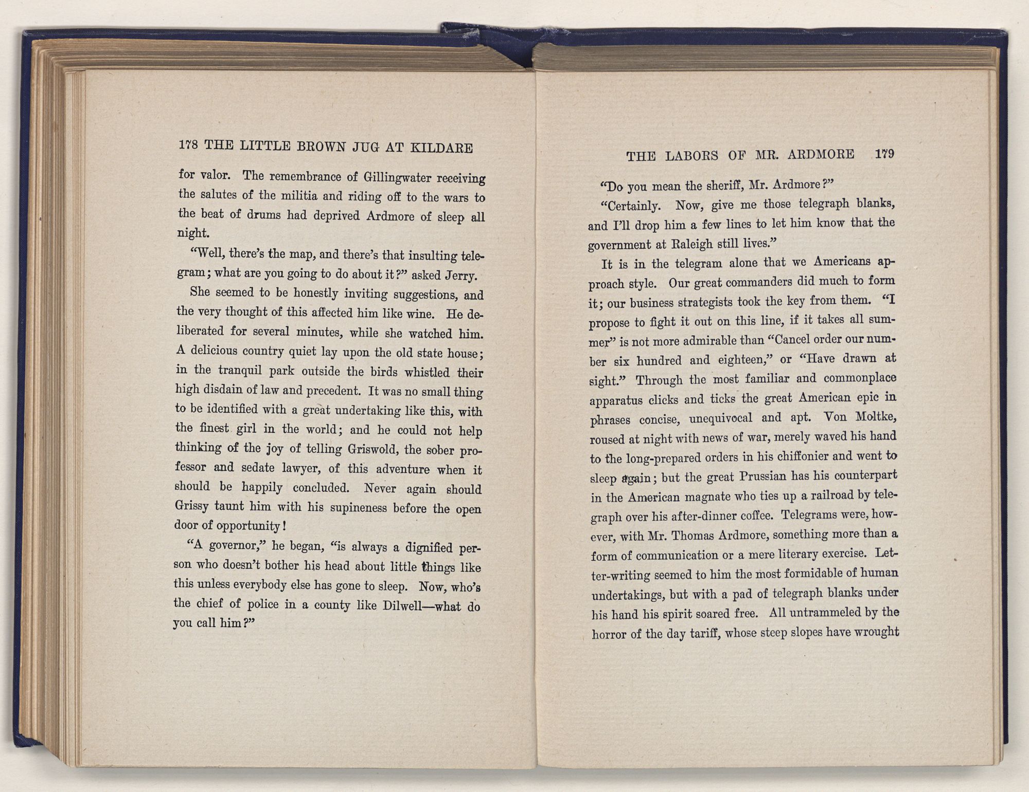 Both governors had at almost the same moment turned down their glasses. It even seemed that they had been drilled in the part, so dexterous were they in reversing them, so nimbly did they put from them the hope of wine. The members of the house-party noted this act of the two governors with well-bred surprise; and Ardmore was grieved, feeling that in some measure the illustrious guests were criticizing his hospitality. The butler at this moment spoke to him, and much relieved he smiled and nodded. A moment later two jugs, two little brown jugs, were carried in, and one was placed quietly in front of each governor at precisely the same moment. Expectation was instantly a-tiptoe.