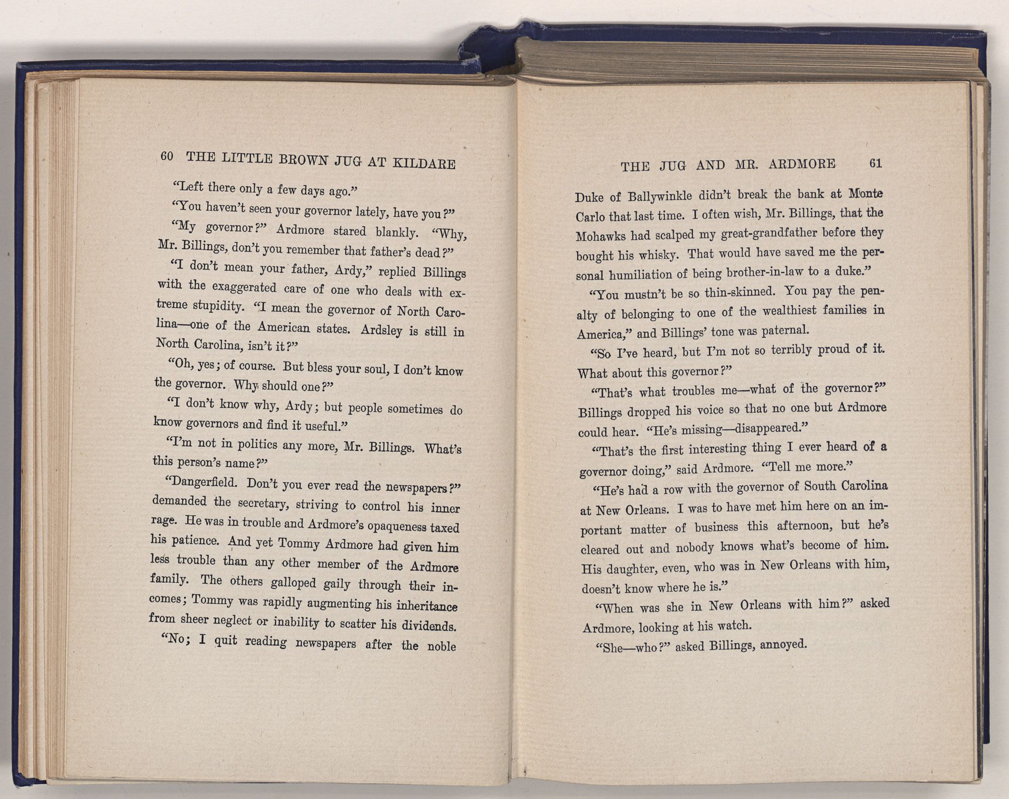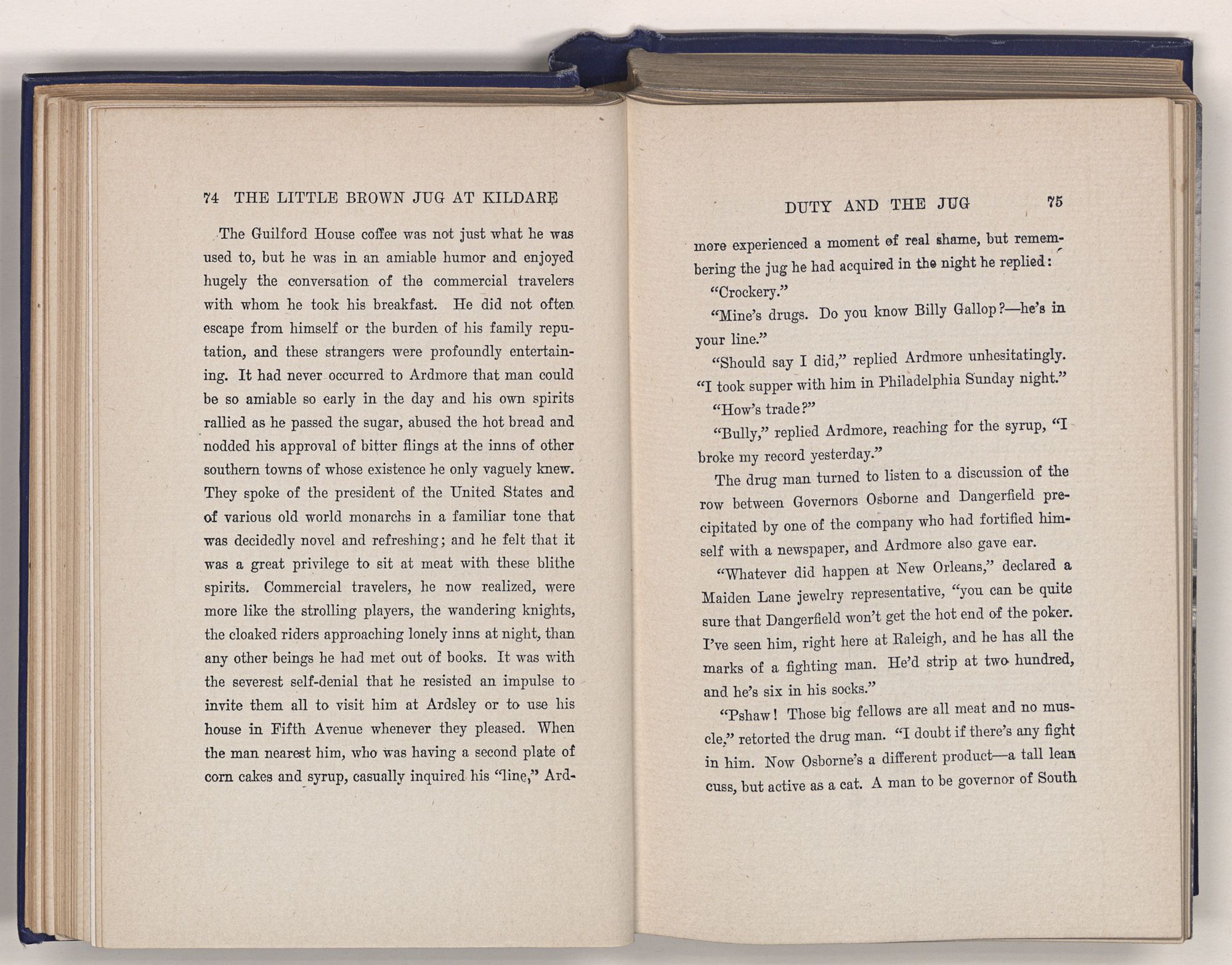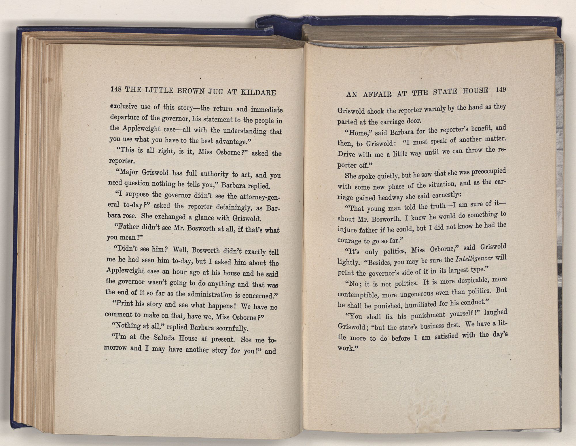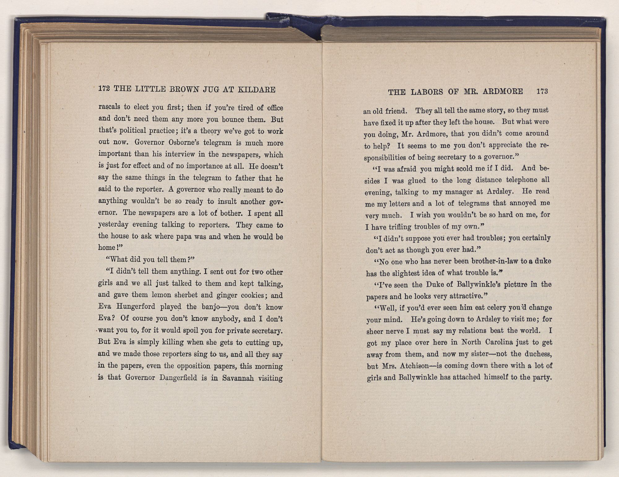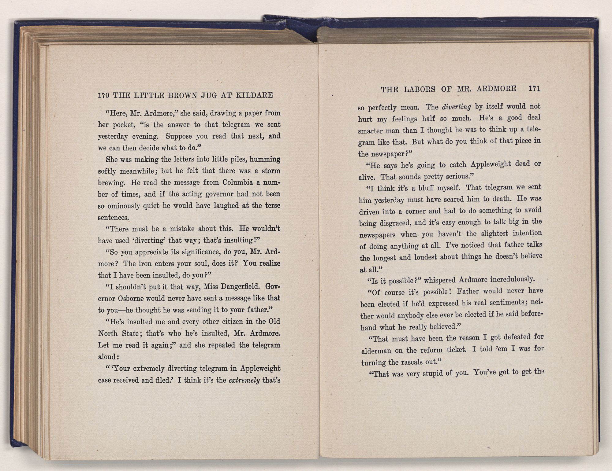 Both governors had at almost the same moment turned down their glasses. It even seemed that they had been drilled in the part, so dexterous were they in reversing them, so nimbly did they put from them the hope of wine. The members of the house-party noted this act of the two governors with well-bred surprise; and Ardmore was grieved, feeling that in some measure the illustrious guests were criticizing his hospitality. The butler at this moment spoke to him, and much relieved he smiled and nodded. A moment later two jugs, two little brown jugs, were carried in, and one was placed quietly in front of each governor at precisely the same moment. Expectation was instantly a-tiptoe.