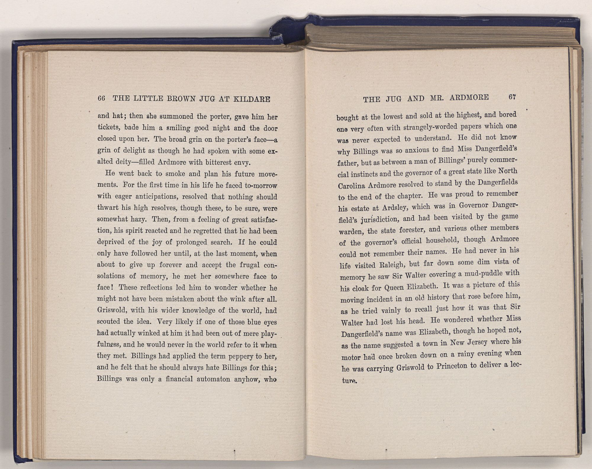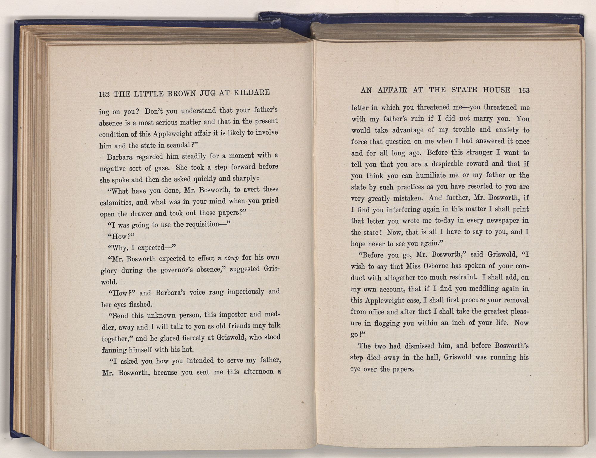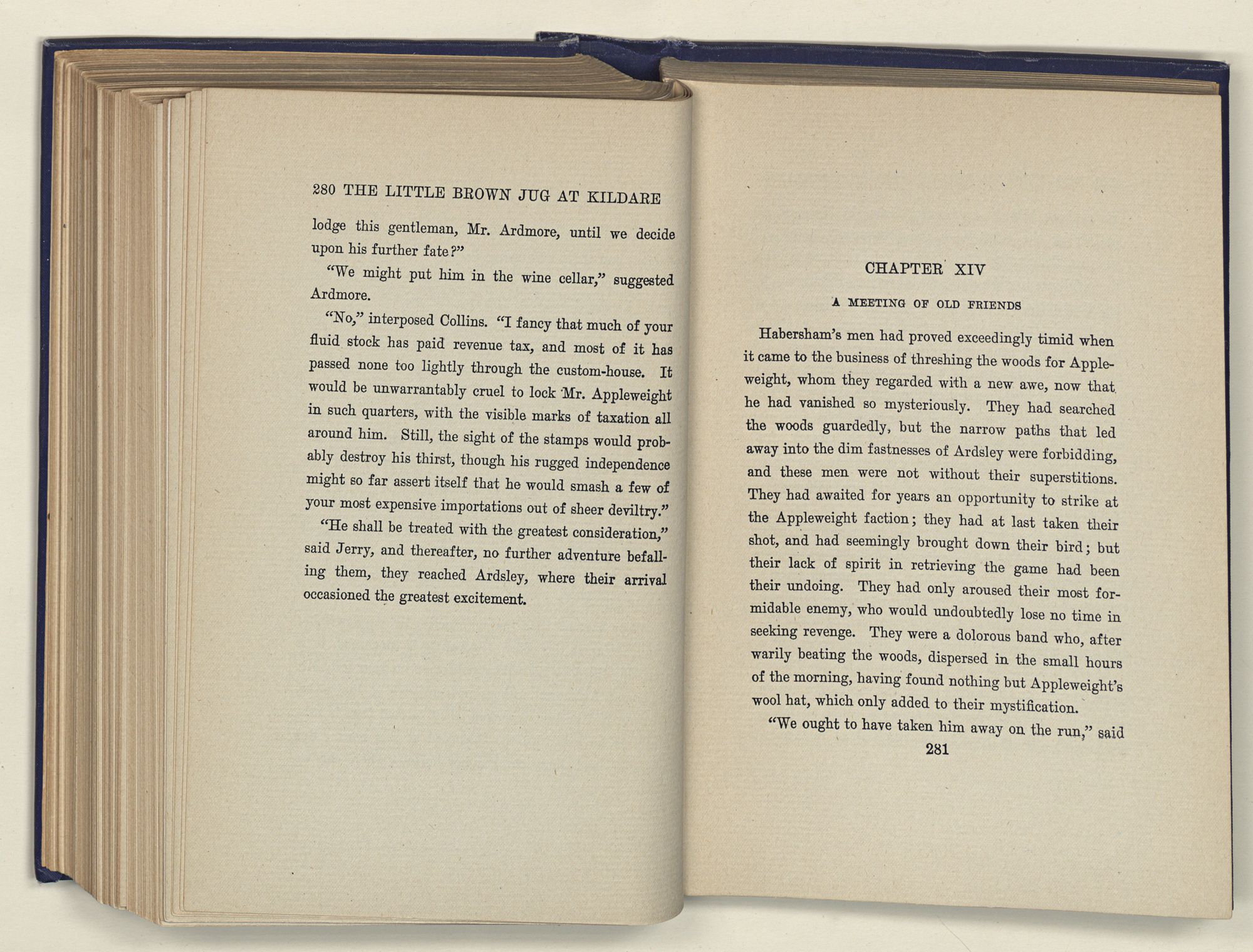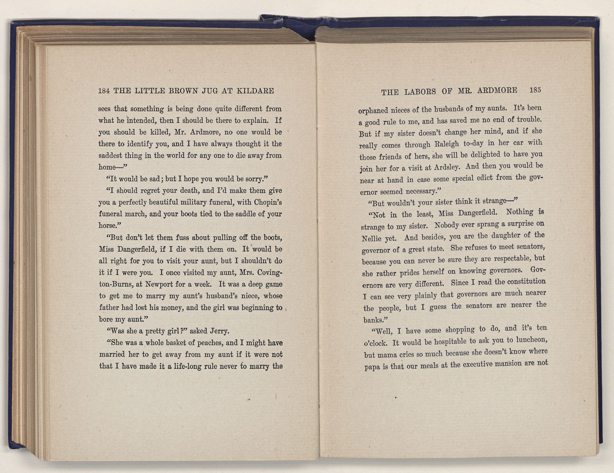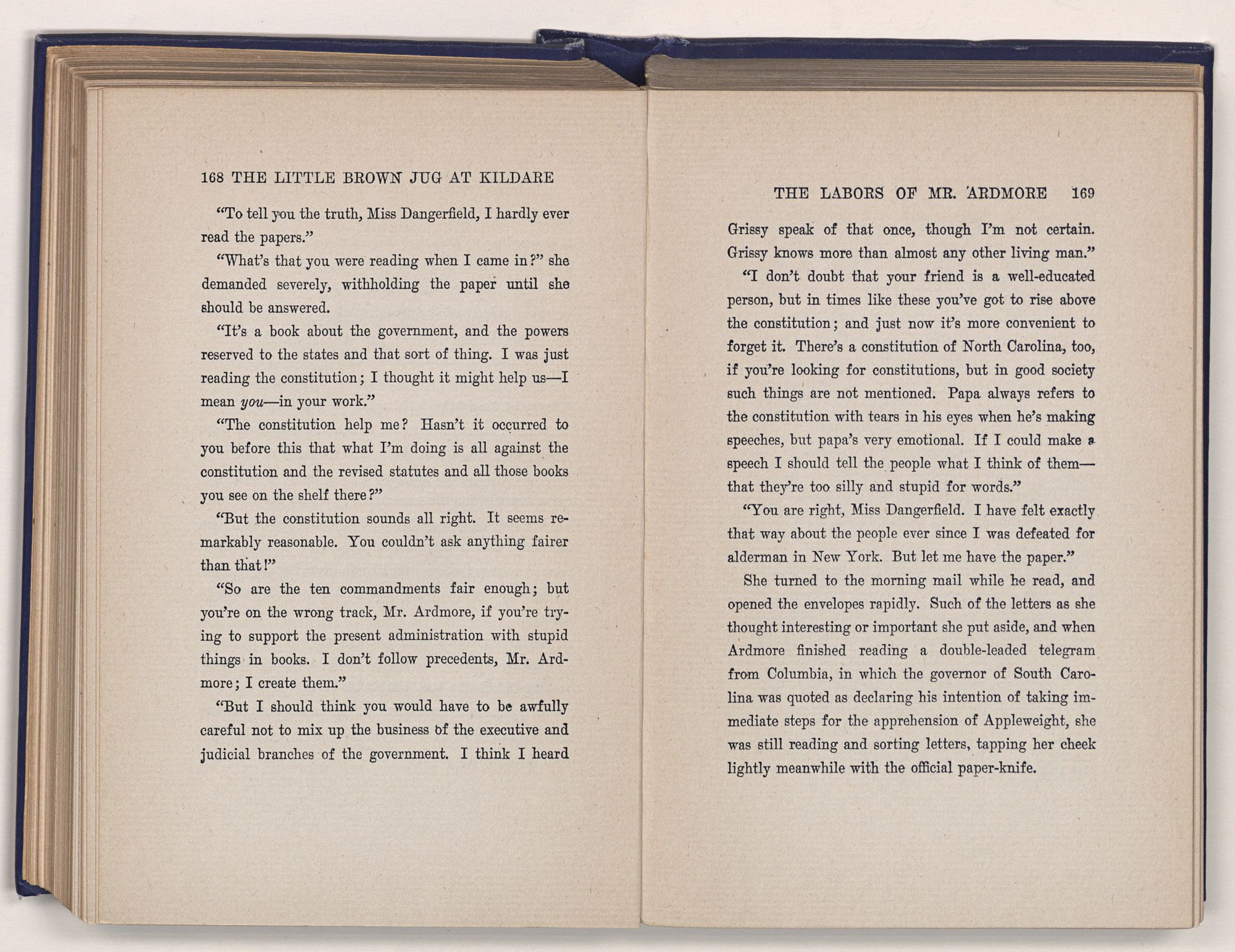 Both governors had at almost the same moment turned down their glasses. It even seemed that they had been drilled in the part, so dexterous were they in reversing them, so nimbly did they put from them the hope of wine. The members of the house-party noted this act of the two governors with well-bred surprise; and Ardmore was grieved, feeling that in some measure the illustrious guests were criticizing his hospitality. The butler at this moment spoke to him, and much relieved he smiled and nodded. A moment later two jugs, two little brown jugs, were carried in, and one was placed quietly in front of each governor at precisely the same moment. Expectation was instantly a-tiptoe.