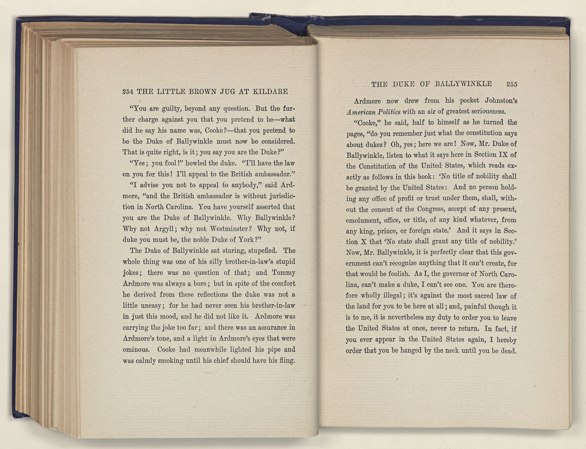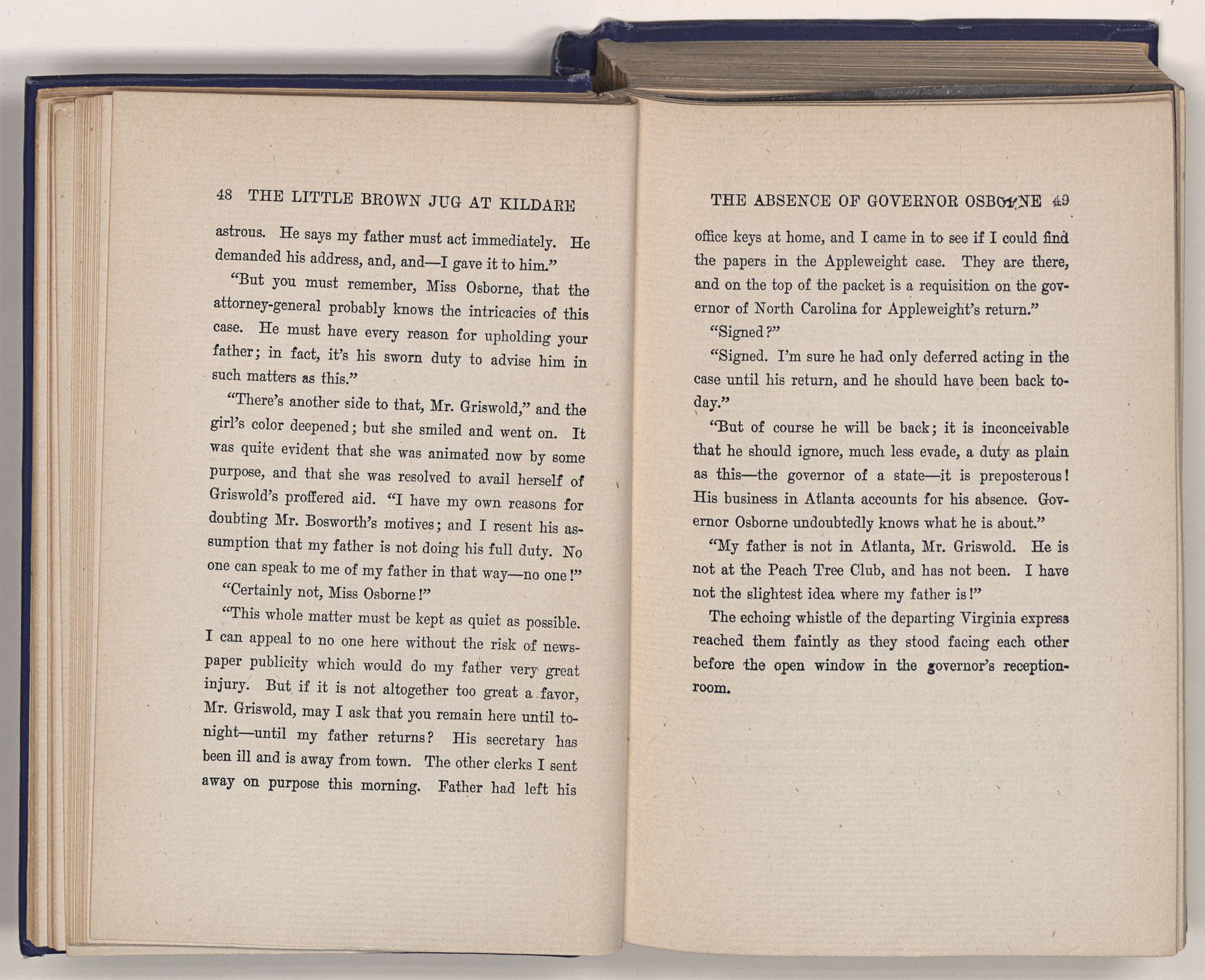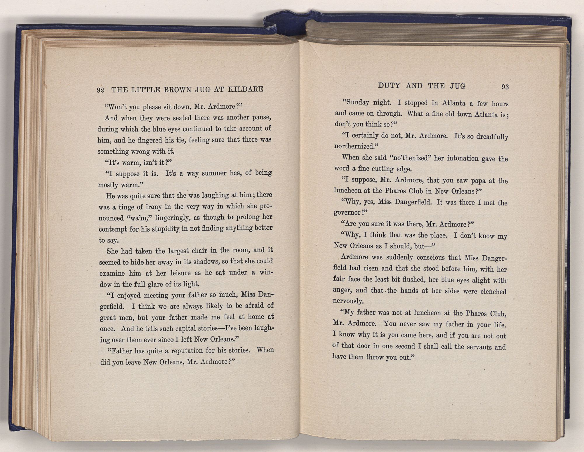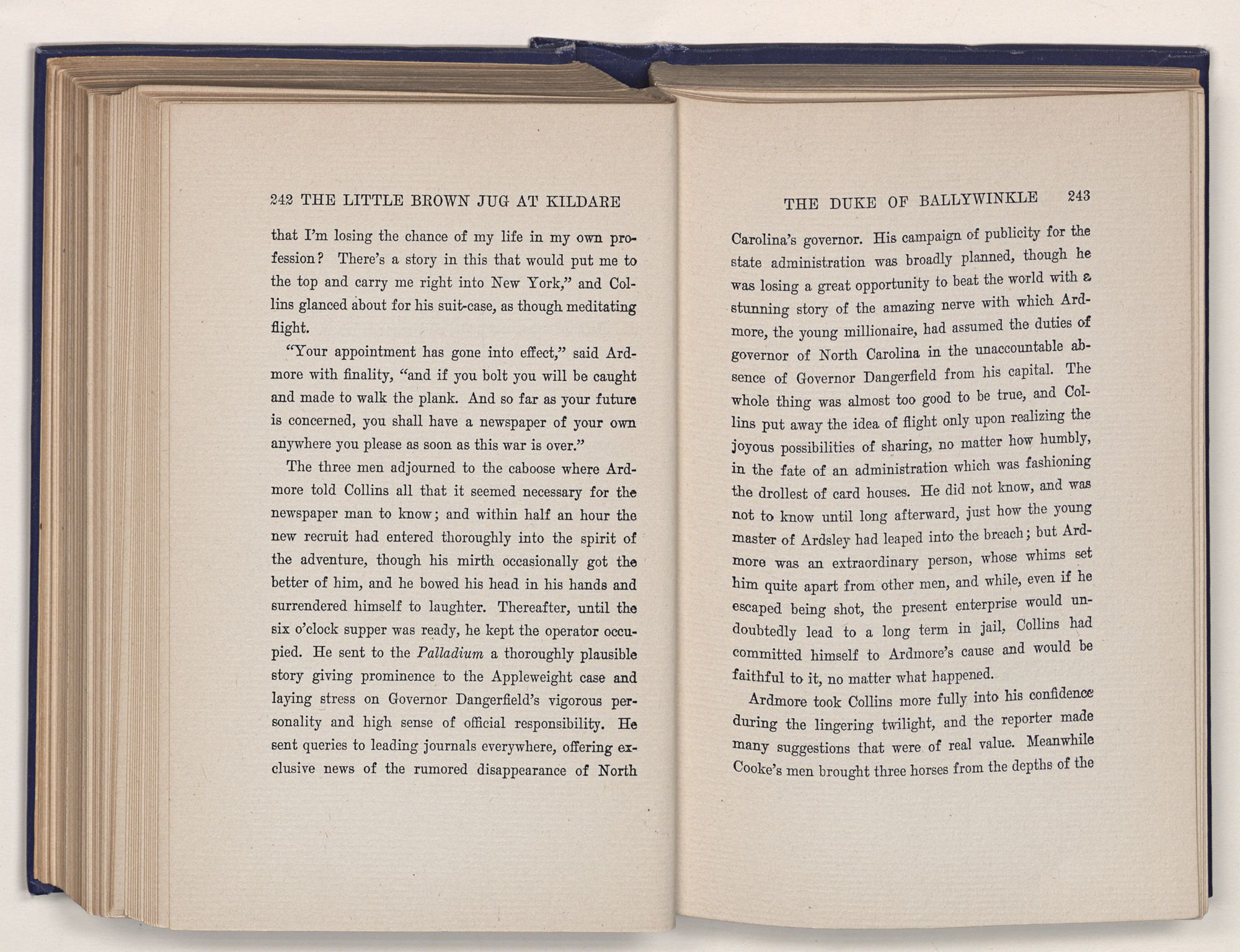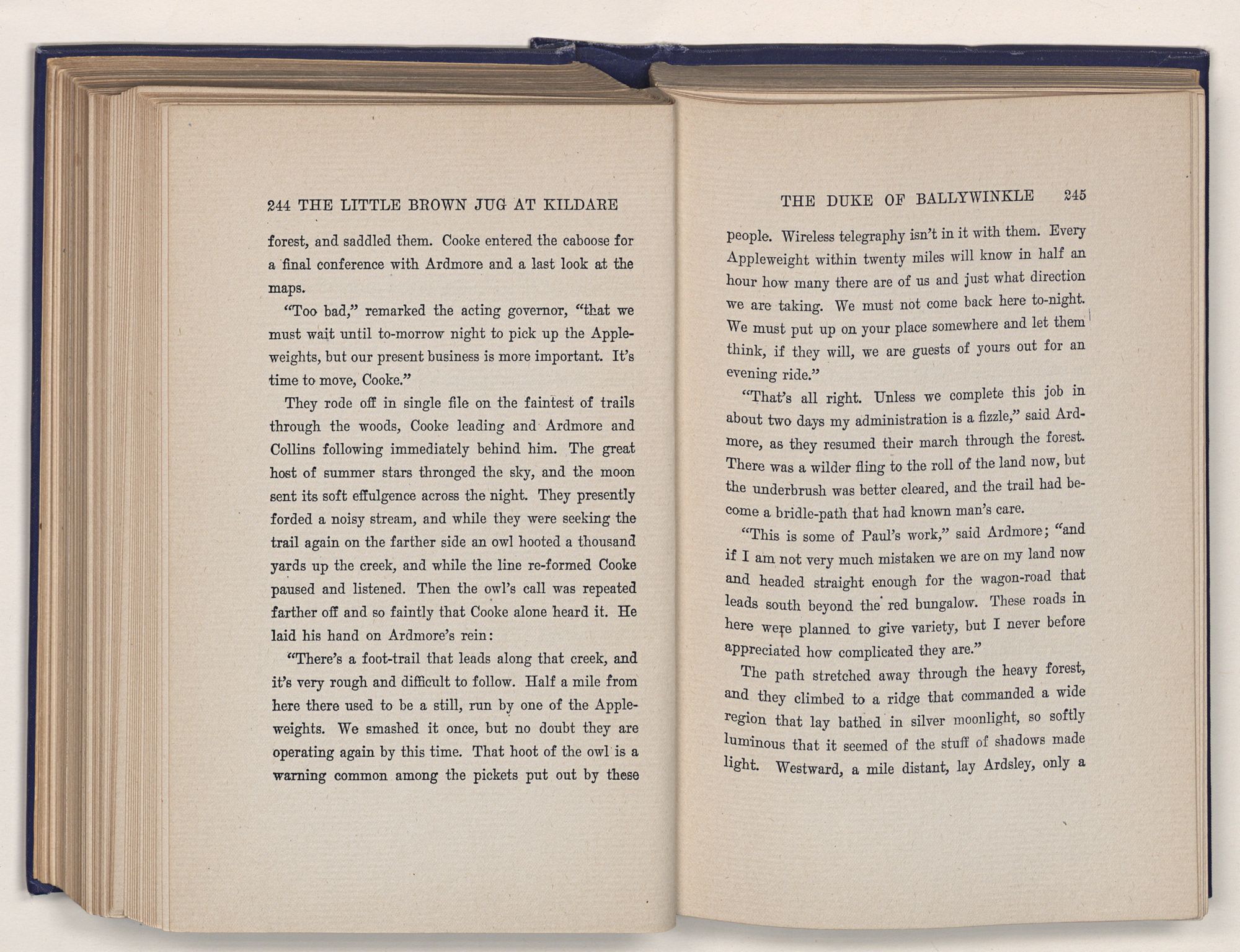 Both governors had at almost the same moment turned down their glasses. It even seemed that they had been drilled in the part, so dexterous were they in reversing them, so nimbly did they put from them the hope of wine. The members of the house-party noted this act of the two governors with well-bred surprise; and Ardmore was grieved, feeling that in some measure the illustrious guests were criticizing his hospitality. The butler at this moment spoke to him, and much relieved he smiled and nodded. A moment later two jugs, two little brown jugs, were carried in, and one was placed quietly in front of each governor at precisely the same moment. Expectation was instantly a-tiptoe.