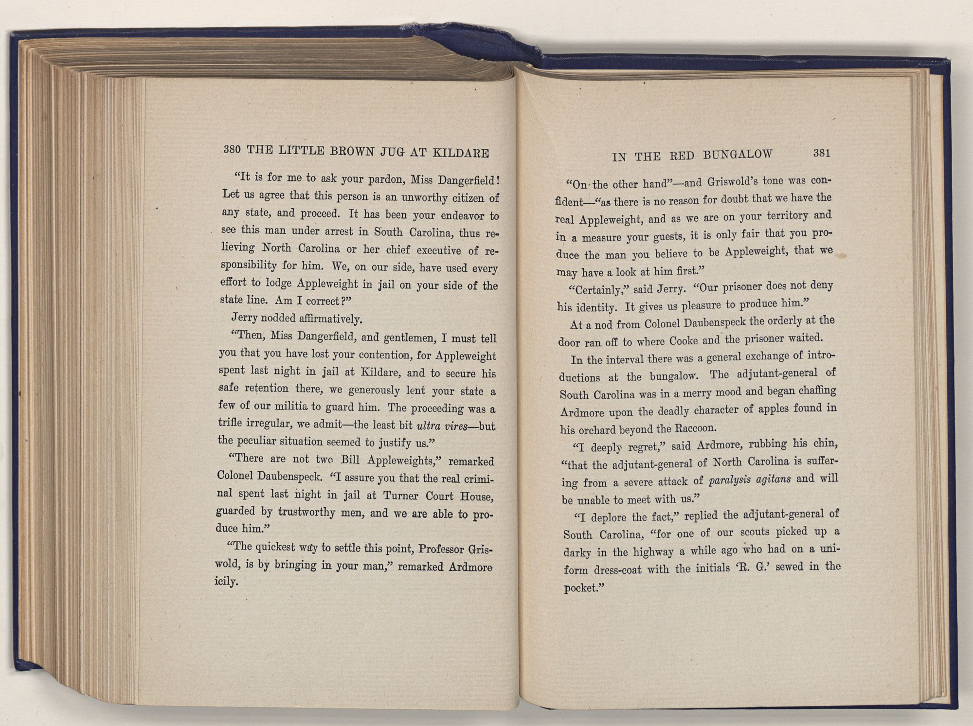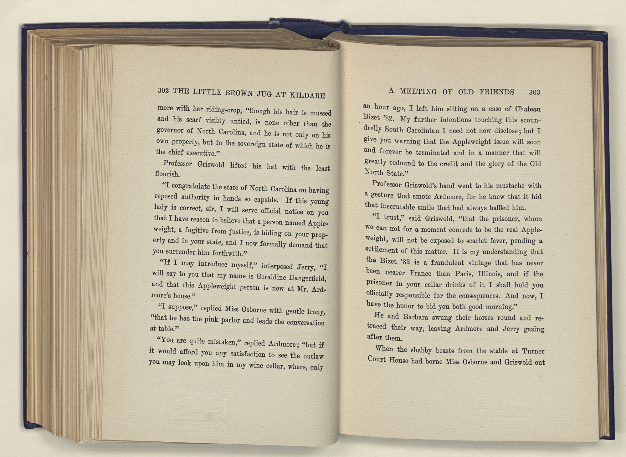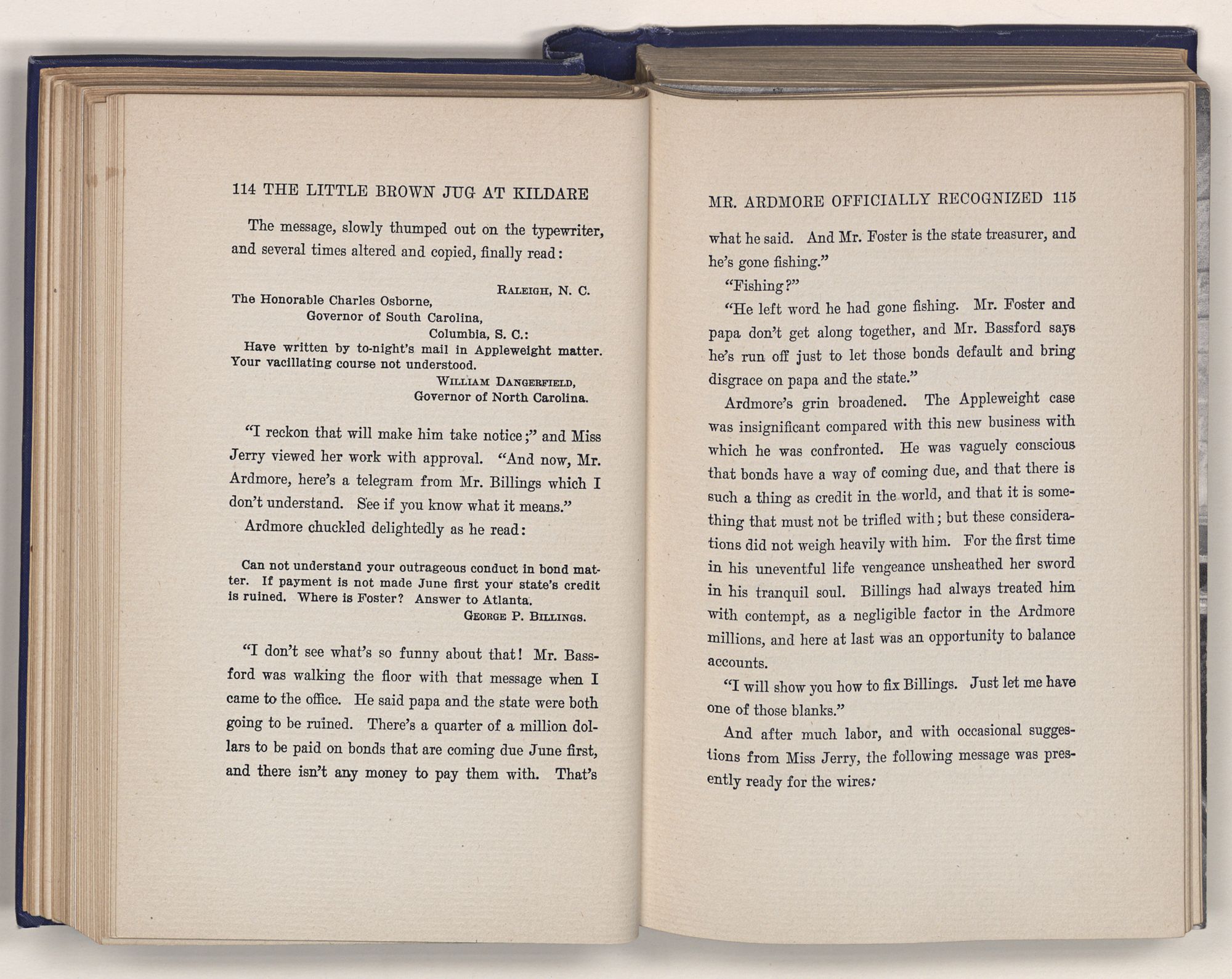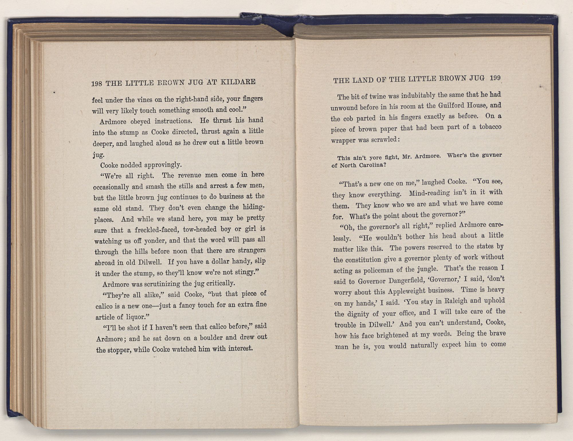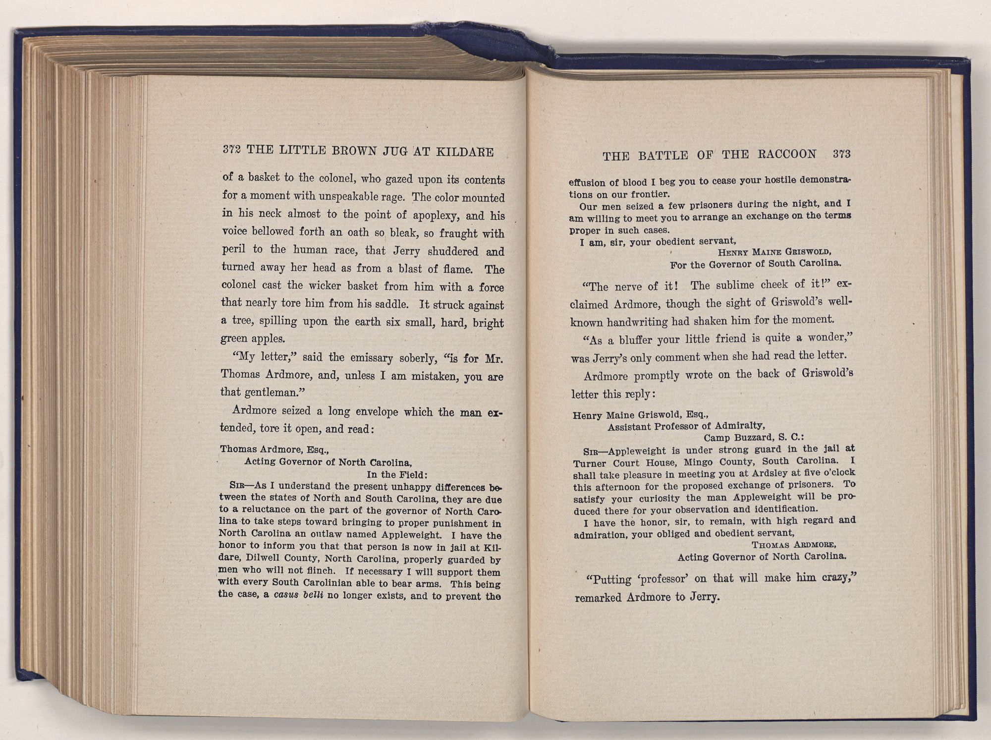“Gentlemen,” said Ardmore, addressing the governors, “these jugs have just been left at the house by our old friend, Mr. Bill Appleweight, alias Poteet, with his compliments, for the governors of the two greatest states in the Union. I note that there's a bit of pink calico around the stopper of Governor Dangerfield's jug, while Governor Osborne's is garnished with blue and white gingham.”