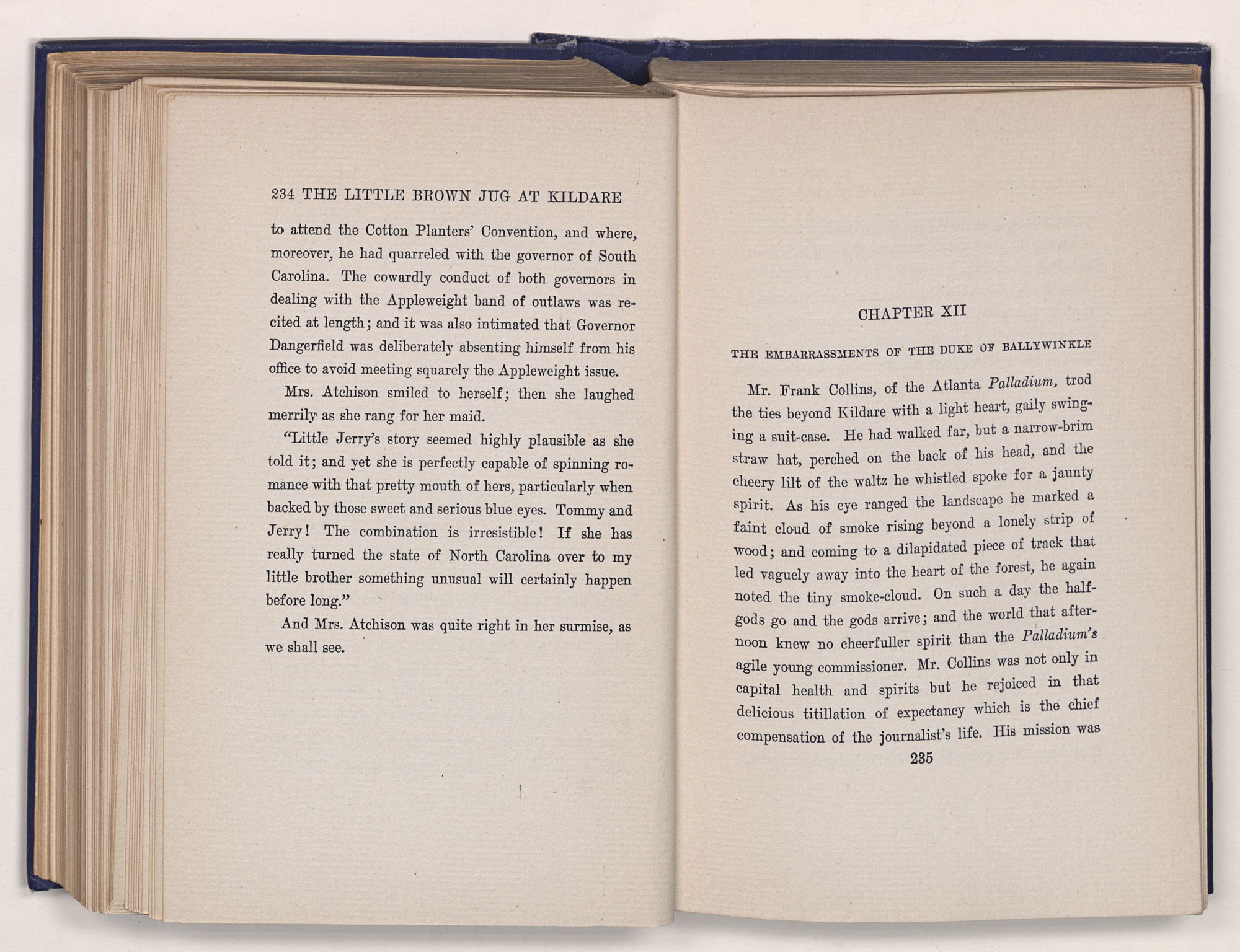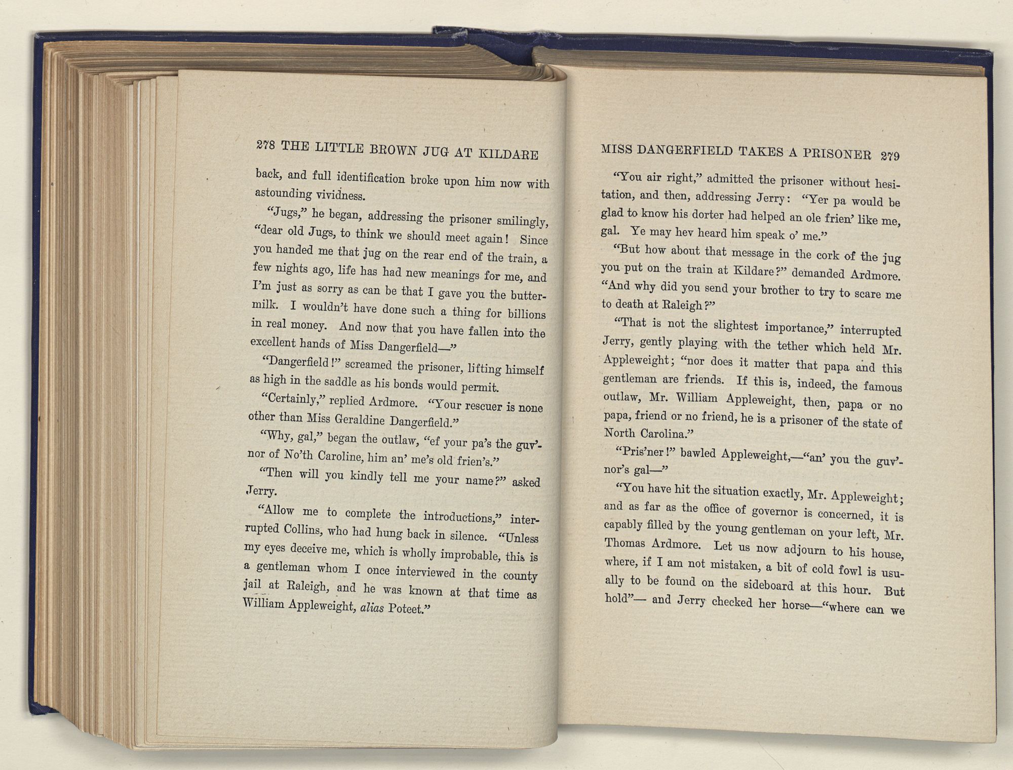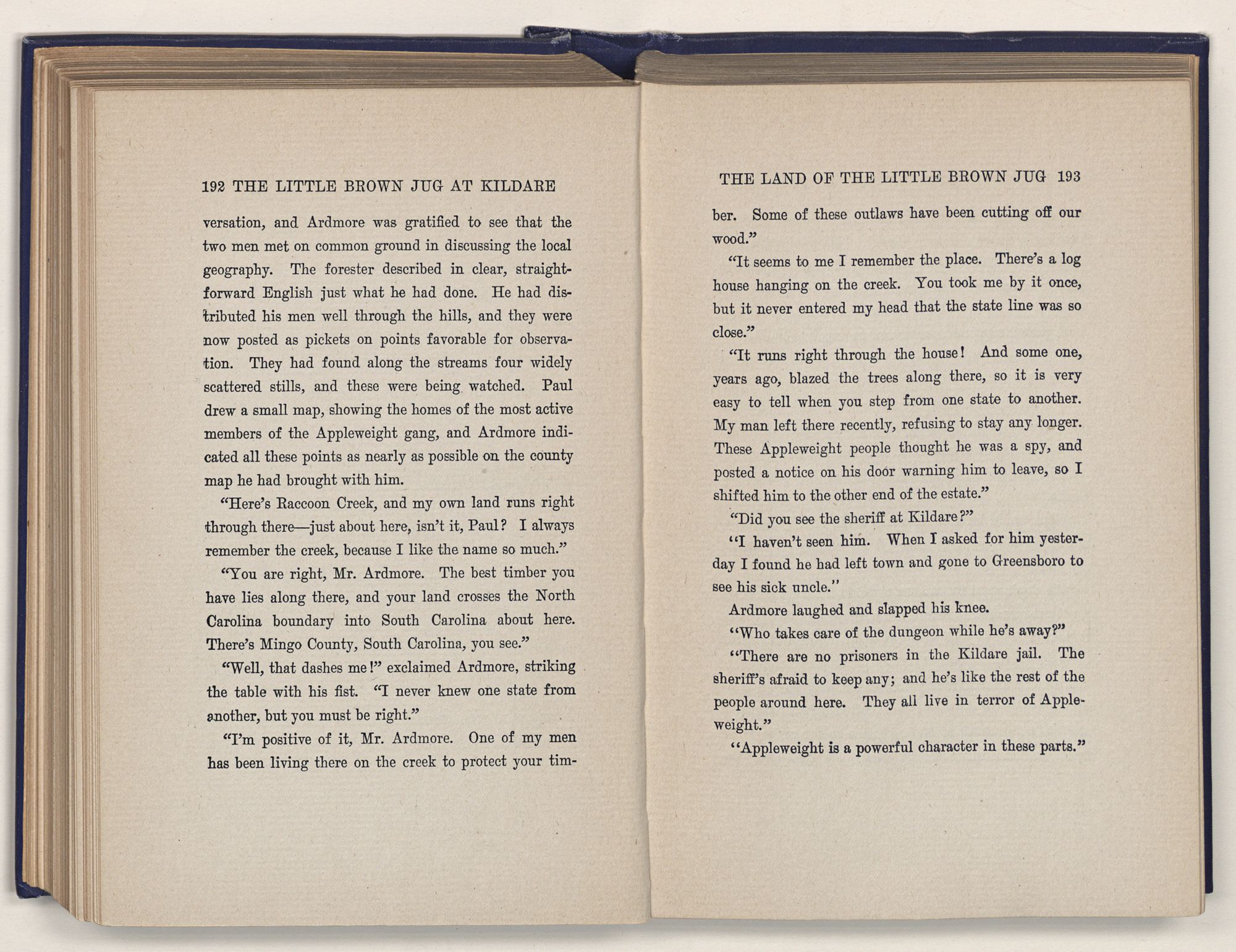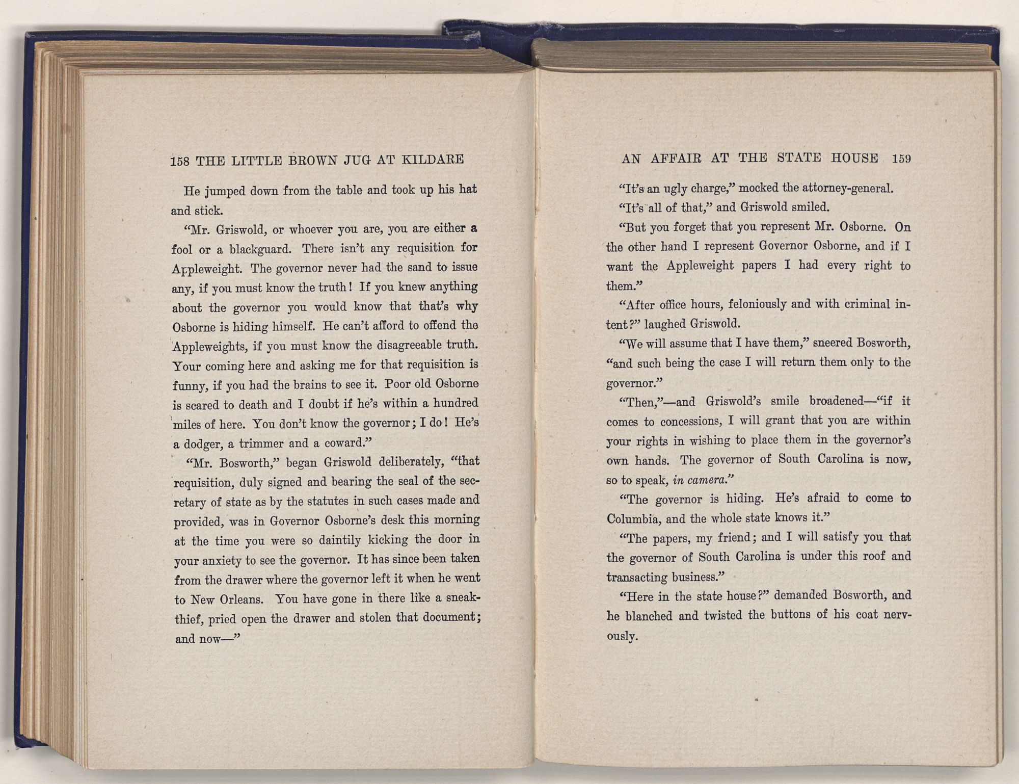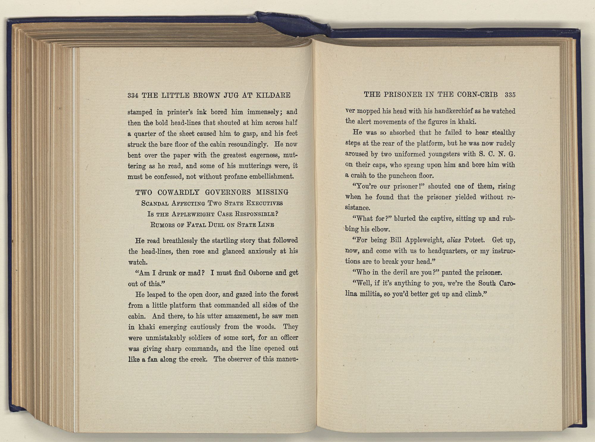 “Gentlemen,” said Ardmore, addressing the governors, “these jugs have just been left at the house by our old friend, Mr. Bill Appleweight, alias Poteet, with his compliments, for the governors of the two greatest states in the Union. I note that there's a bit of pink calico around the stopper of Governor Dangerfield's jug, while Governor Osborne's is garnished with blue and white gingham.”