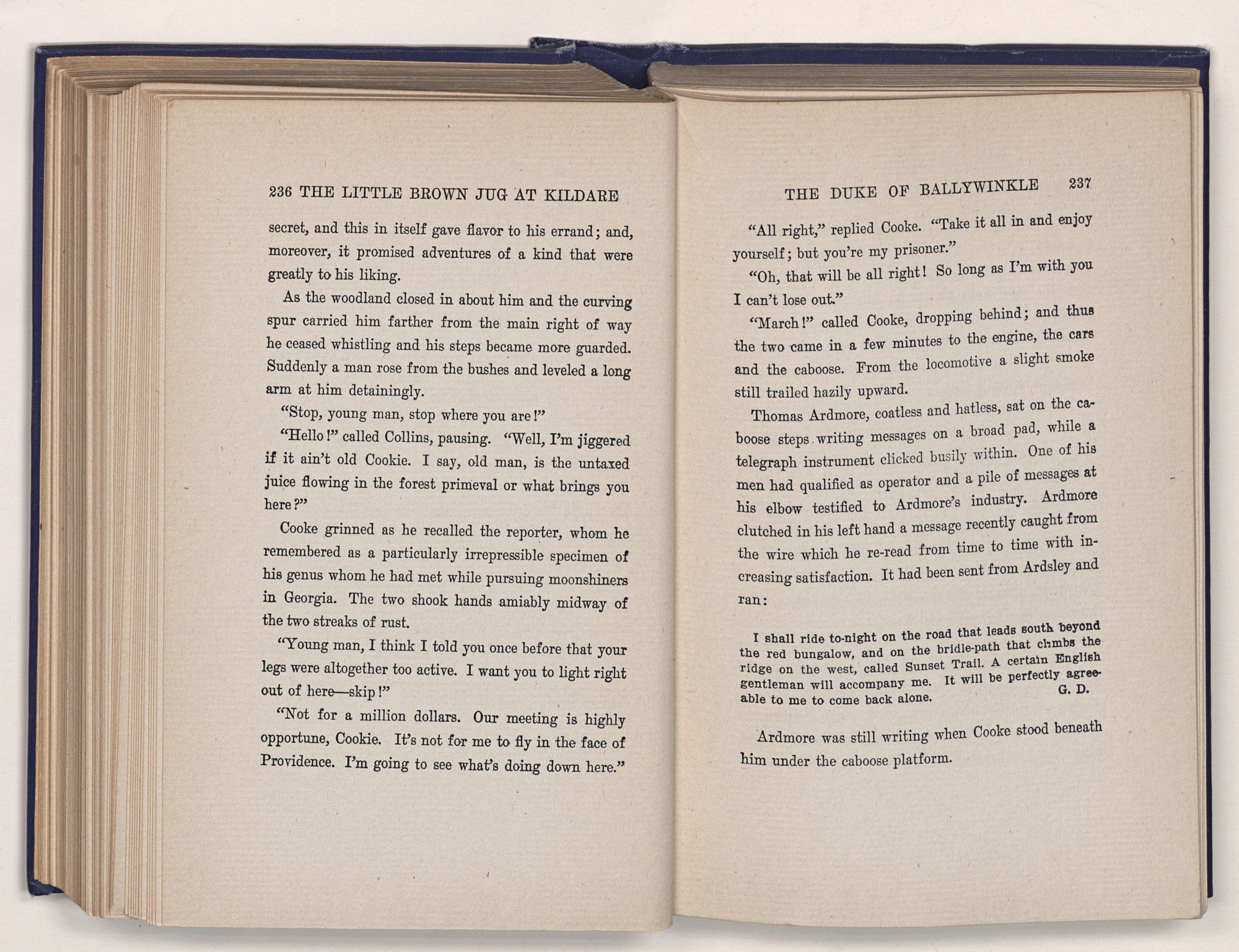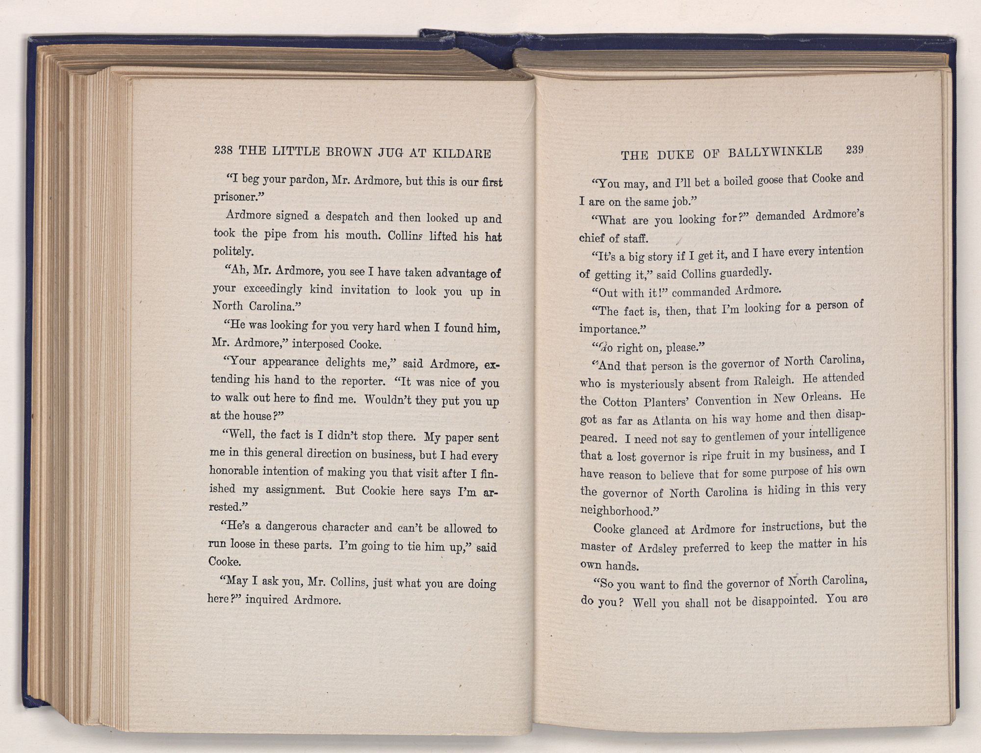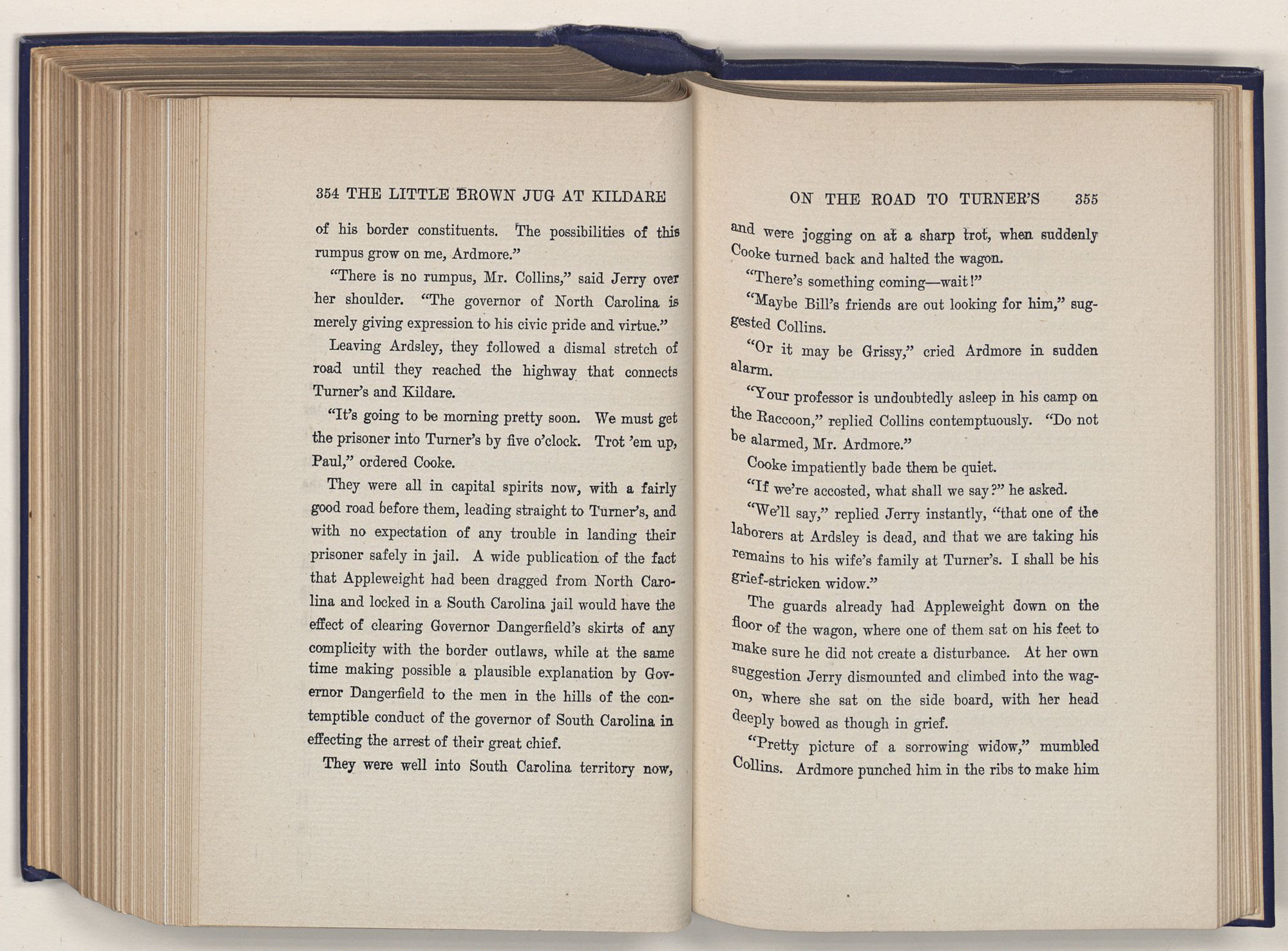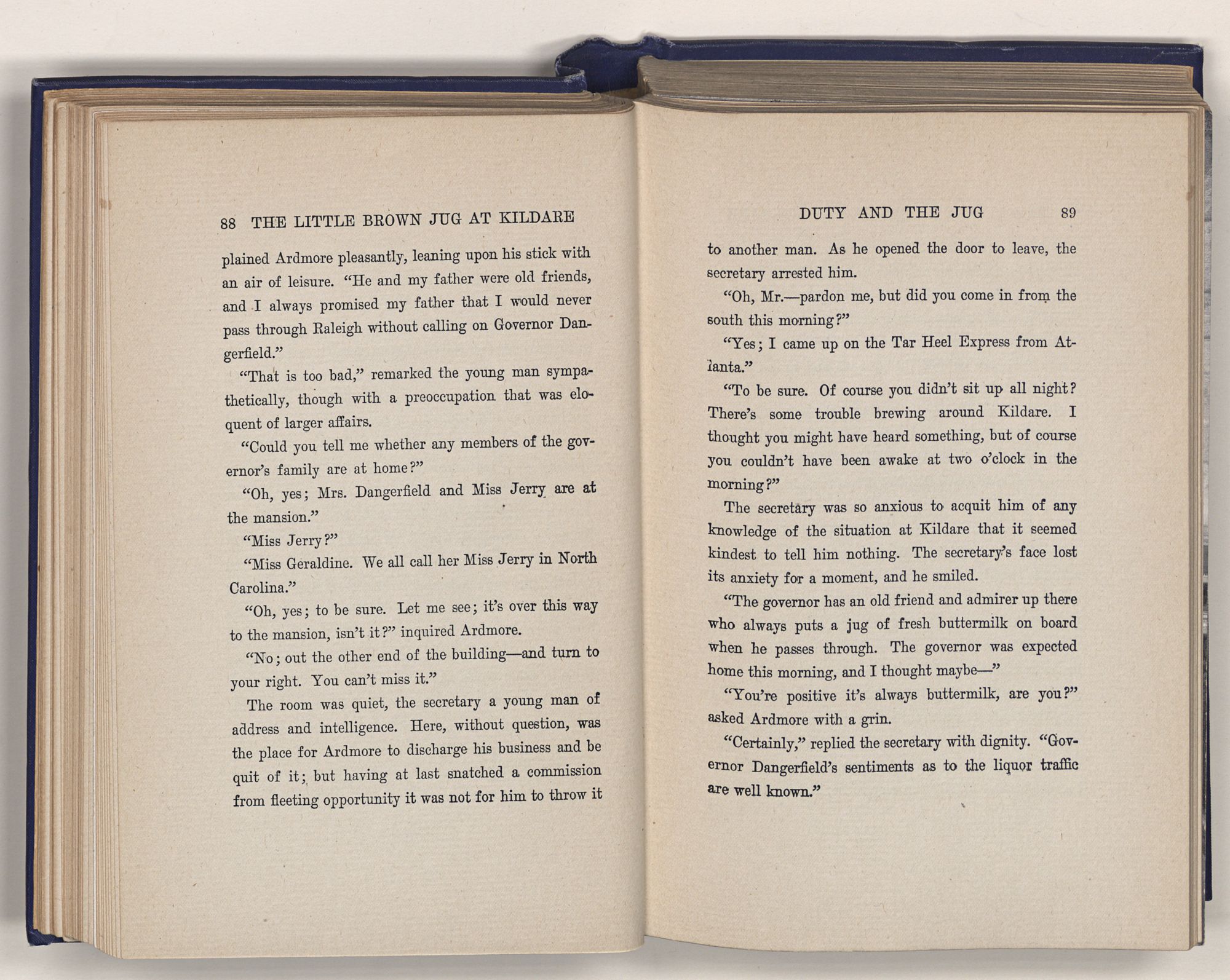 “Gentlemen,” said Ardmore, addressing the governors, “these jugs have just been left at the house by our old friend, Mr. Bill Appleweight, alias Poteet, with his compliments, for the governors of the two greatest states in the Union. I note that there's a bit of pink calico around the stopper of Governor Dangerfield's jug, while Governor Osborne's is garnished with blue and white gingham.”