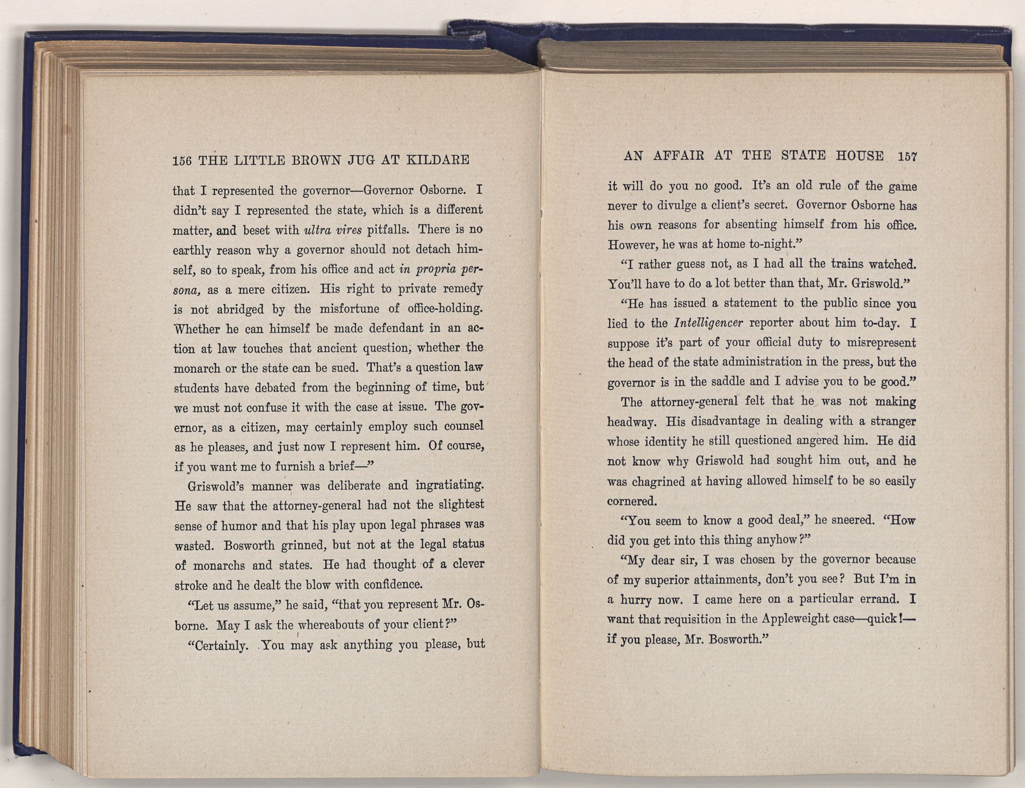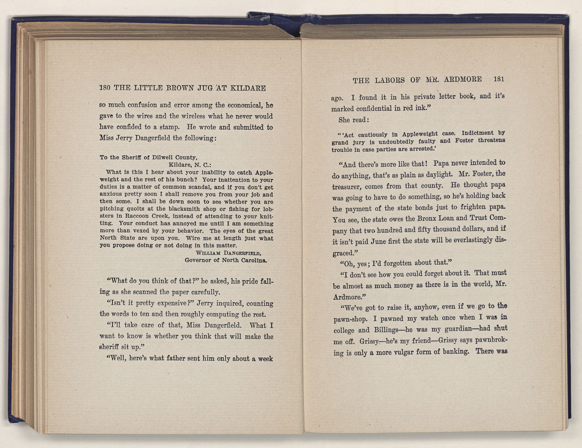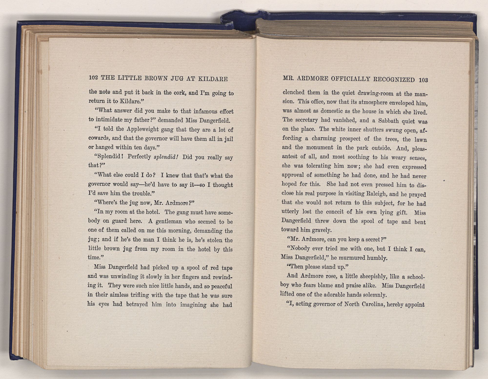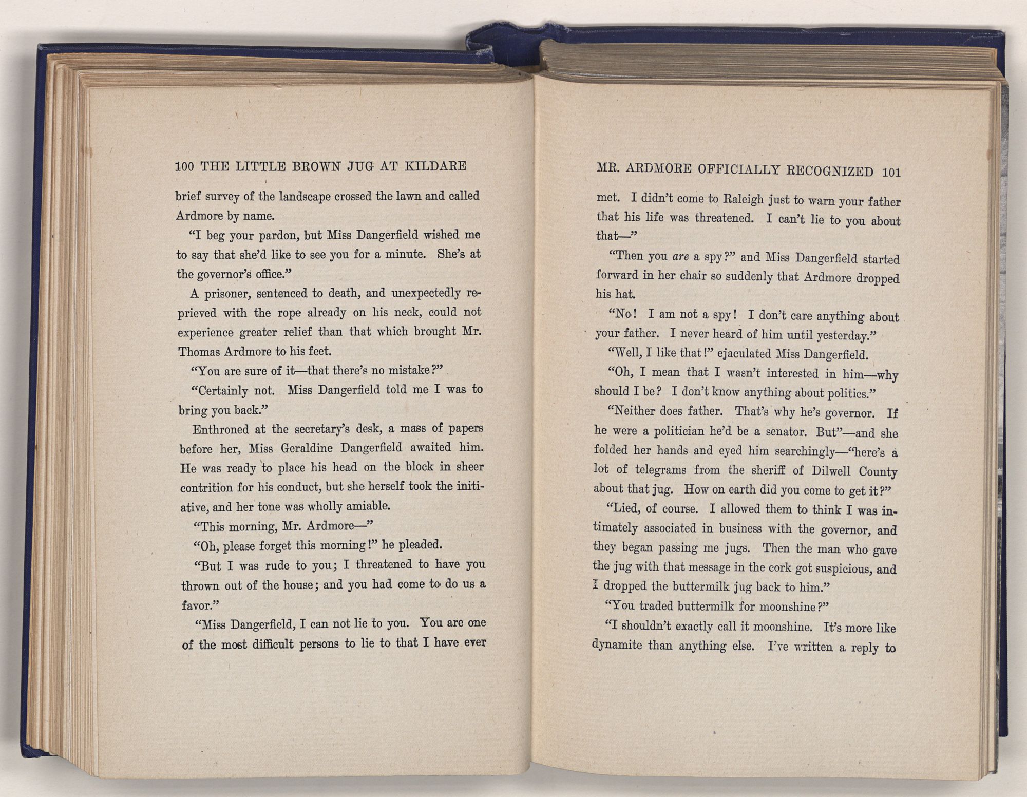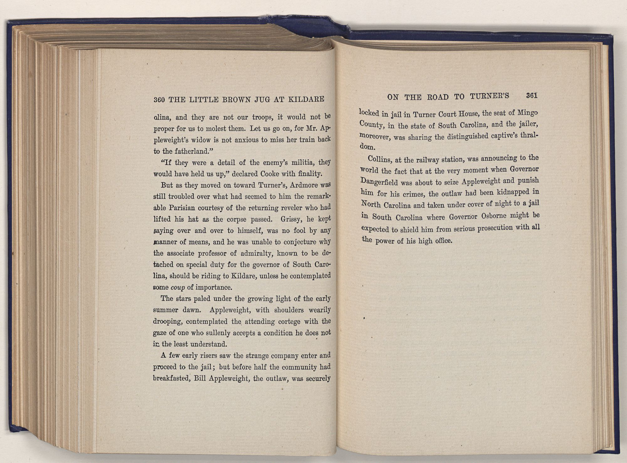 “Gentlemen,” said Ardmore, addressing the governors, “these jugs have just been left at the house by our old friend, Mr. Bill Appleweight, alias Poteet, with his compliments, for the governors of the two greatest states in the Union. I note that there's a bit of pink calico around the stopper of Governor Dangerfield's jug, while Governor Osborne's is garnished with blue and white gingham.”