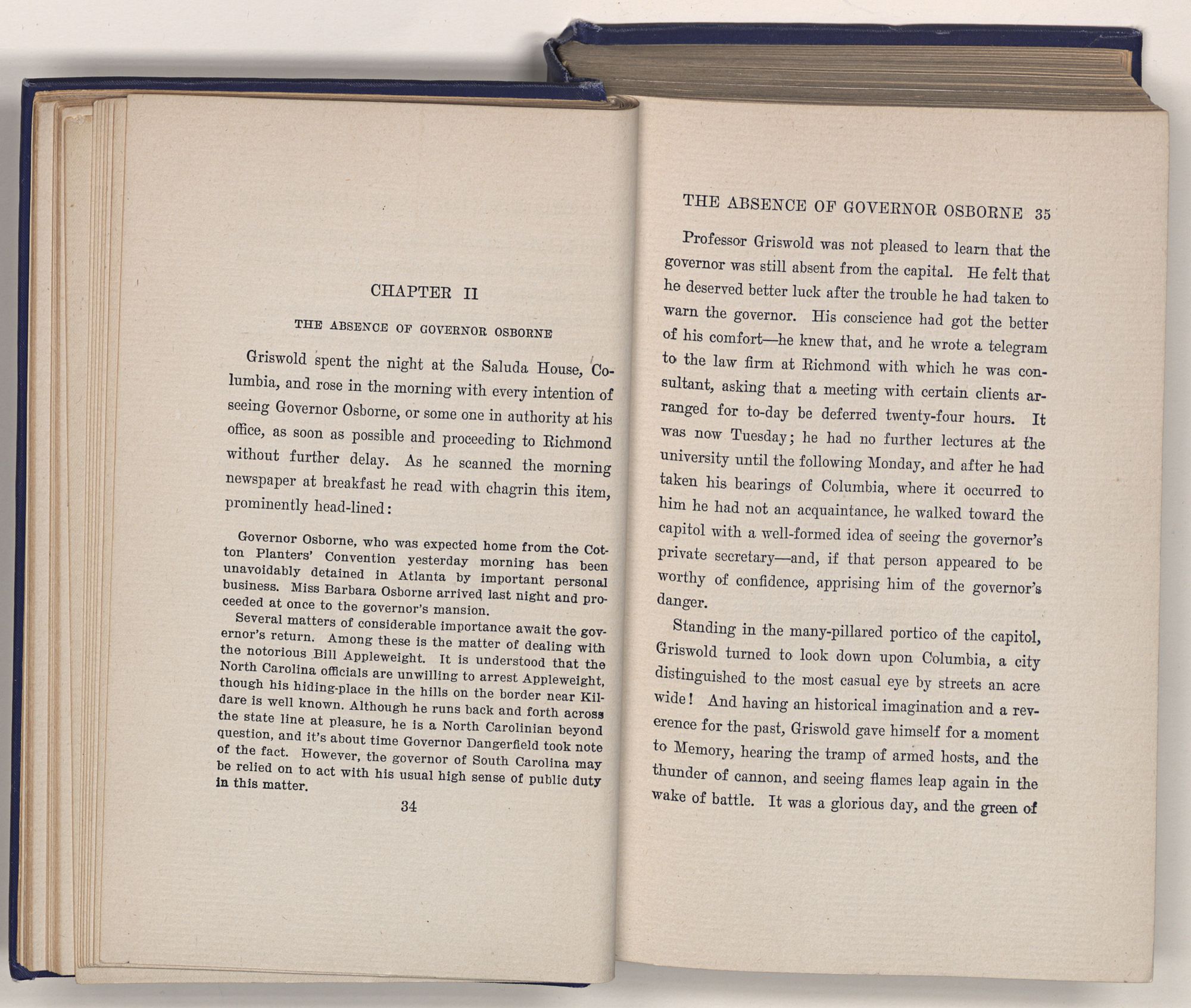 “Then,” said Mrs. Atchison, “there is only one possible solution. When the rest of us have entered the dining-room and taken our places, a bugle will sound; the governor of North Carolina shall enter from the north door; the governor of South Carolina from the south door, and advance to seats facing each other midway of the table. Professor Griswold, you are an old friend of the family, and you shall yourself take me in to dinner.”