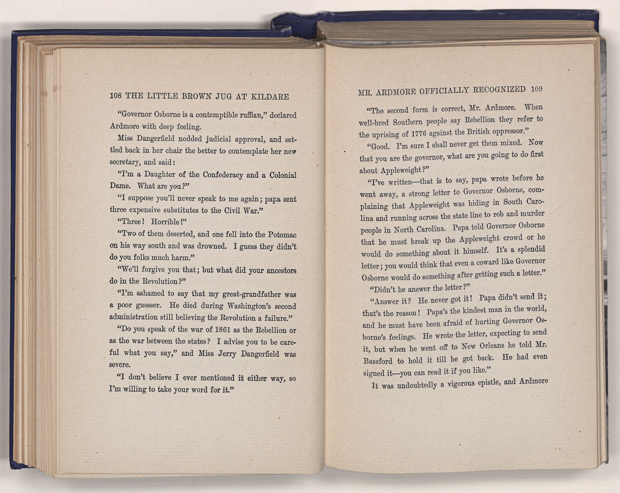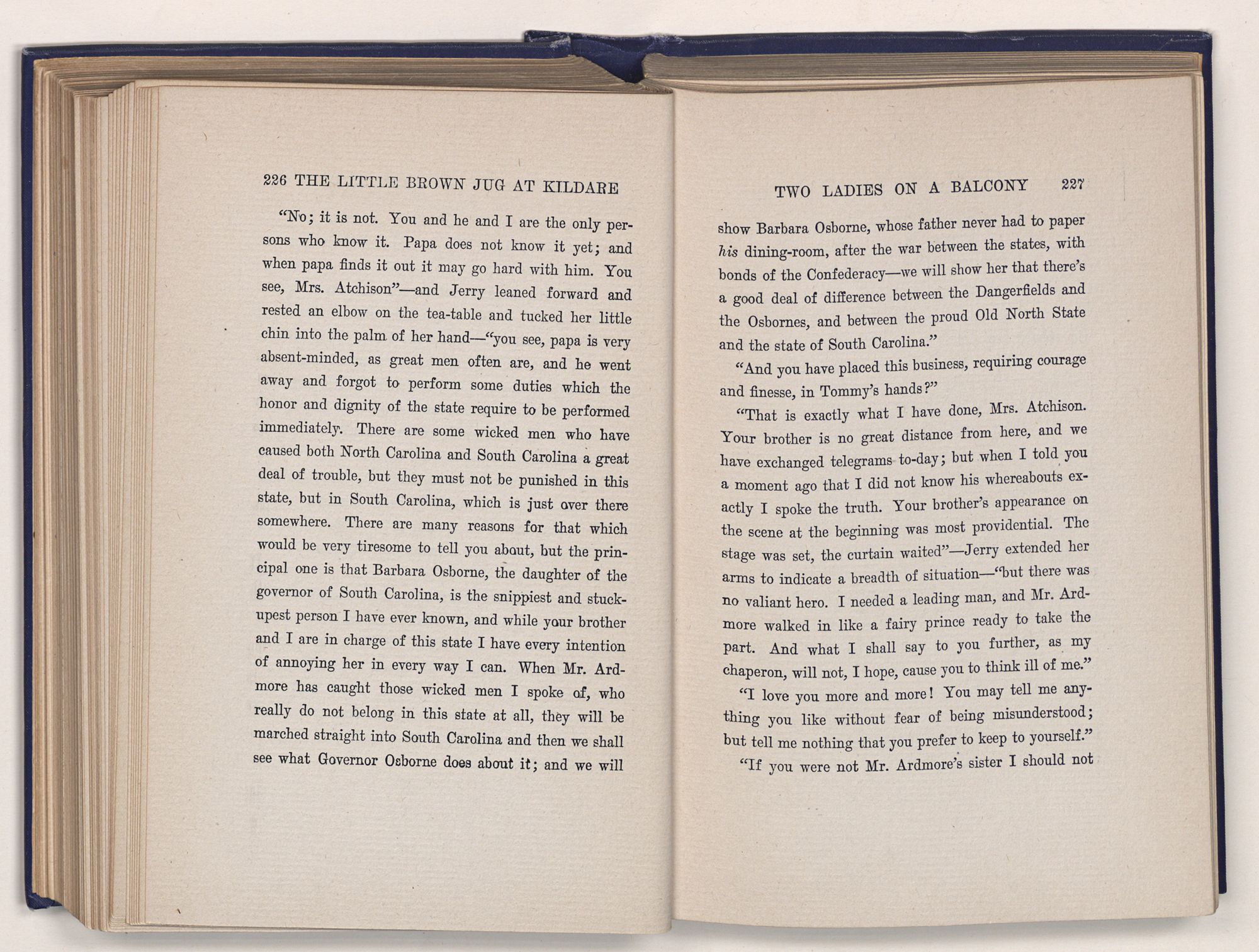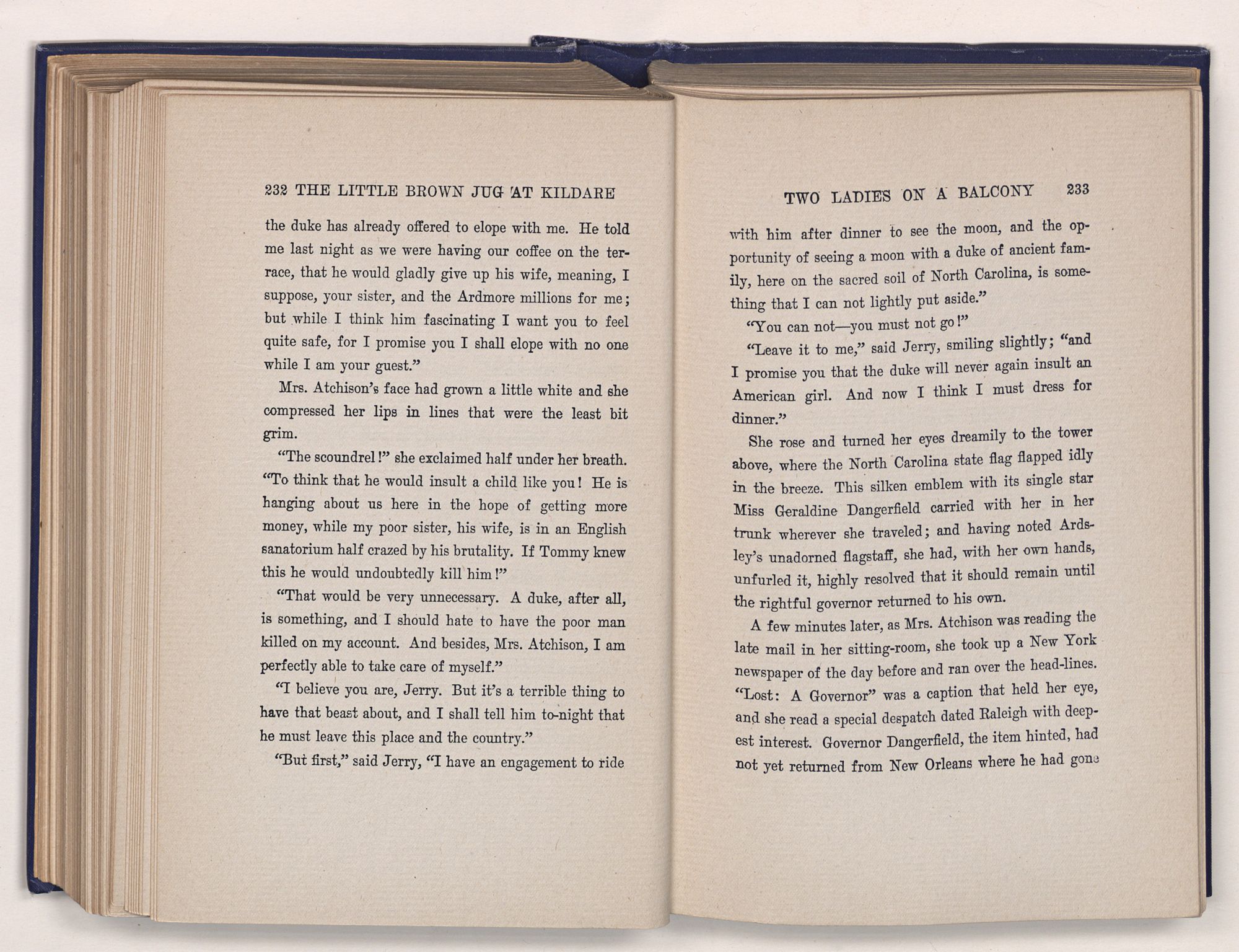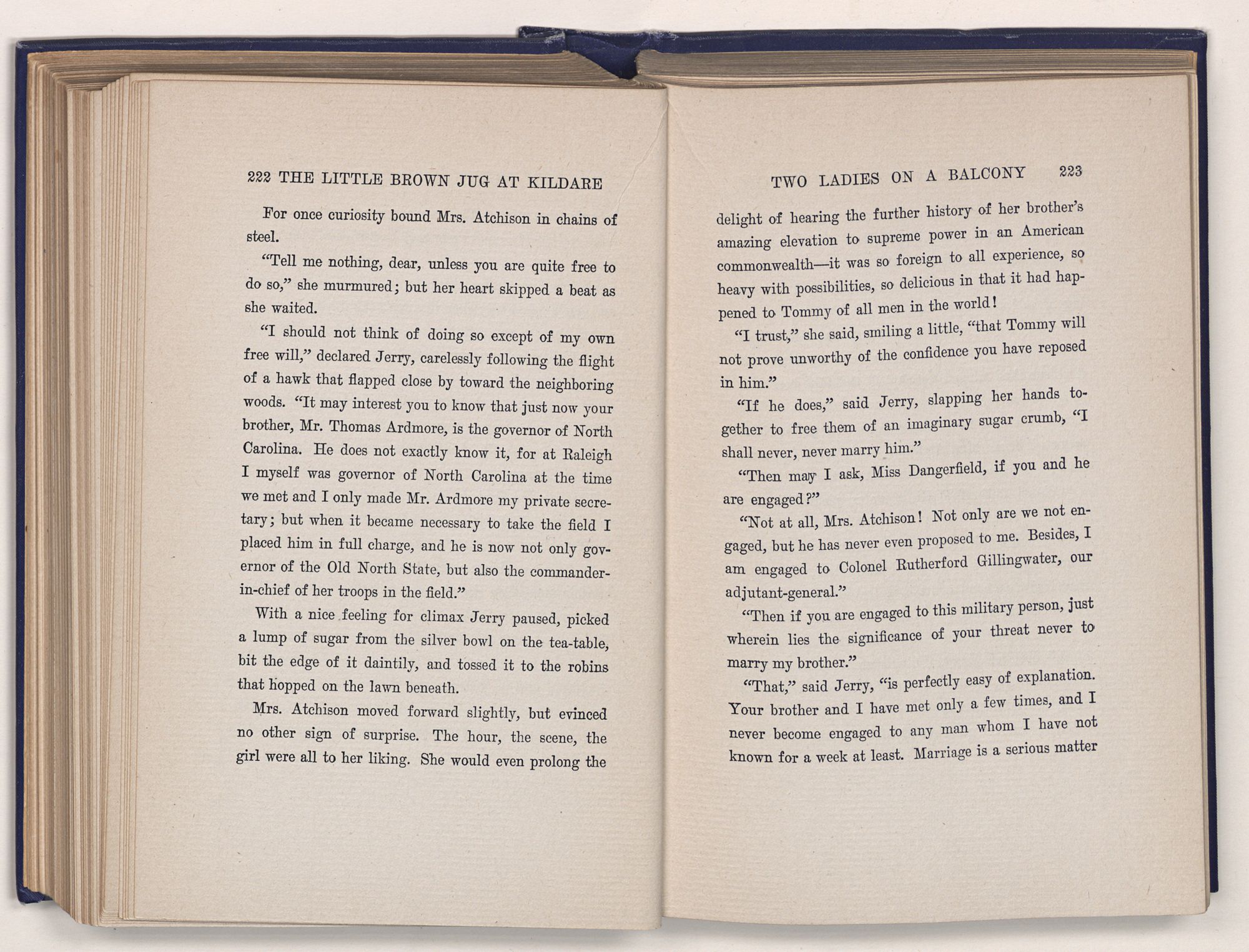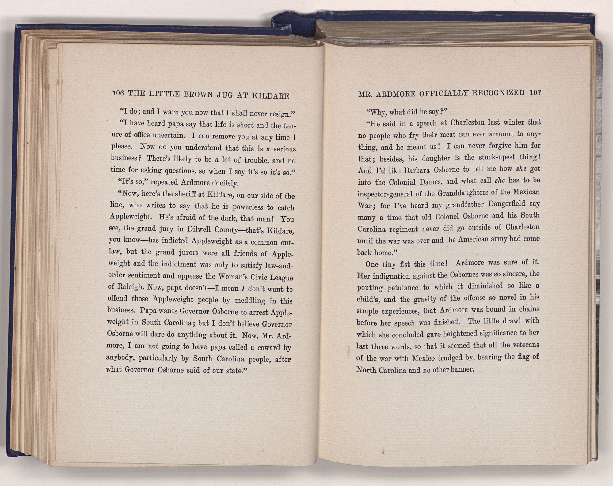 “Mr. Ardmore,” she said, “you may not be aware that when you asked me to be your wife—and that, I take it, was your intention—you were standing in South Carolina, while I stood with both feet on the sacred soil of the Old North State. Under the circumstances I do not think your proposal is legal. Moreover, unless you are quite positive which eye it was that so far forgot itself as to wink, I do not think the matter can go further.”
