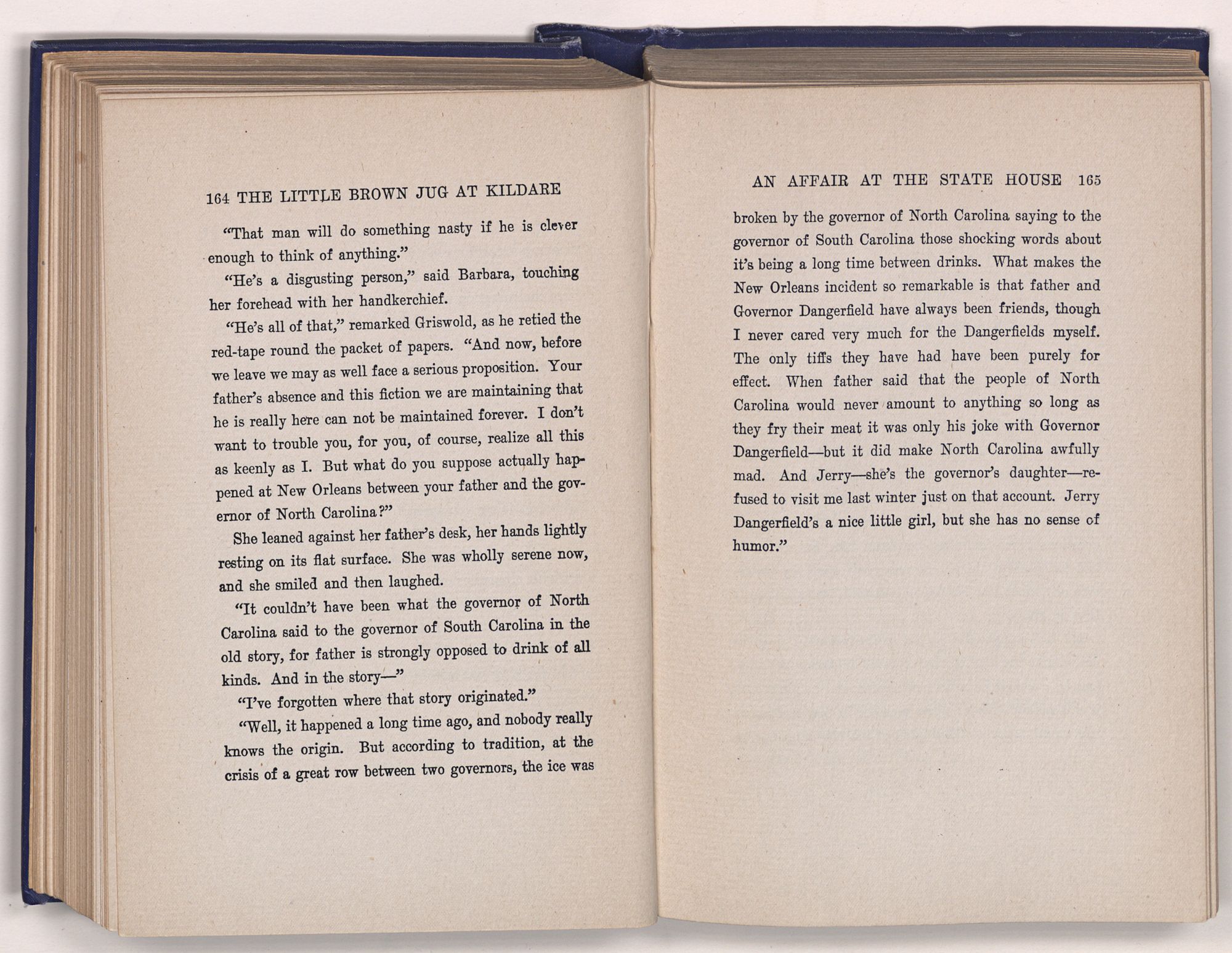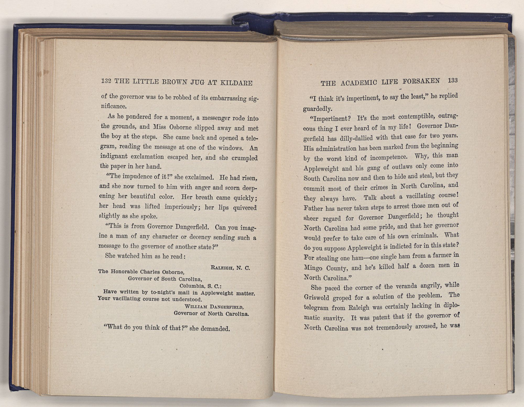 What did he say to him?What did he say to him?What did who say?What did the governor of North Carolina SAYTo the governor of South Carolina?With a sigh Ardmore left them at the great gates of Ardsley and returned to the house to find Jerry; but that young woman was the center of a wide circle of admiring militia officers, and the master of Ardsley was so depressed by the spectacle that he sought a dim corner of the grounds where there was a stone bench by a fountain, and there, to his confusion, he beheld Miss Barbara Osborne and Henry Maine Griswold; and Miss Osborne, it seemed, was in the act of fastening a white rose in Professor Griswold's coat.