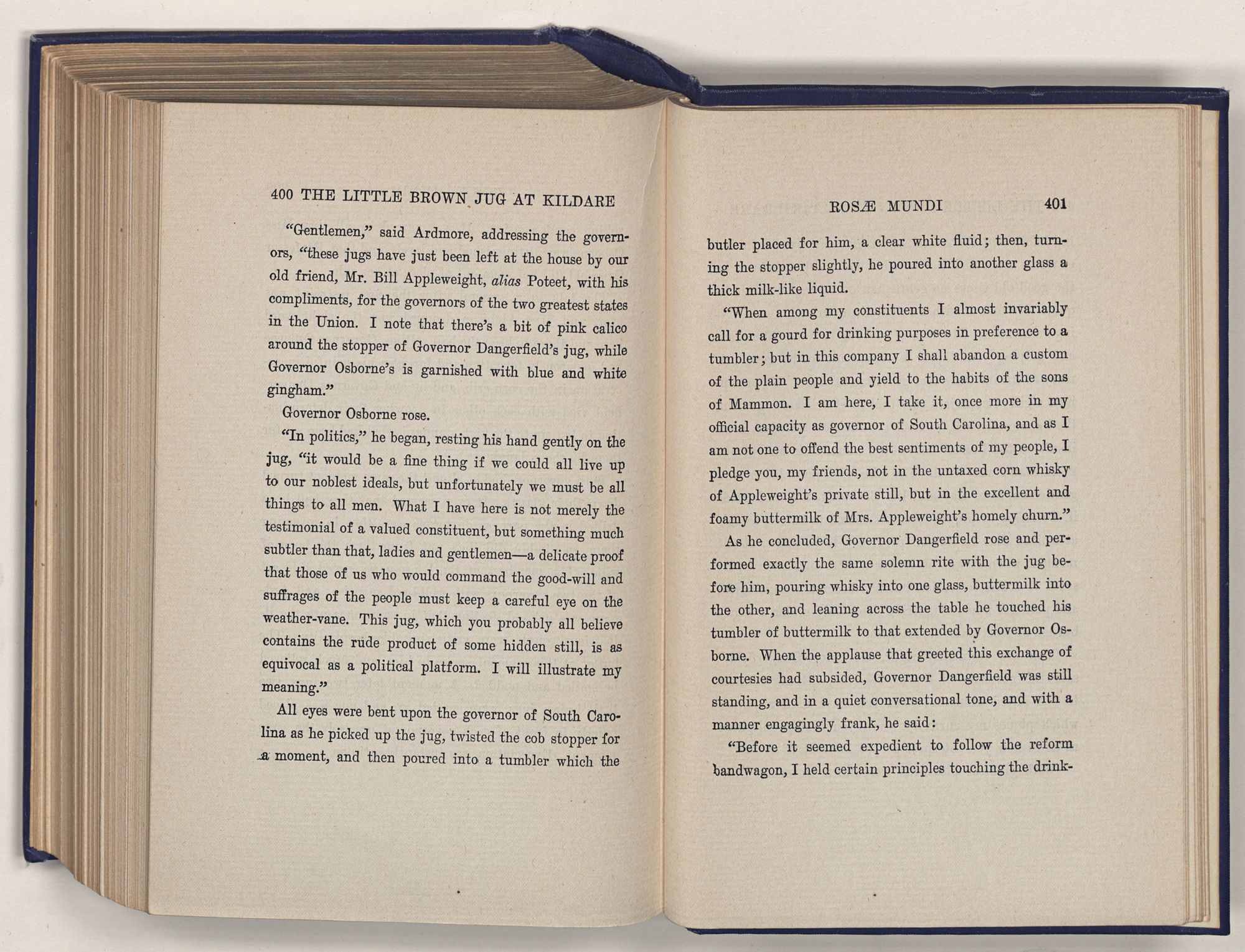 “When among my constituents I almost invariably call for a gourd for drinking purposes in preference to a tumbler; but in this company I shall abandon a custom of the plain people and yield to the habits of the sons of Mammon. I am here, I take it, once more in my official capacity as governor of South Carolina, and as I am not one to offend the best sentiments of my people, I pledge you, my friends, not in the untaxed corn whisky of Appleweight's private still, but in the excellent and foamy buttermilk of Mrs. Appleweight's homely churn.”