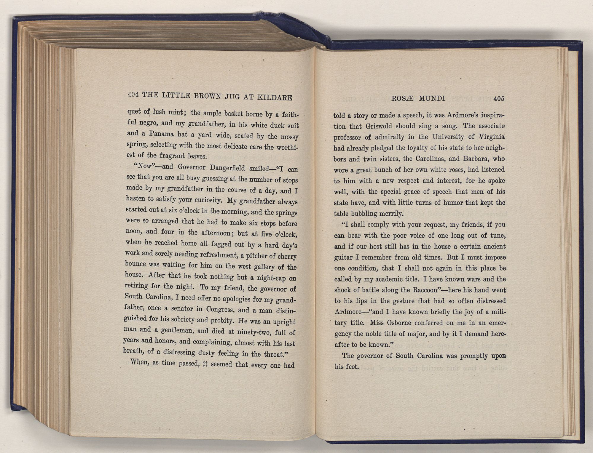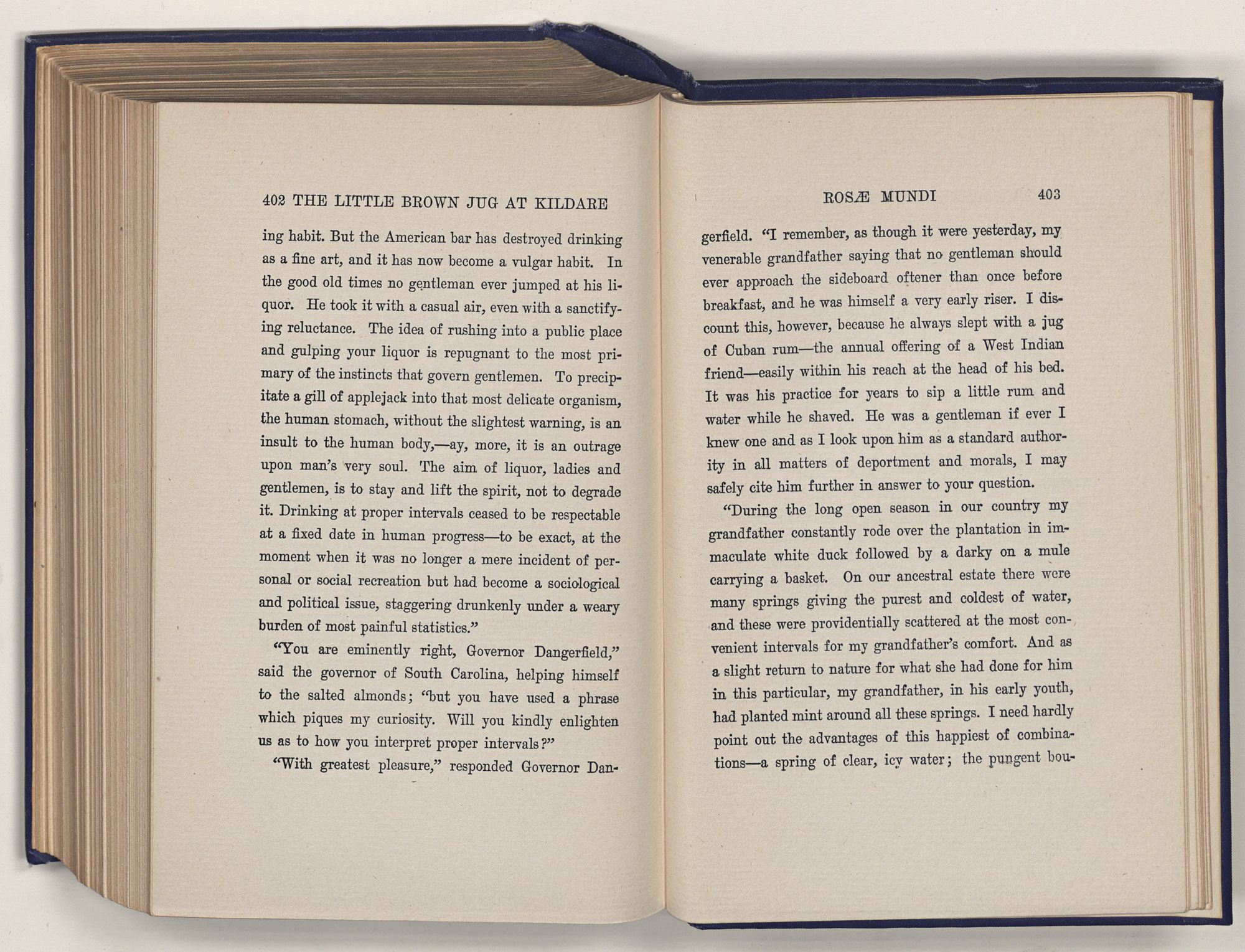 “During the long open season in our country my grandfather constantly rode over the plantation in immaculate white duck followed by a darky on a mule carrying a basket. On our ancestral estate there were many springs giving the purest and coldest of water, and these were providentially scattered at the most convenient intervals for my grandfather's comfort. And as a slight return to nature for what she had done for him in this particular, my grandfather, in his early youth, had planted mint around all these springs. I need hardly point out the advantages of this happiest of combinations—a spring of clear, icy water; the pungent bouquet