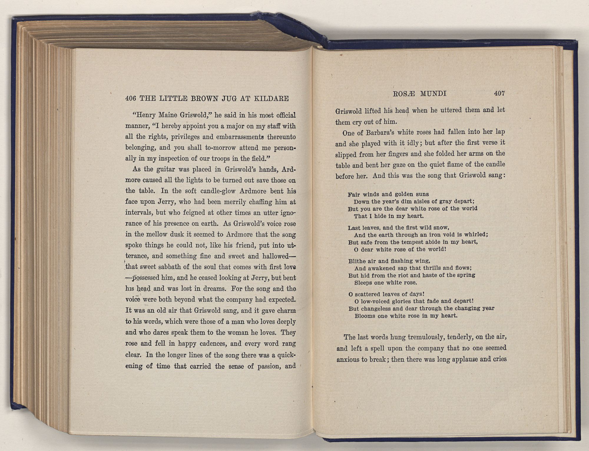 One of Barbara's white roses had fallen into her lap and she played with it idly; but after the first verse it slipped from her fingers and she folded her arms on the table and bent her gaze on the quiet flame of the candle before her. And this was the song that Griswold sang: