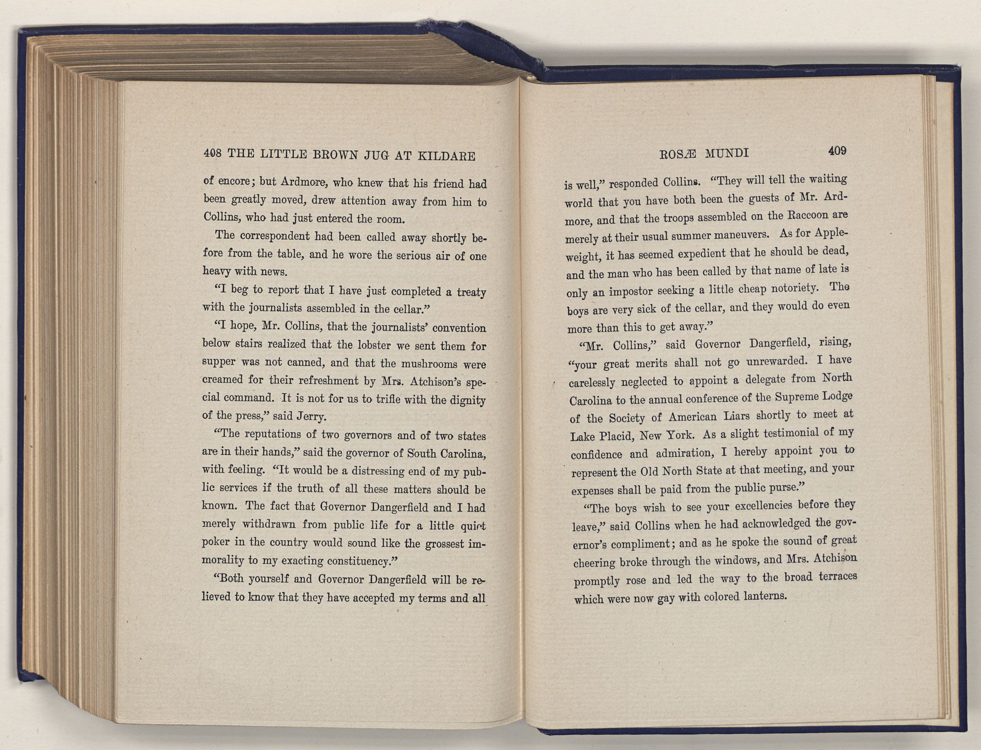 “Mr. Collins,” said Governor Dangerfield, rising, “your great merits shall not go unrewarded. I have carelessly neglected to appoint a delegate from North Carolina to the annual conference of the Supreme Lodge of the Society of American Liars shortly to meet at Lake Placid, New York. As a slight testimonial of my confidence and admiration, I hereby appoint you to represent the Old North State at that meeting, and your expenses shall be paid from the public purse.”