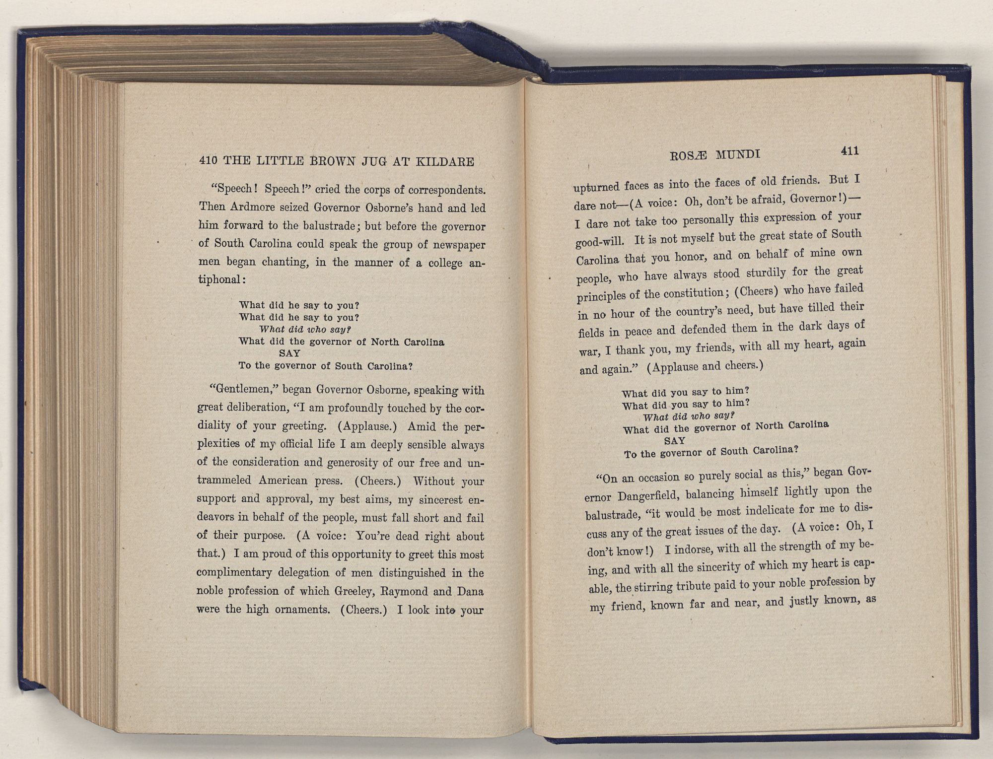 What did he say to you?What did he say to you?What did who say?What did the governor of North Carolina SAYTo the governor of South Carolina?“Gentlemen,” began Governor Osborne, speaking with great deliberation, “I am profoundly touched by the cordiality of your greeting. (Applause.) Amid the perplexities of my official life I am deeply sensible always of the consideration and generosity of our free and untrammeled American press. (Cheers.) Without your support and approval, my best aims, my sincerest endeavors in behalf of the people, must fall short and fail of their purpose. (A voice: You're dead right about that.) I am proud of this opportunity to greet this most complimentary delegation of men distinguished in the noble profession of which Greeley, Raymond and Dana were the high ornaments. (Cheers.) I look into your