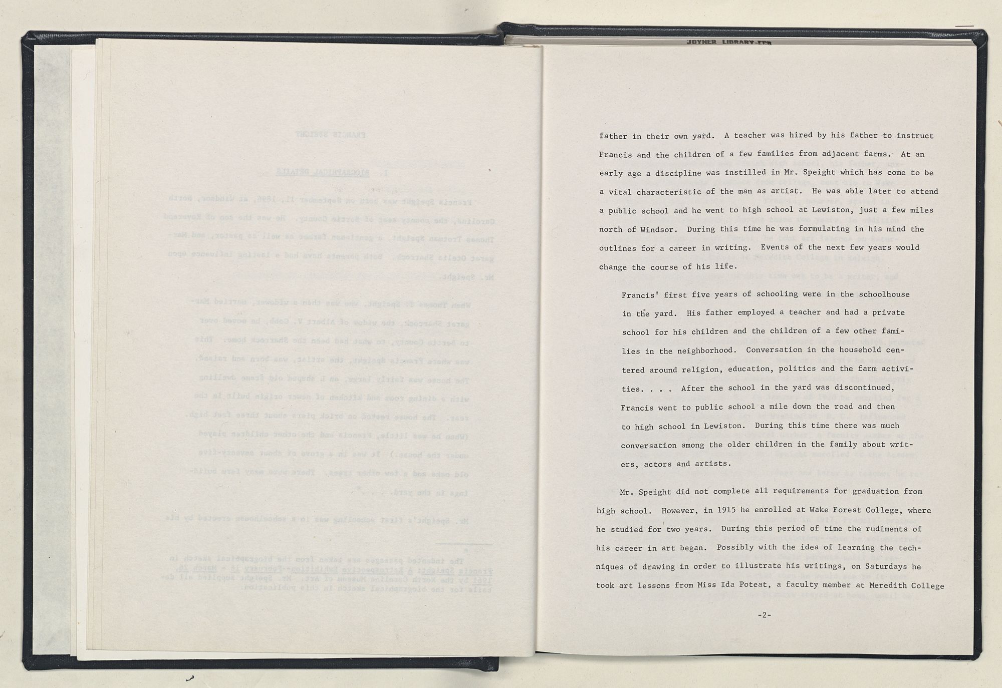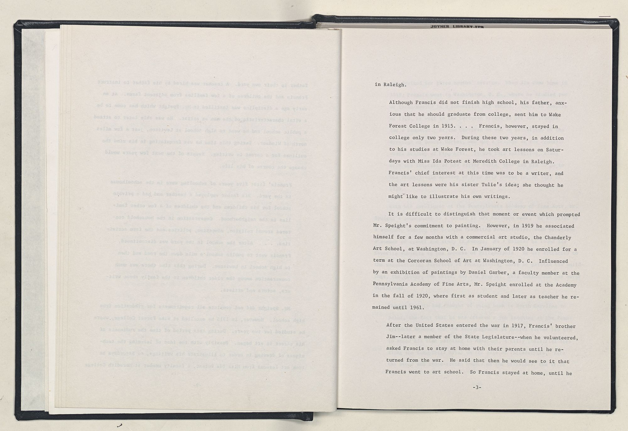 Mr. Speight did not complete all requirements for graduation from high school. However, in 1915 he enrolled at Wake Forest College, where he studied for two years. During this period of time the rudiments of his career in art began. Possibly with the idea of learning the techniques of drawing in order to illustrate his writings, on Saturdays he took art lessons from Miss Ida Poteat, a faculty member at Meredith College