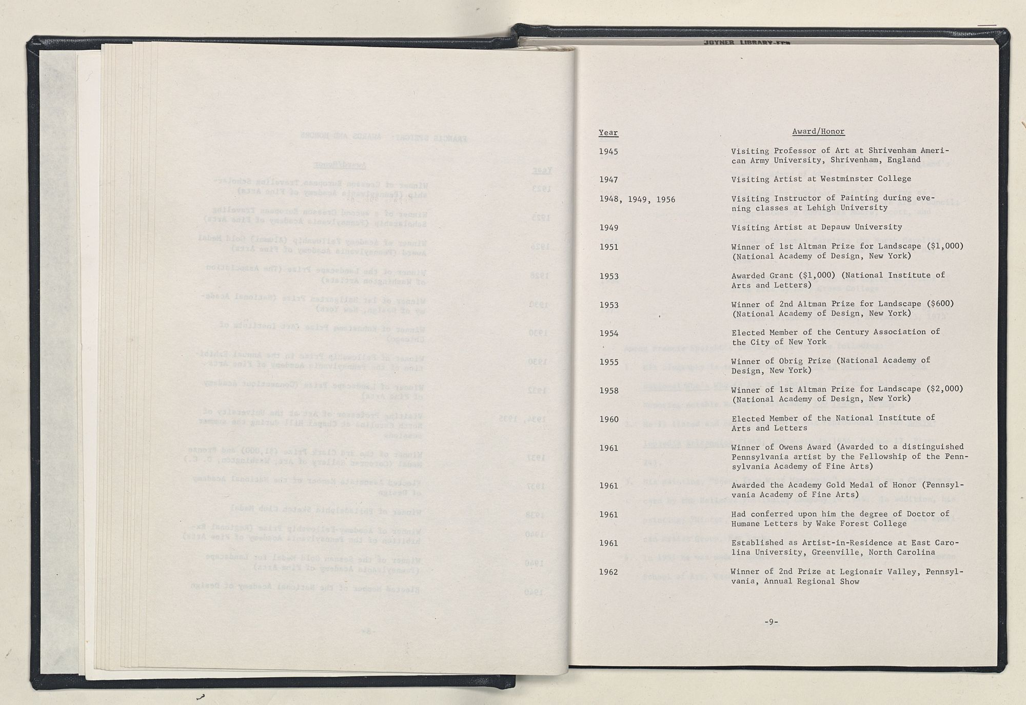 1961Winner of Owens Award (Awarded to a distinguished Pennsylvania artist by the Fellowship of the Pennsylvania Academy of Fine Arts)