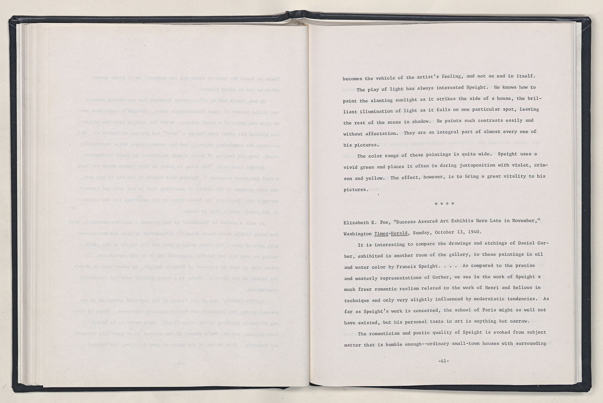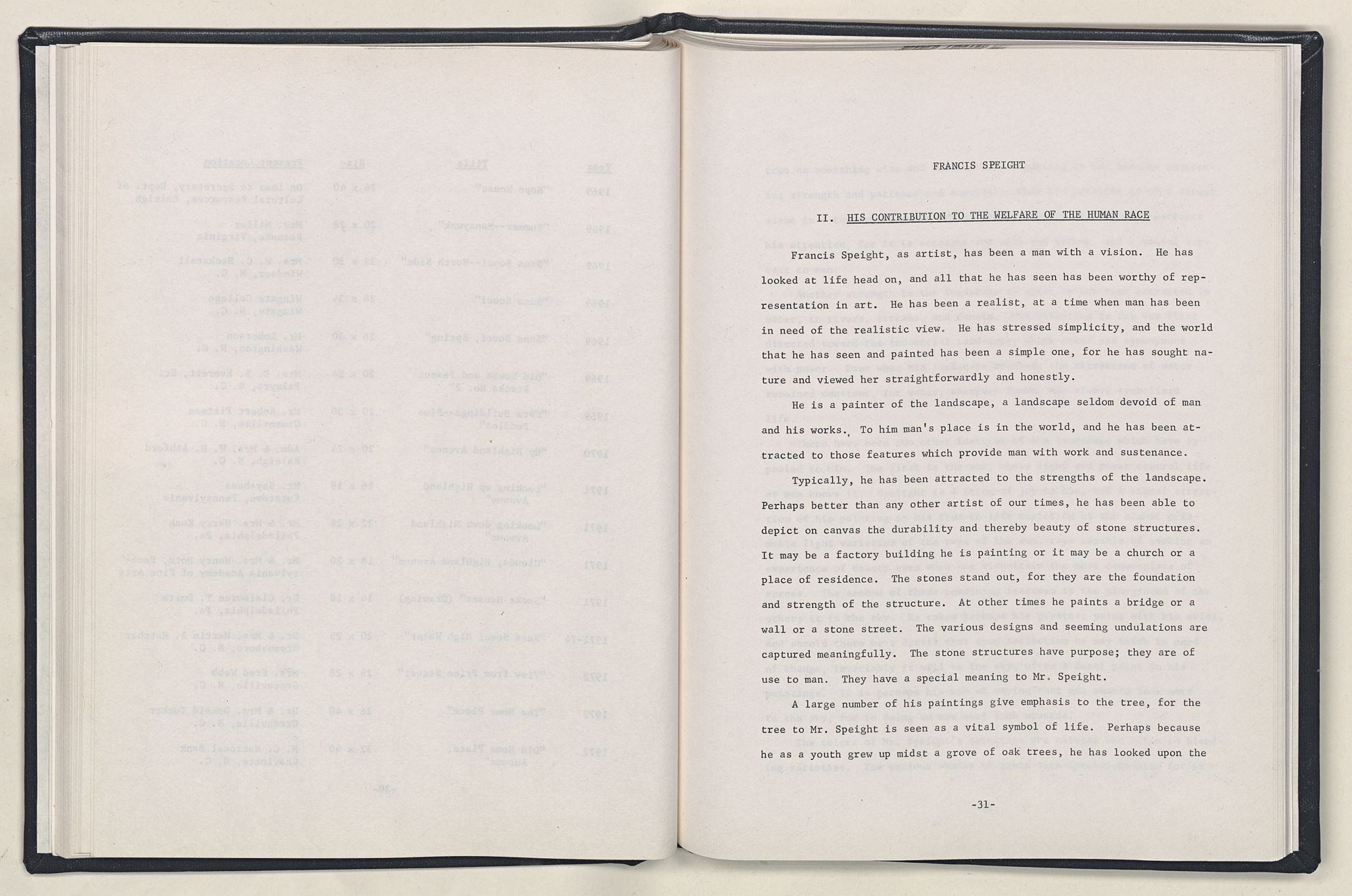 The contribution he has made with his art work spans the years of his life as an active painter. It increases as he continues to paint and as his paintings are exhibited in national museums and galleries and are evaluated and appraised by specialists in the field. The writers on Francis Speight's art which are included as a part of this nomination attest to his contribution and to his increasing stature among American artists.