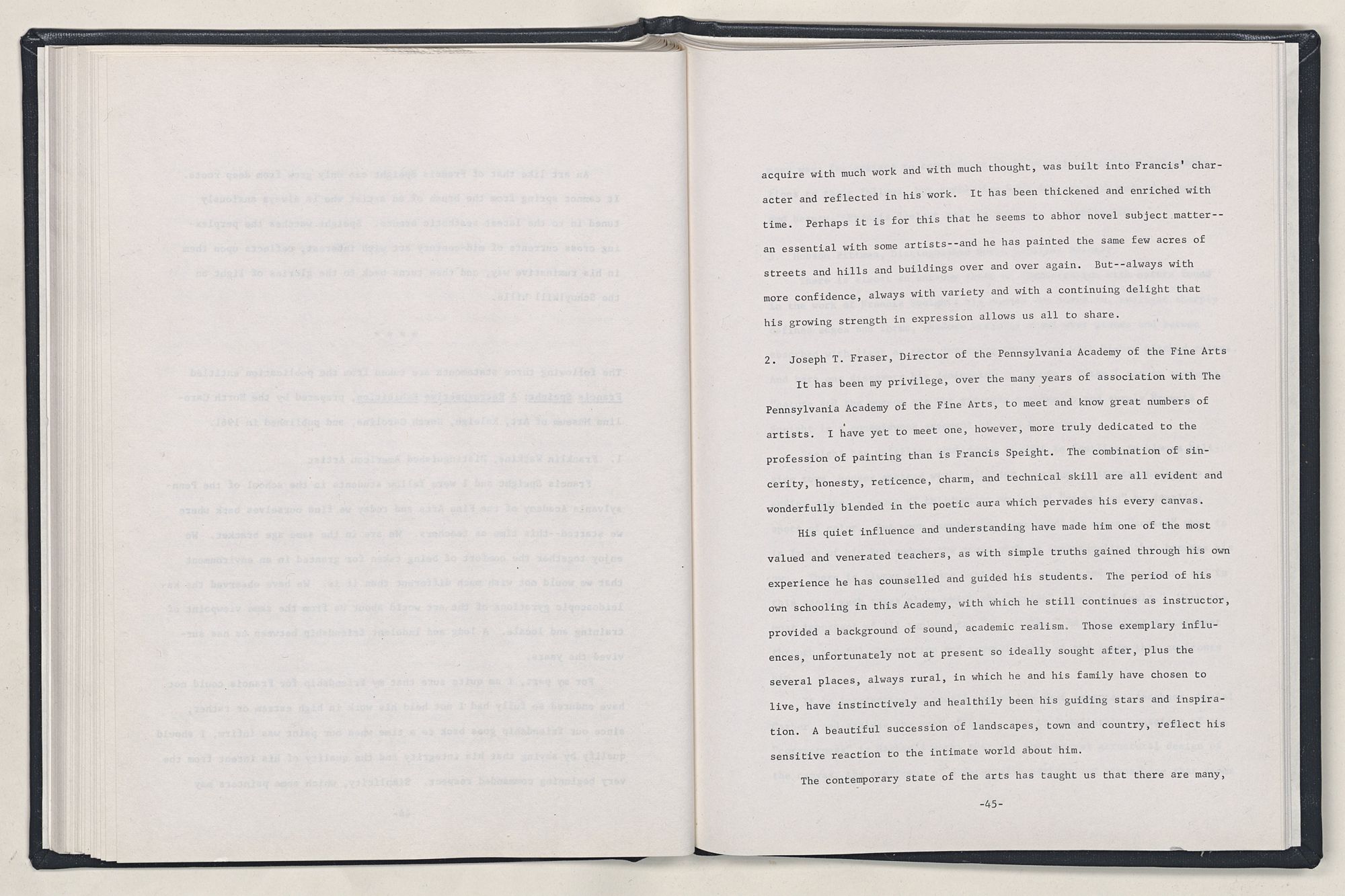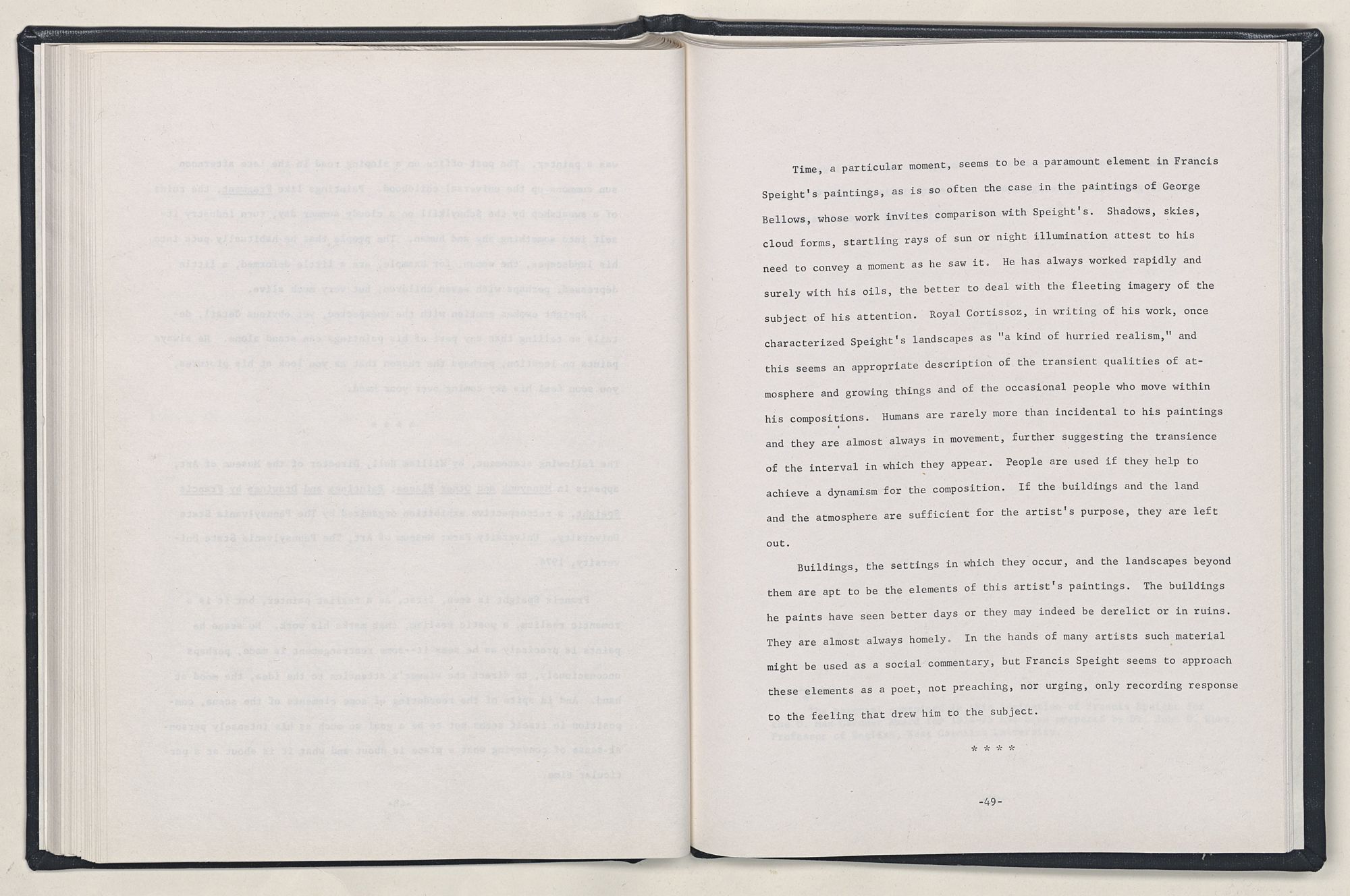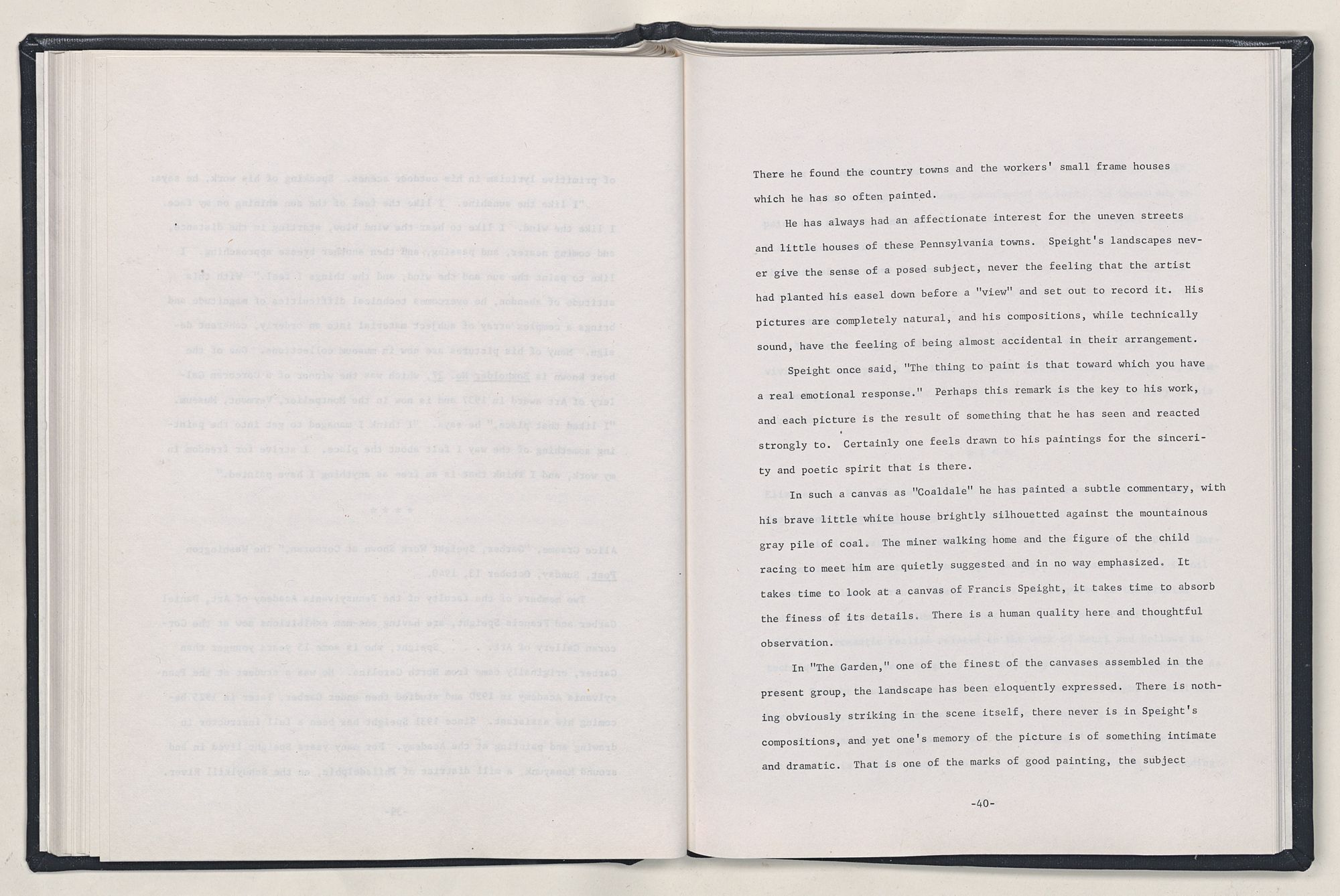 The following statement, by William Hull, Director of the Museum of Art, appears in Manayunk and Other Places: Paintings and Drawings by Francis Speight, a retrospective exhibition organized by The Pennsylvania State University. University Park: Museum of Art, The Pennsylvania State University, 1974.