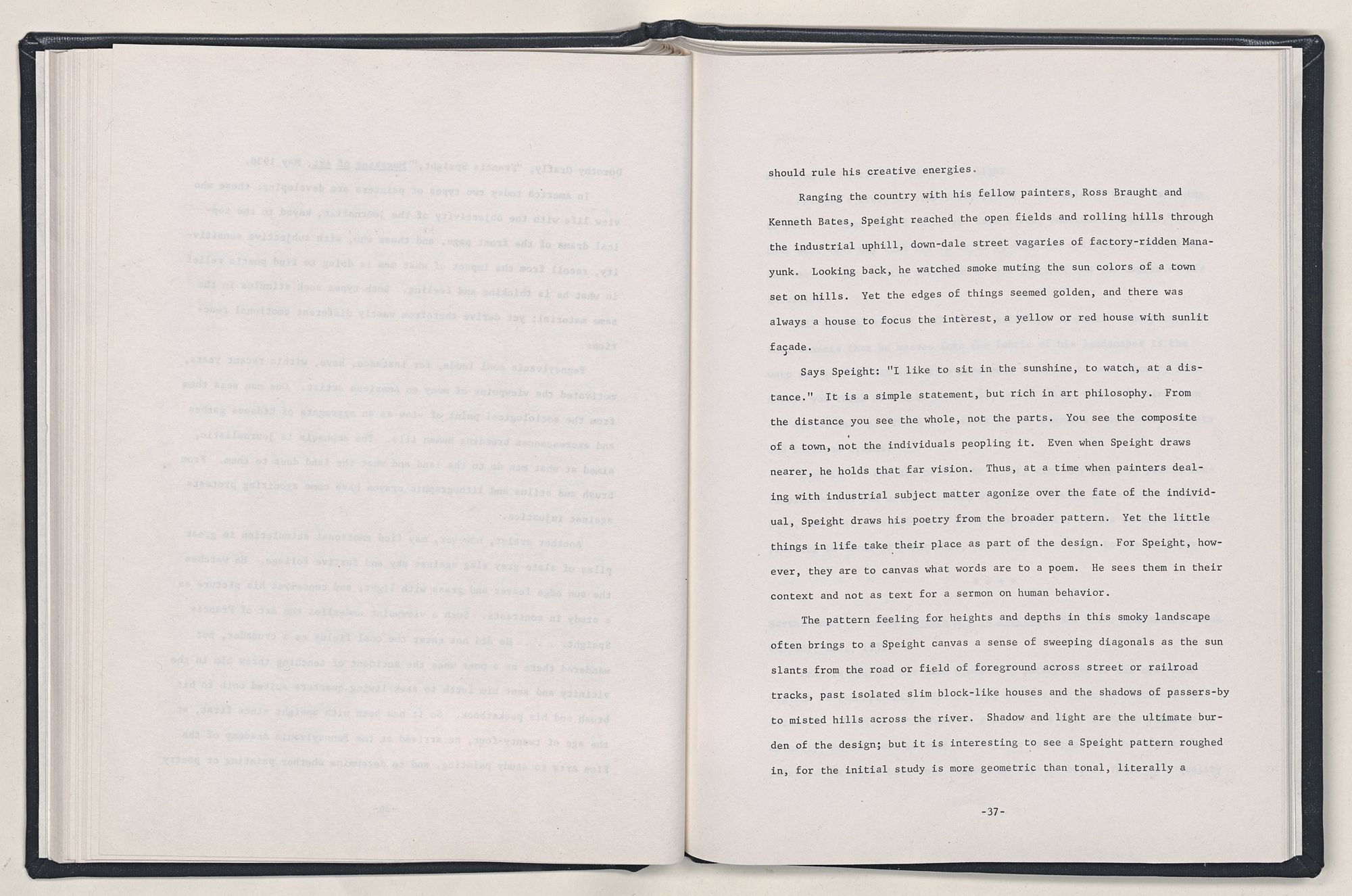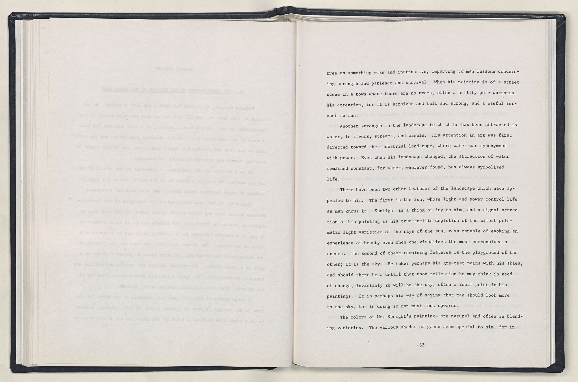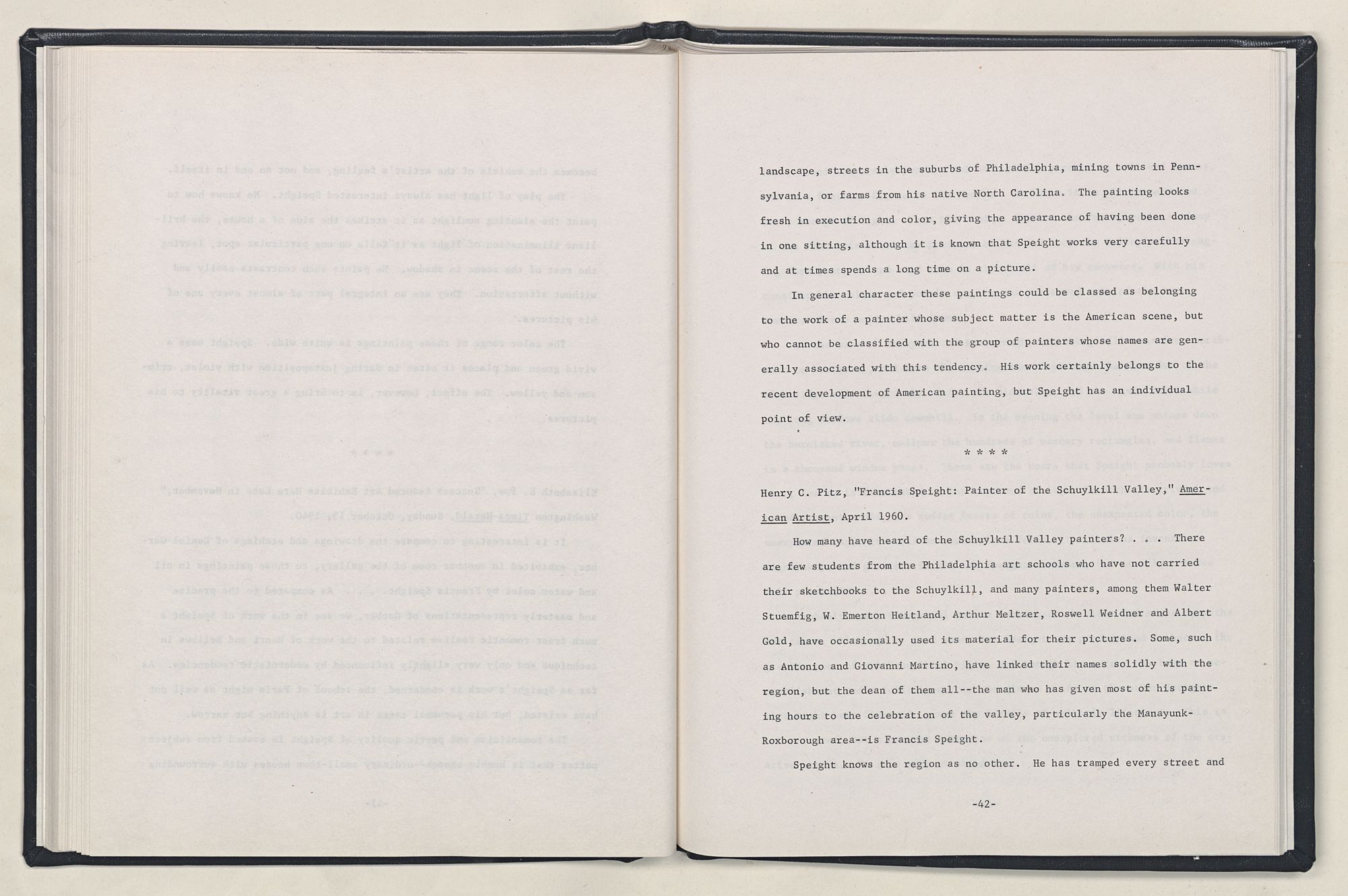 The following statement, by William Hull, Director of the Museum of Art, appears in Manayunk and Other Places: Paintings and Drawings by Francis Speight, a retrospective exhibition organized by The Pennsylvania State University. University Park: Museum of Art, The Pennsylvania State University, 1974.