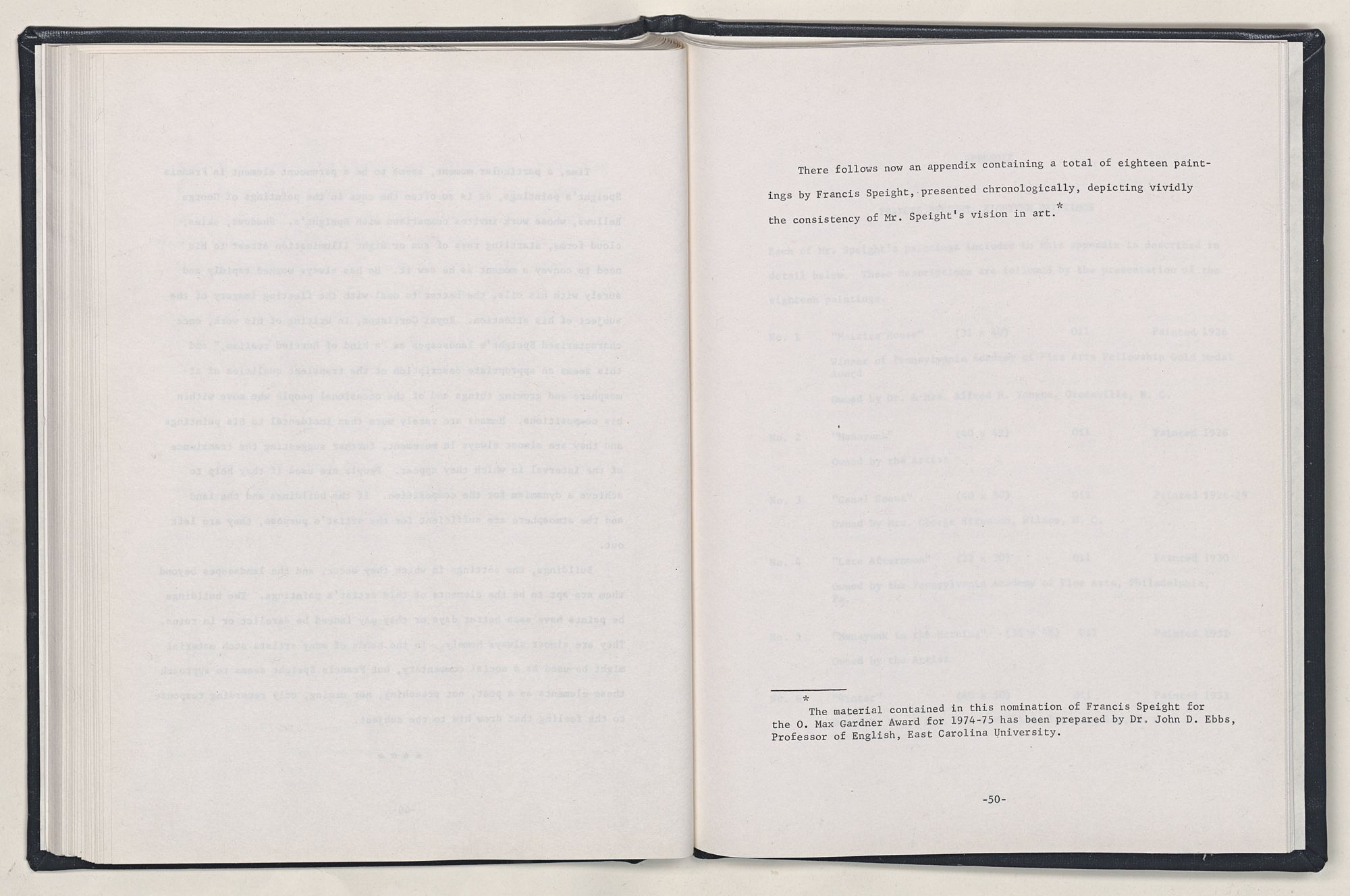 The nomination of Francis Speight for the Oliver Max Gardner Award : January 15, 1974 / [prepared by John D. Ebbs.] Greenville, N.C. : East Carolina University, 1974. 56 leaves : ill. ; 28 cm.