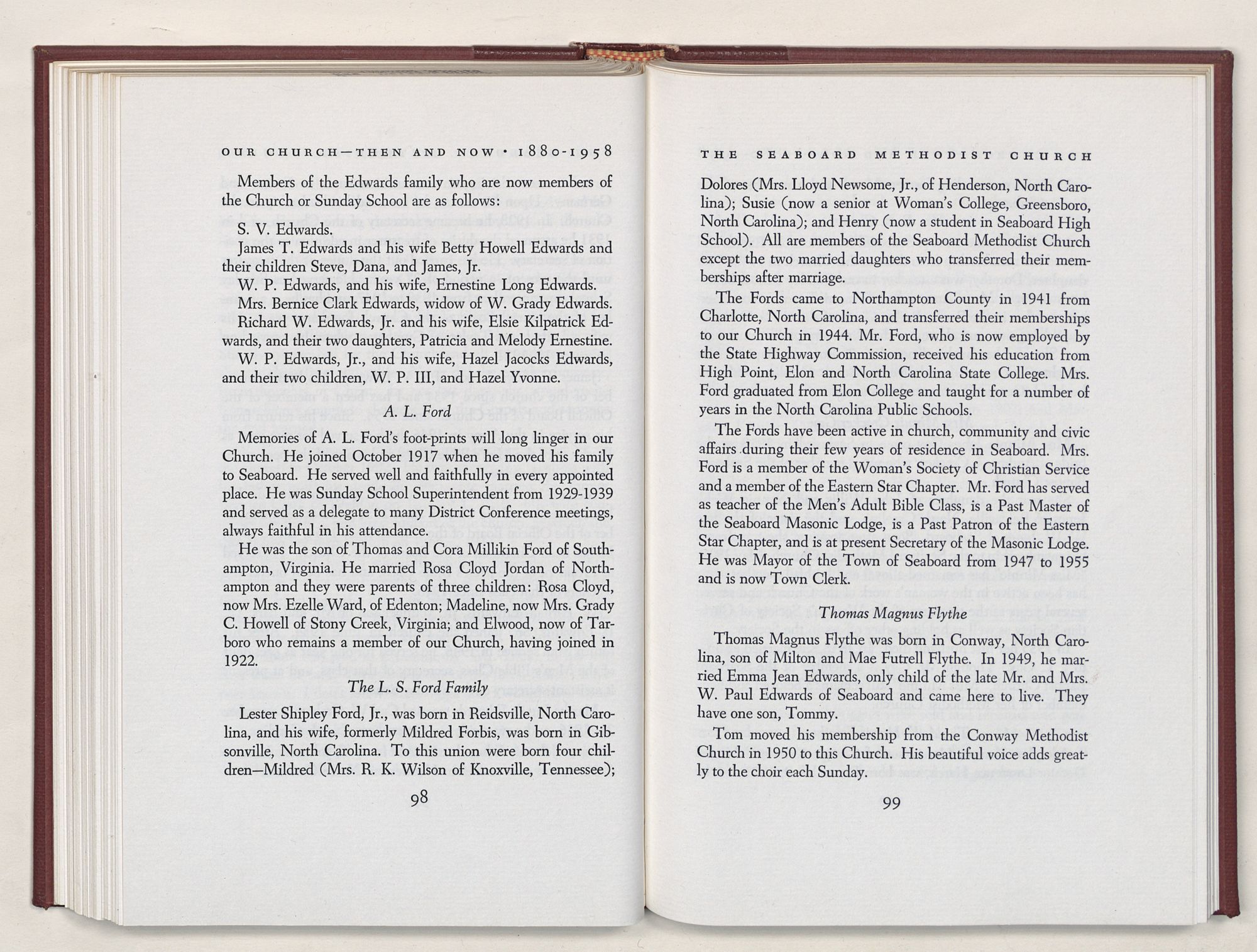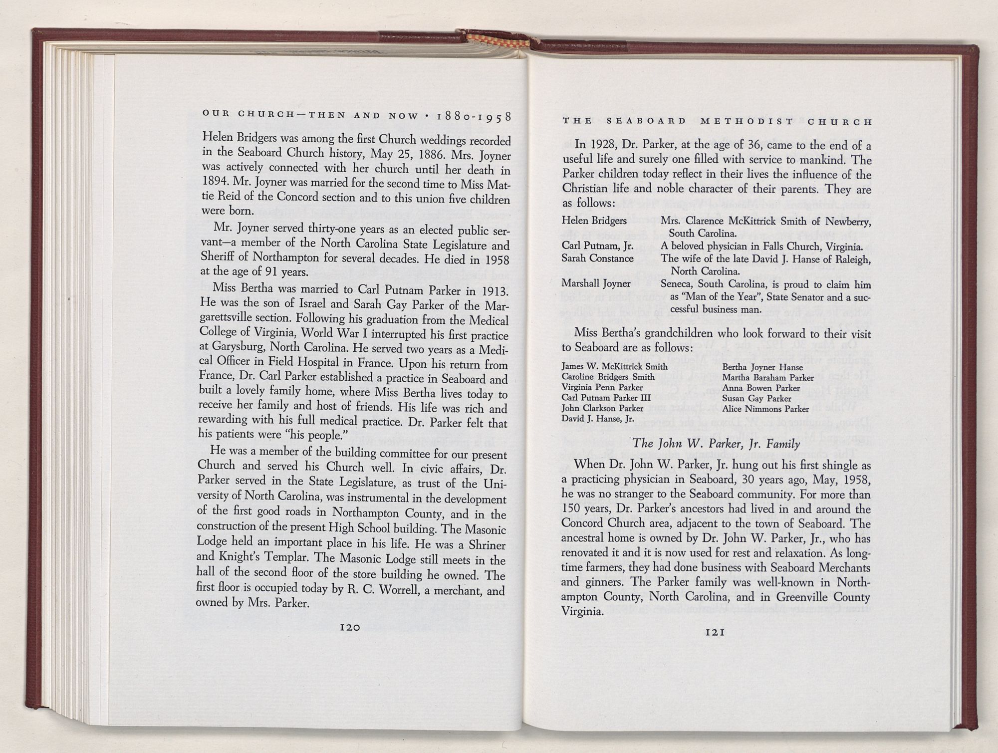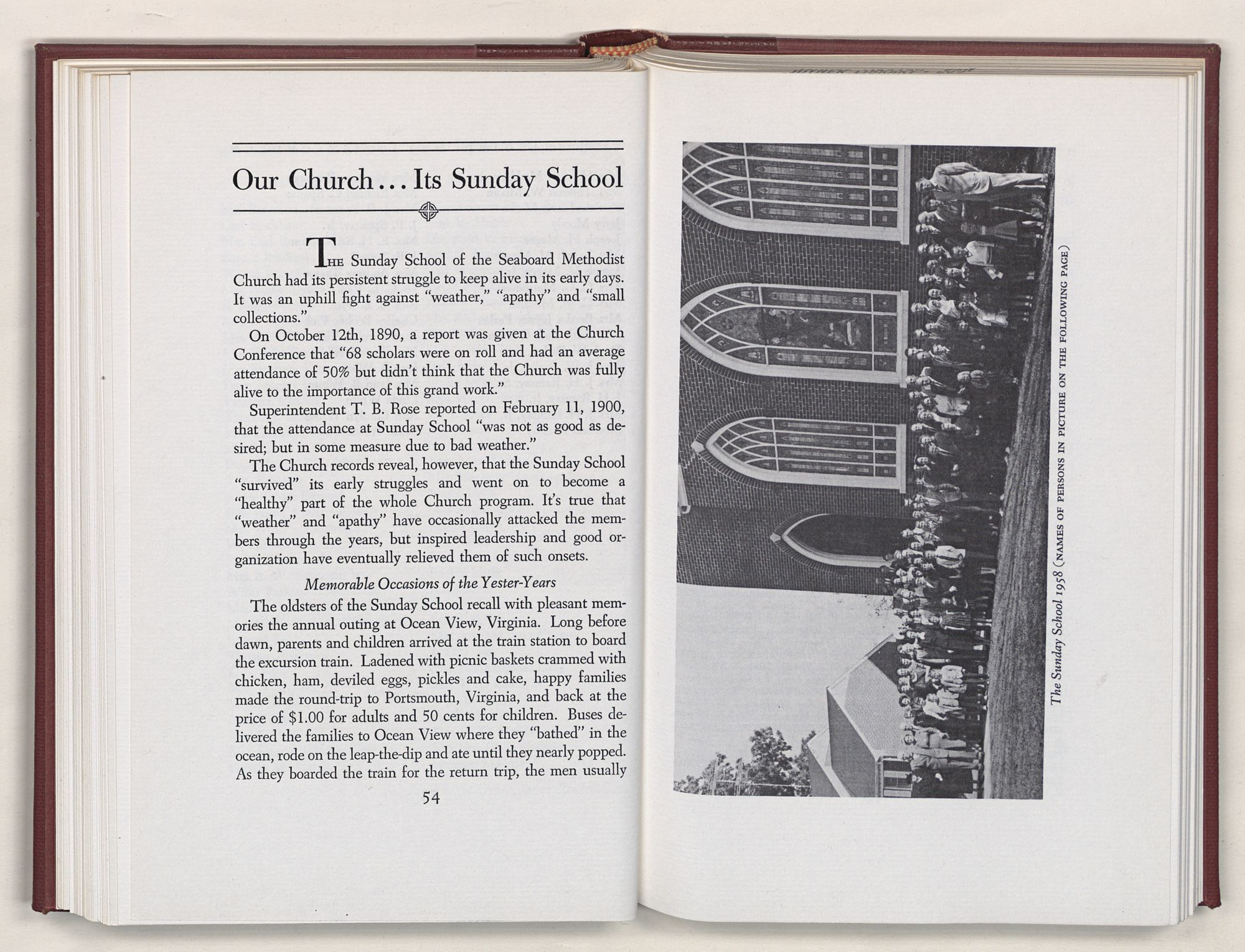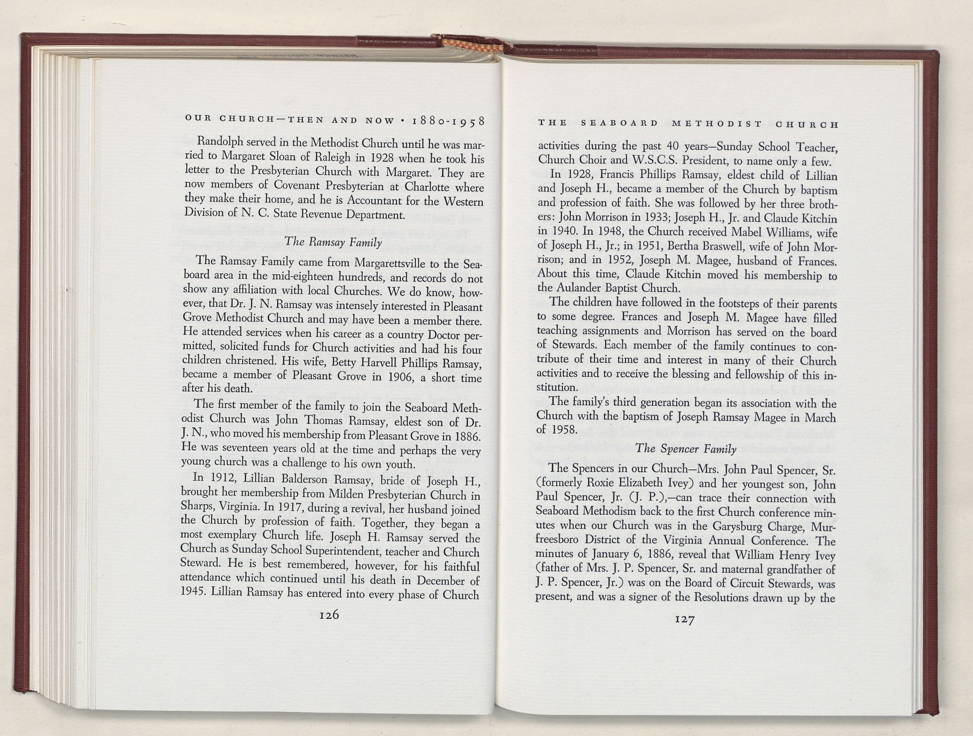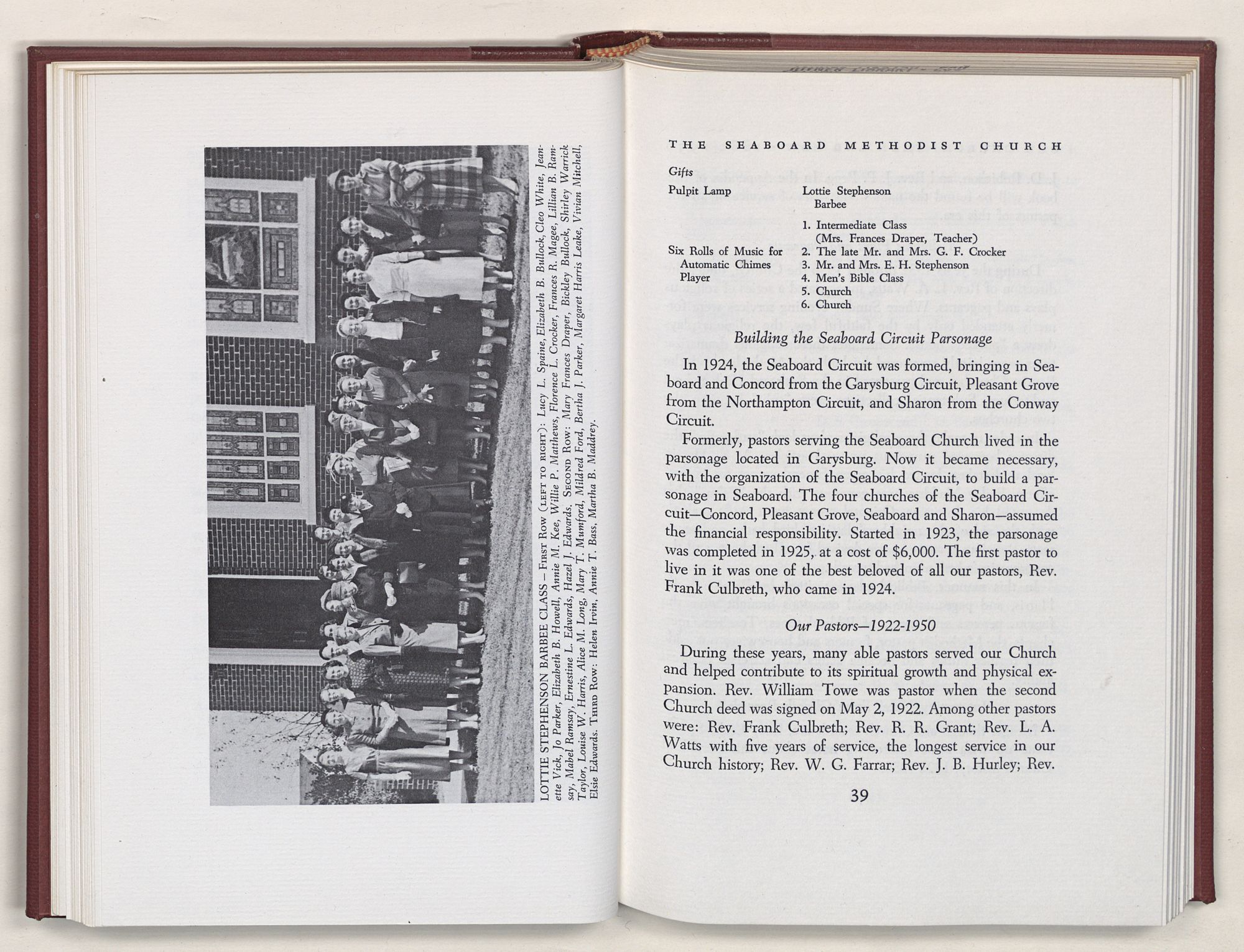 Nevertheless, it is our belief that the history of the Seaboard Methodist Church as related within these pages is basically factual. Furthermore, we believe this booklet will stimulate our Church officials and its members to keep more accurate records as well as more personal history of their families. Emerson, the great American essayist, once said: “There is properly no history, only biography.”