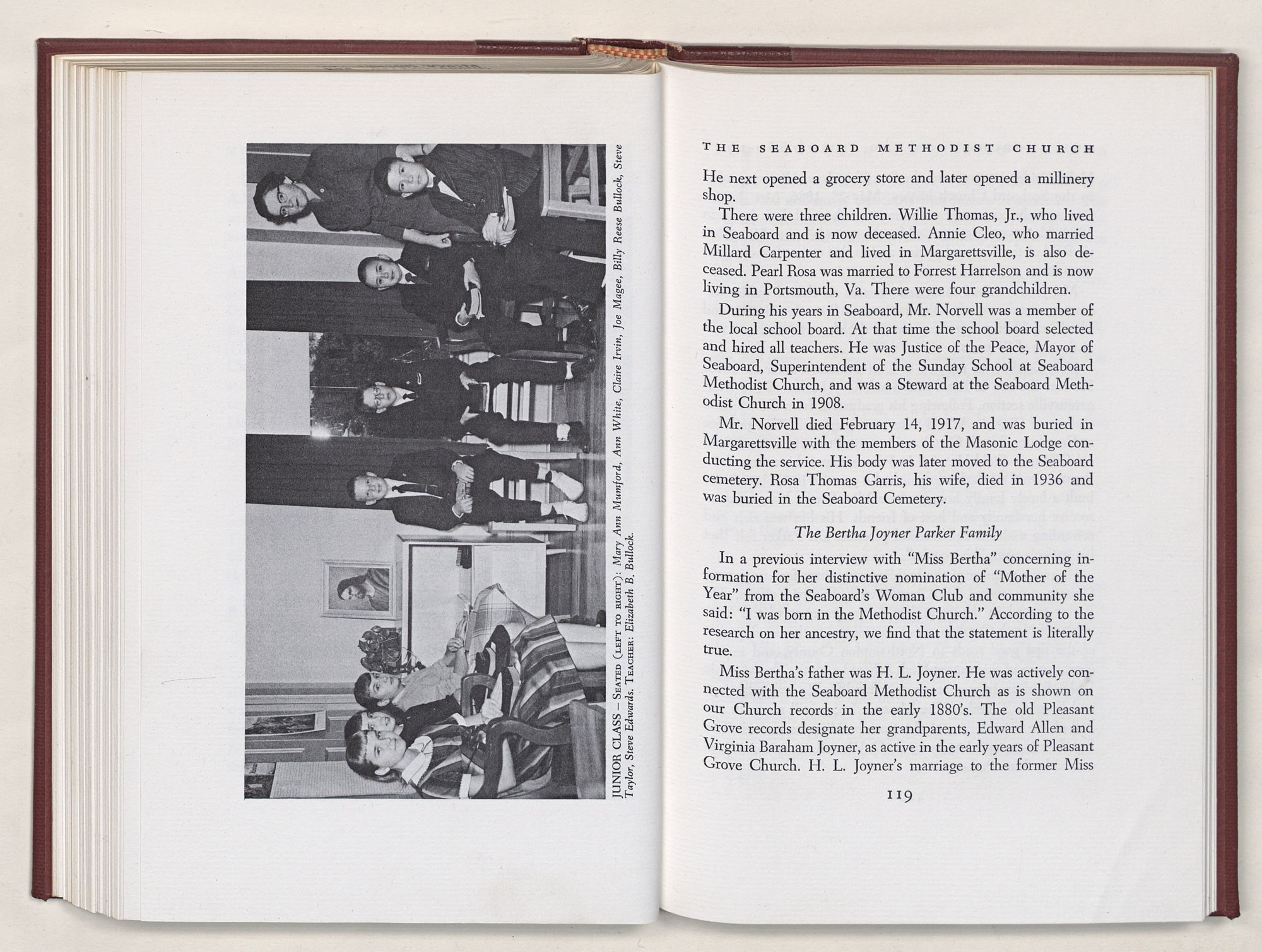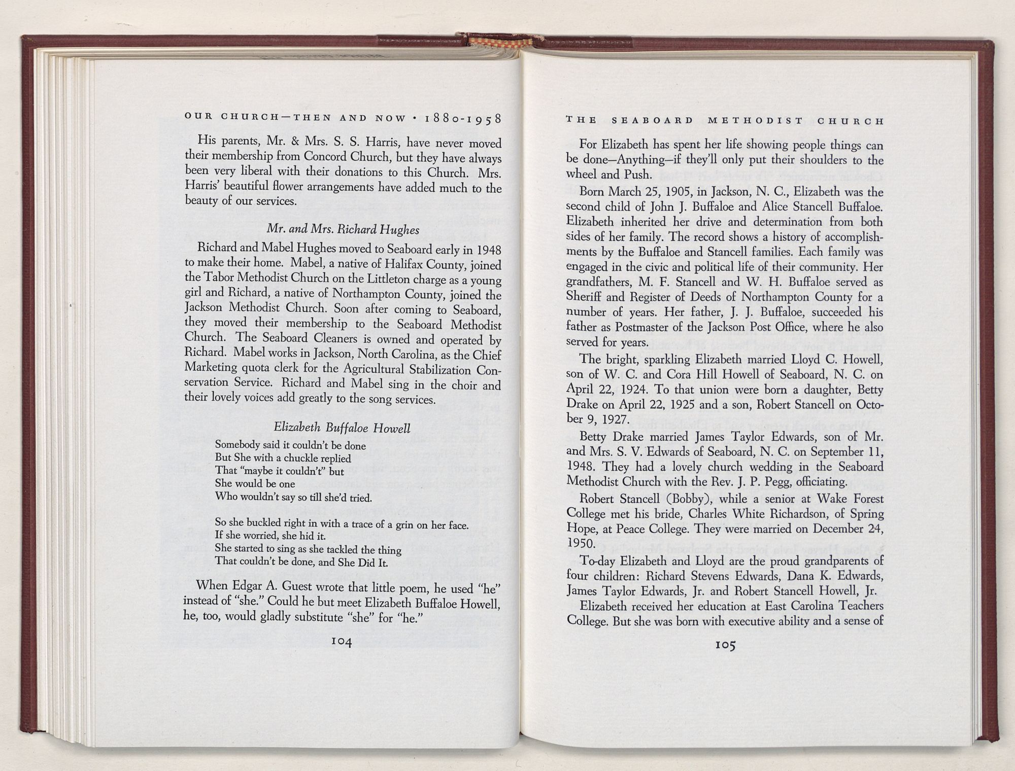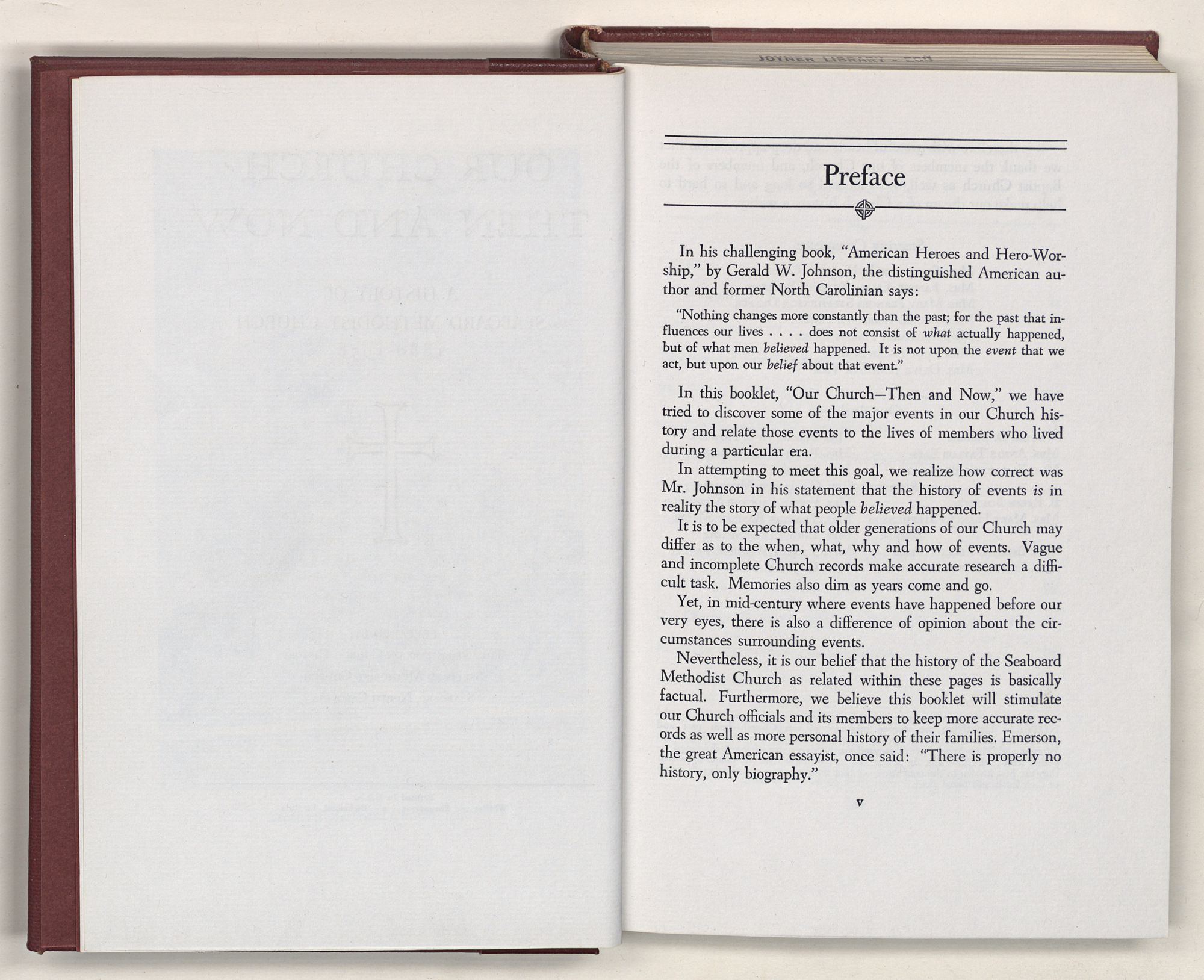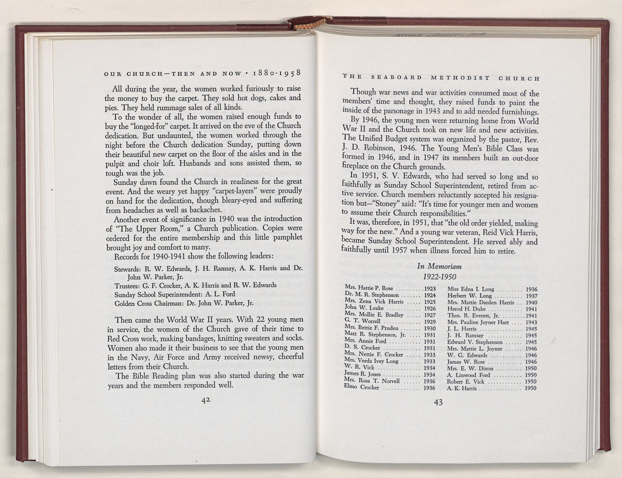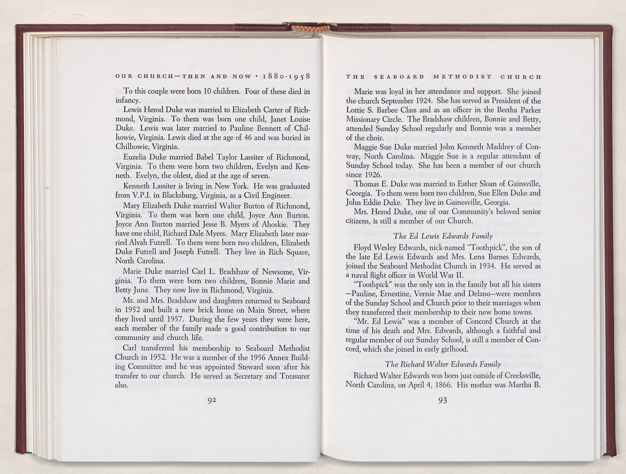 Nevertheless, it is our belief that the history of the Seaboard Methodist Church as related within these pages is basically factual. Furthermore, we believe this booklet will stimulate our Church officials and its members to keep more accurate records as well as more personal history of their families. Emerson, the great American essayist, once said: “There is properly no history, only biography.”