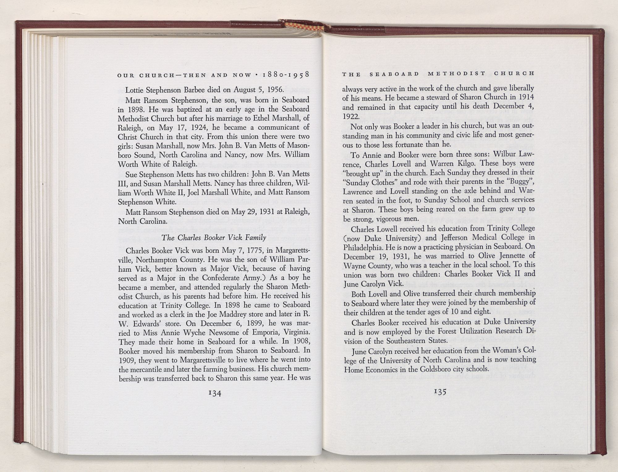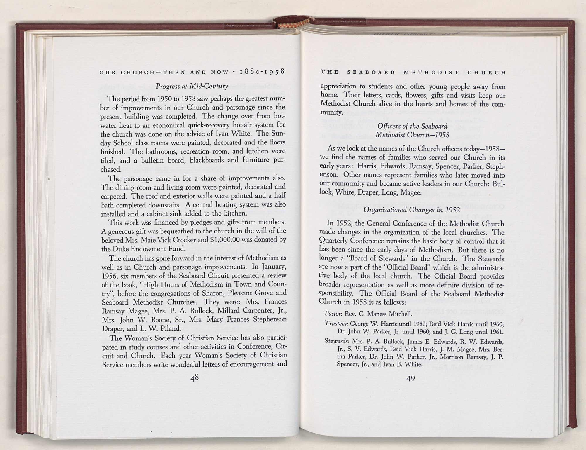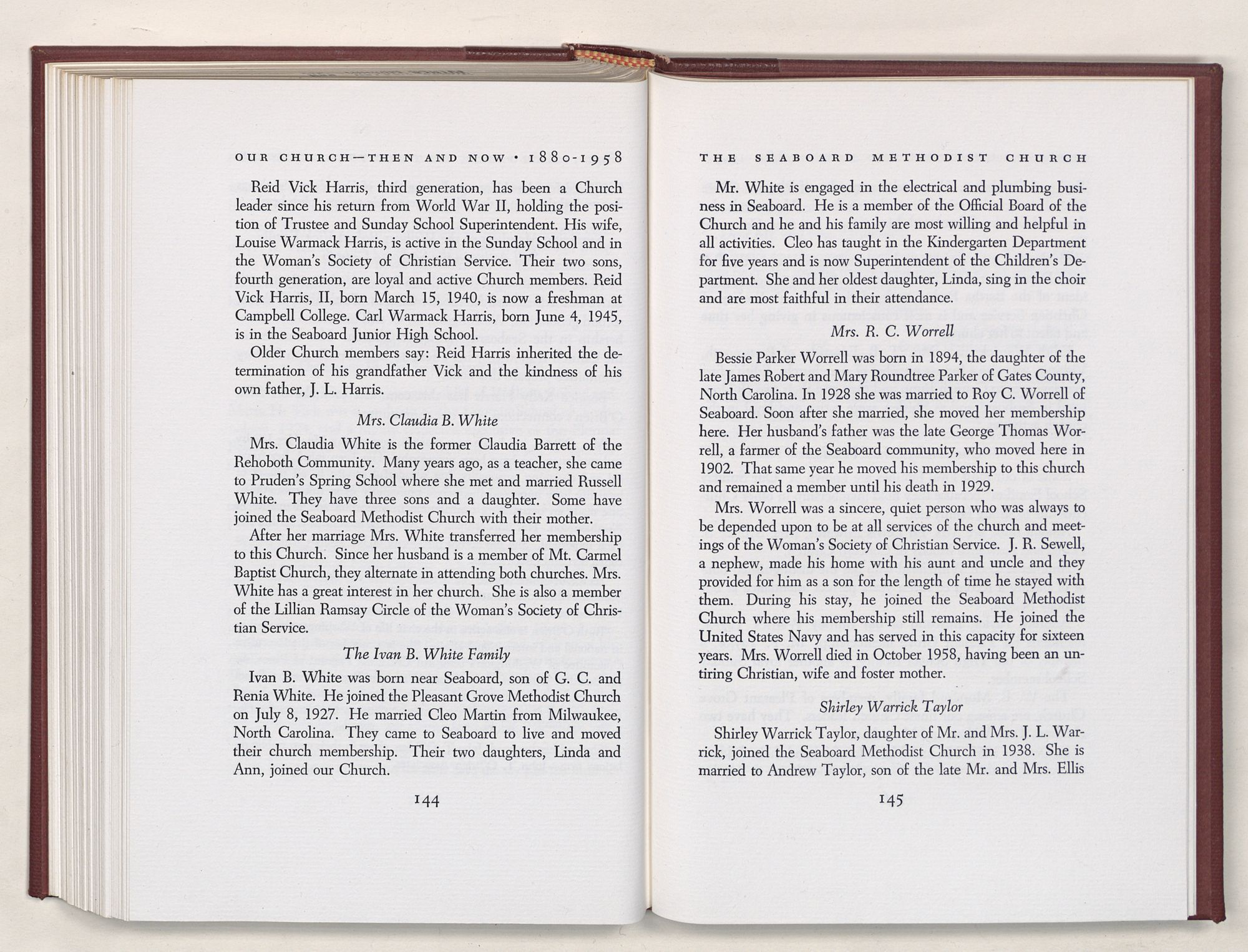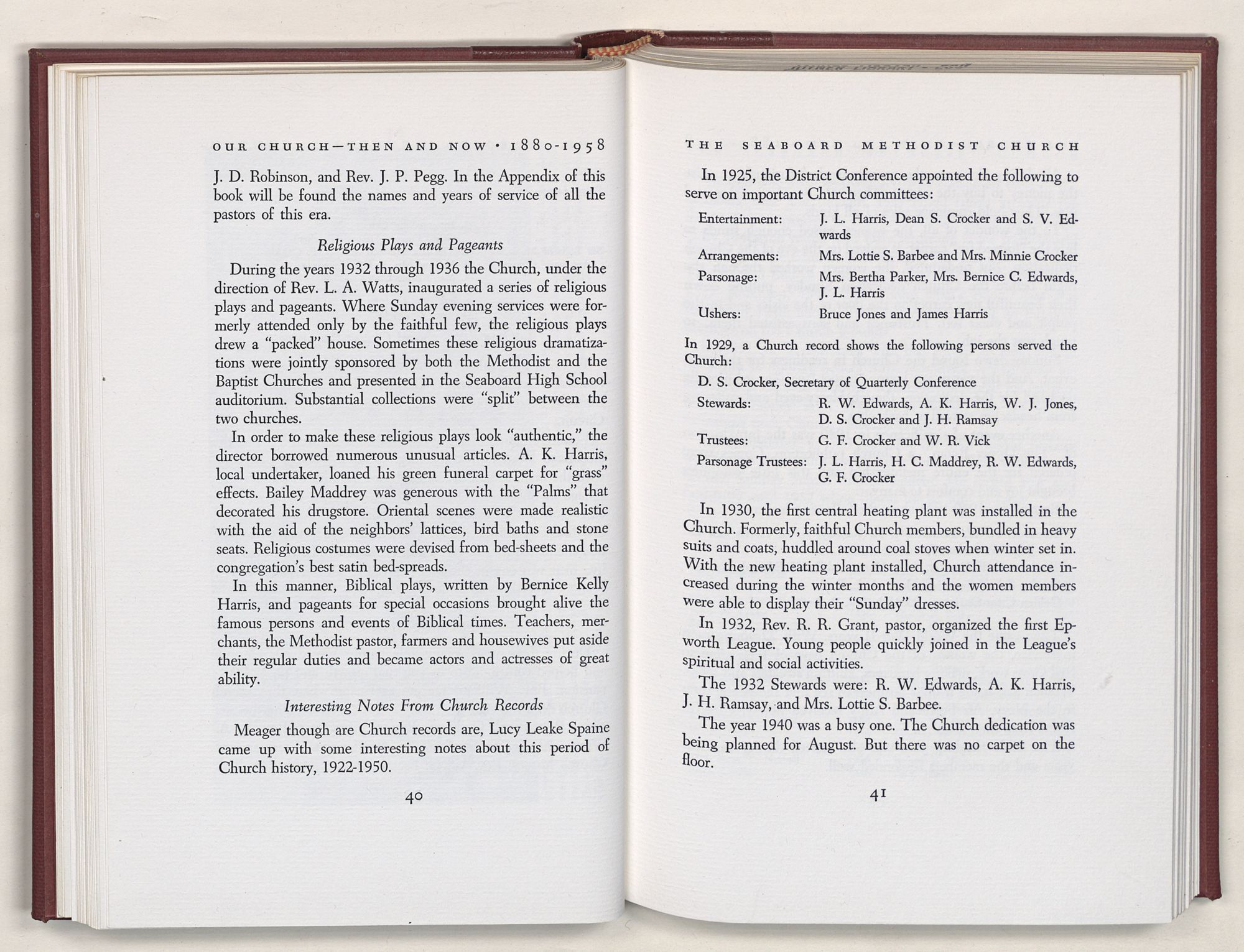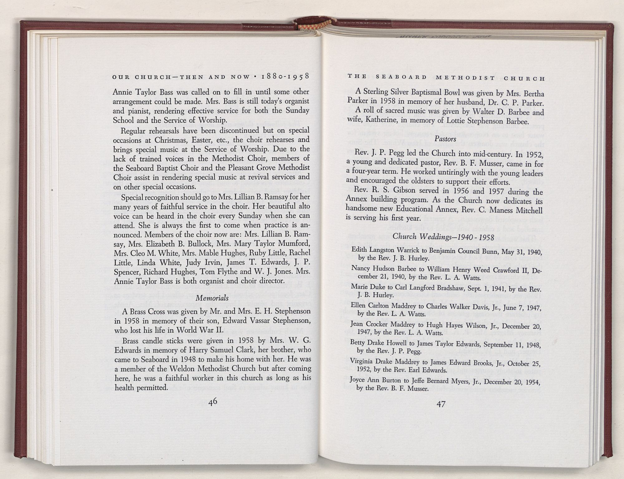 Nevertheless, it is our belief that the history of the Seaboard Methodist Church as related within these pages is basically factual. Furthermore, we believe this booklet will stimulate our Church officials and its members to keep more accurate records as well as more personal history of their families. Emerson, the great American essayist, once said: “There is properly no history, only biography.”
