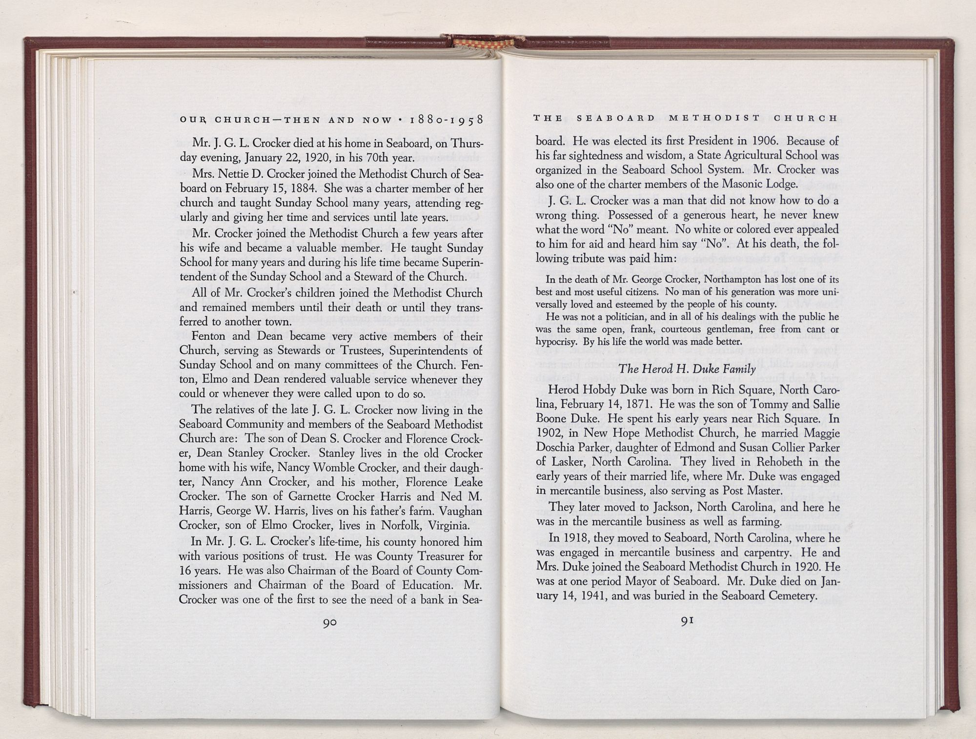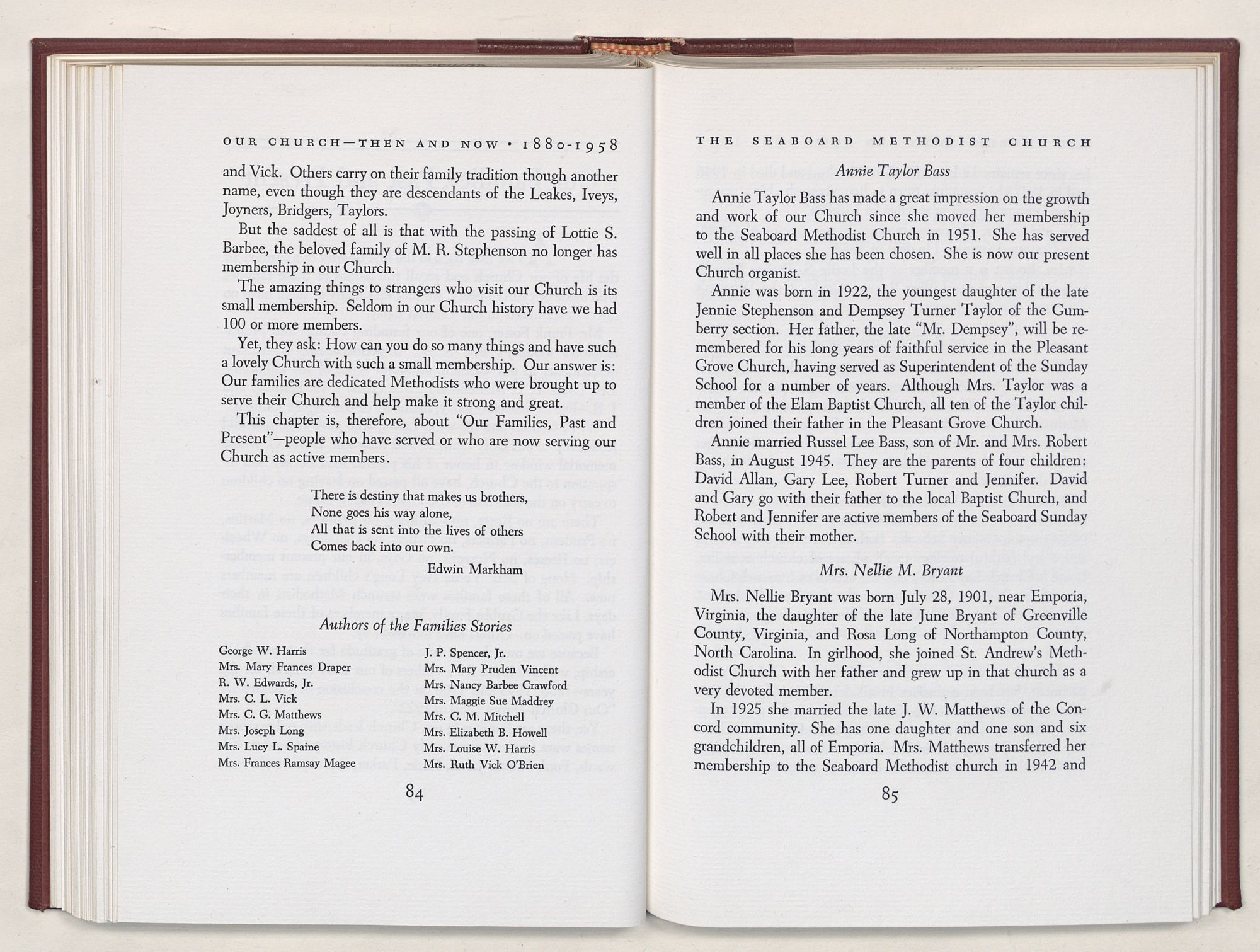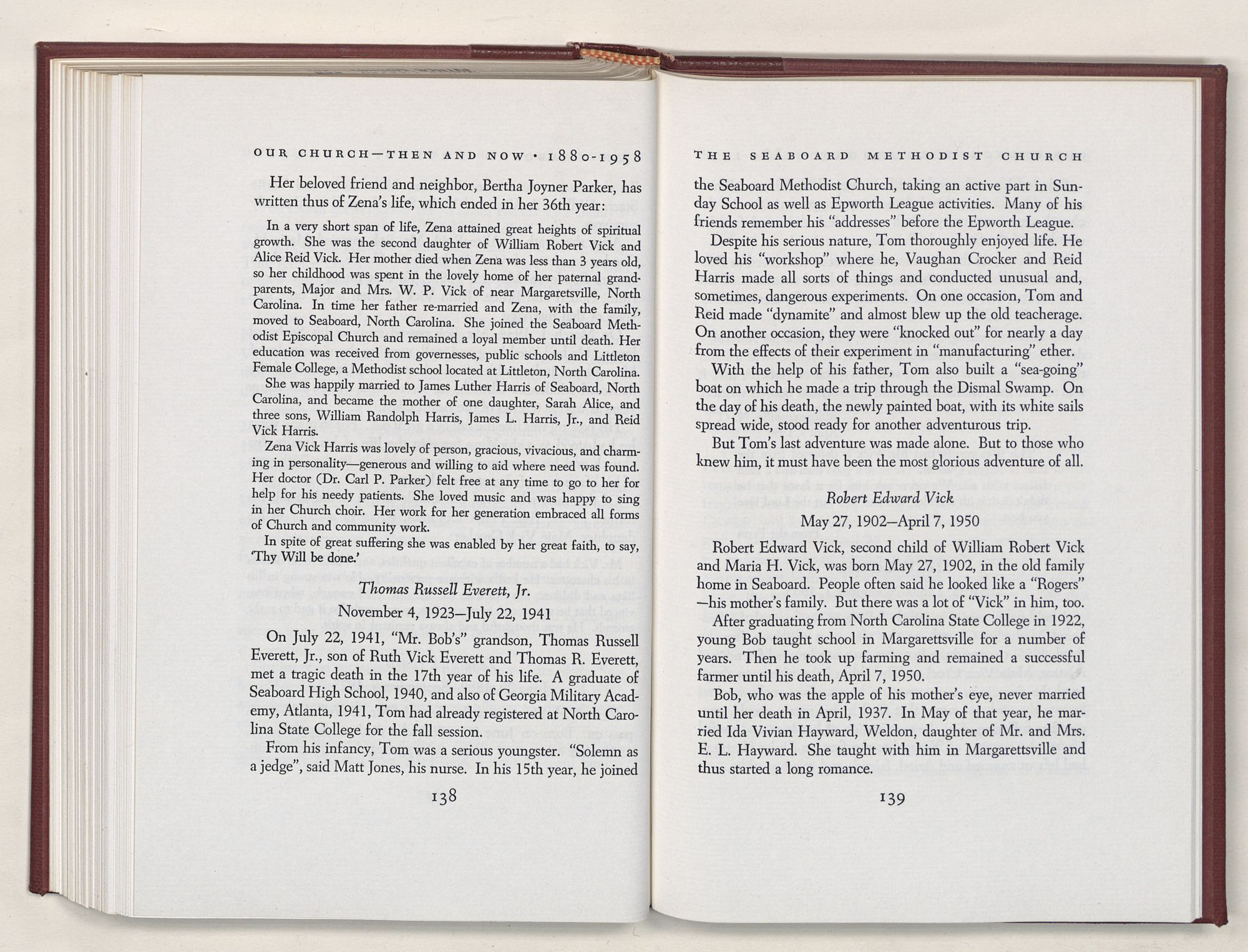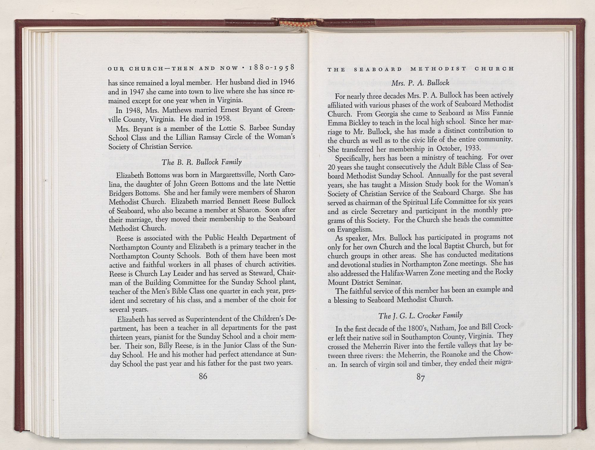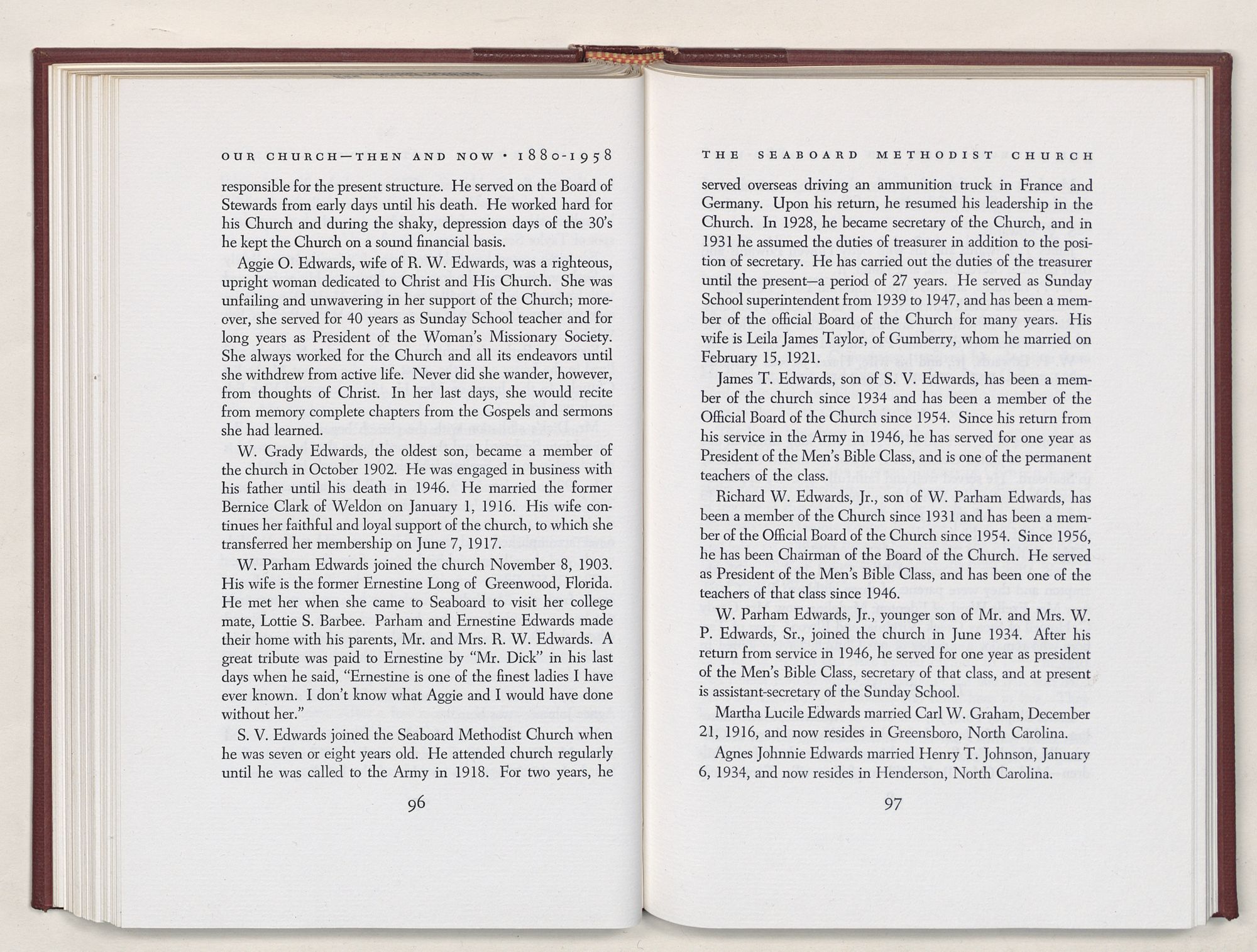 Nevertheless, it is our belief that the history of the Seaboard Methodist Church as related within these pages is basically factual. Furthermore, we believe this booklet will stimulate our Church officials and its members to keep more accurate records as well as more personal history of their families. Emerson, the great American essayist, once said: “There is properly no history, only biography.”