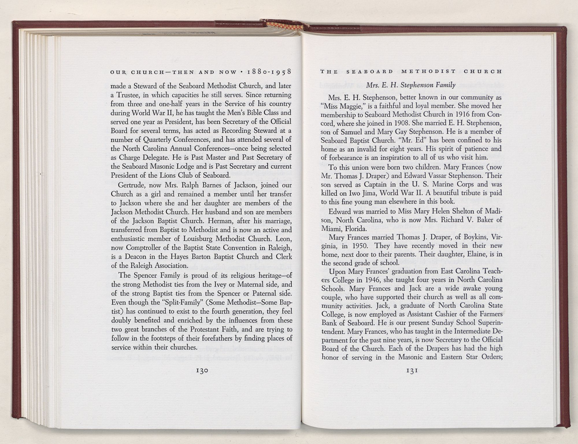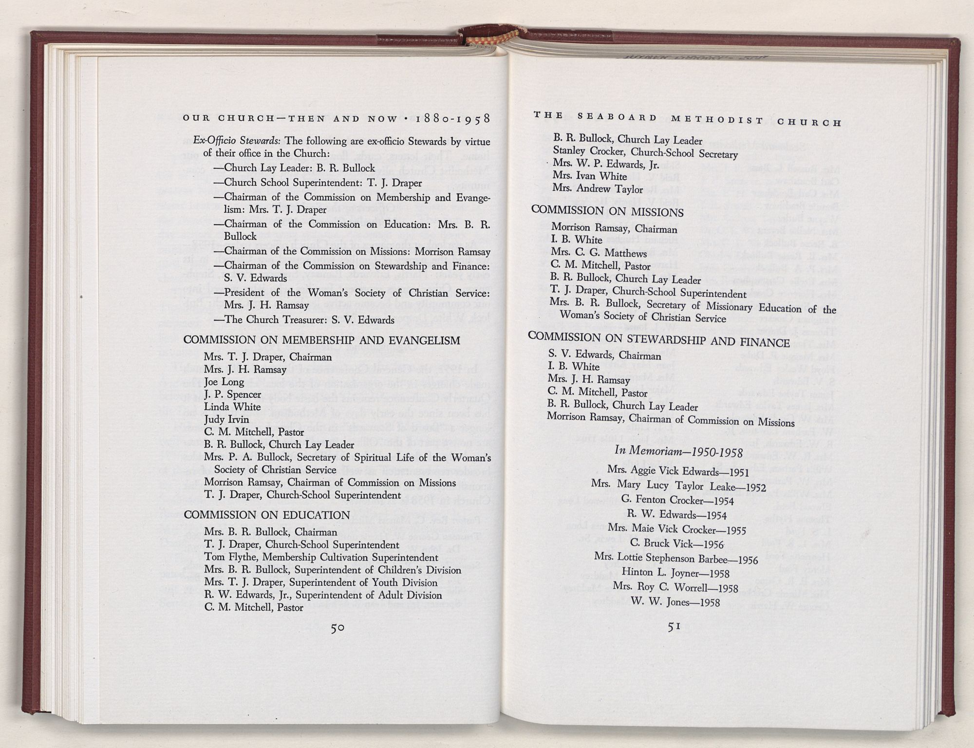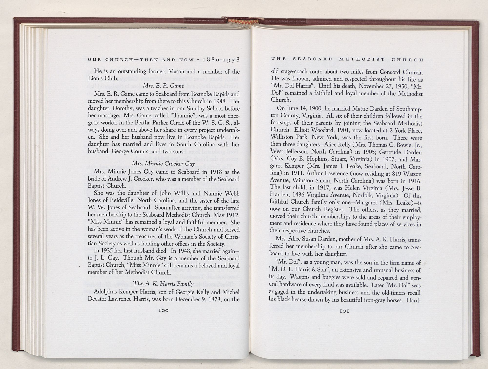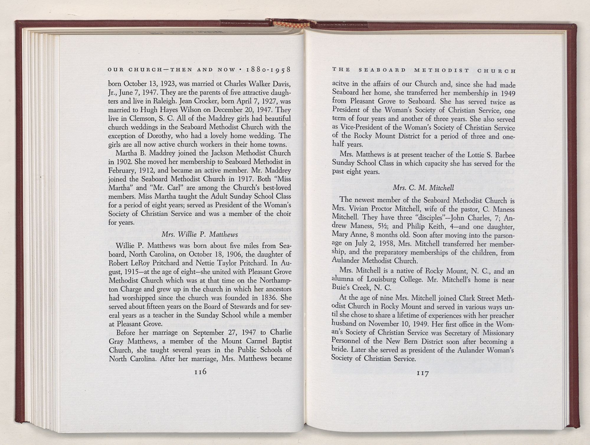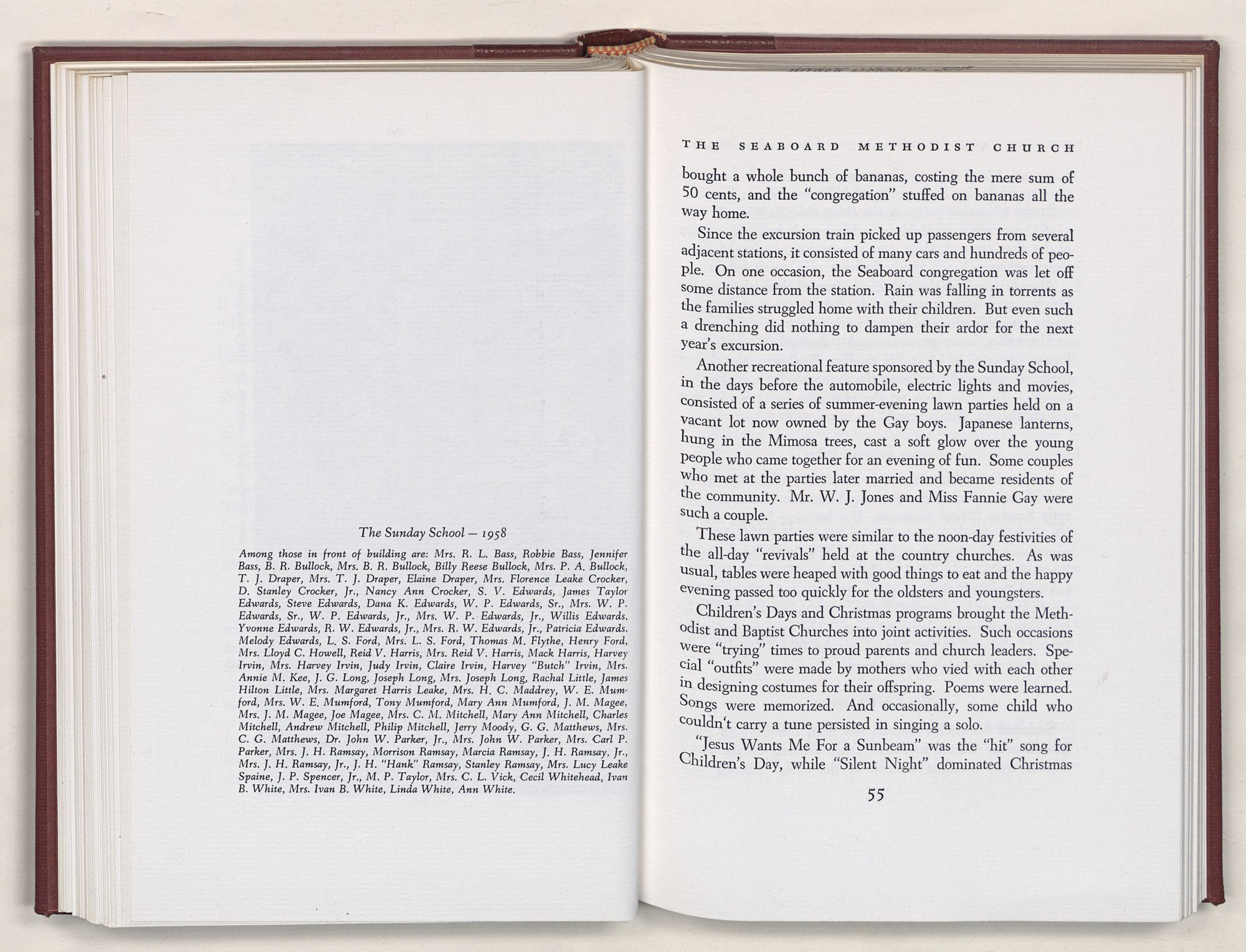 Nevertheless, it is our belief that the history of the Seaboard Methodist Church as related within these pages is basically factual. Furthermore, we believe this booklet will stimulate our Church officials and its members to keep more accurate records as well as more personal history of their families. Emerson, the great American essayist, once said: “There is properly no history, only biography.”