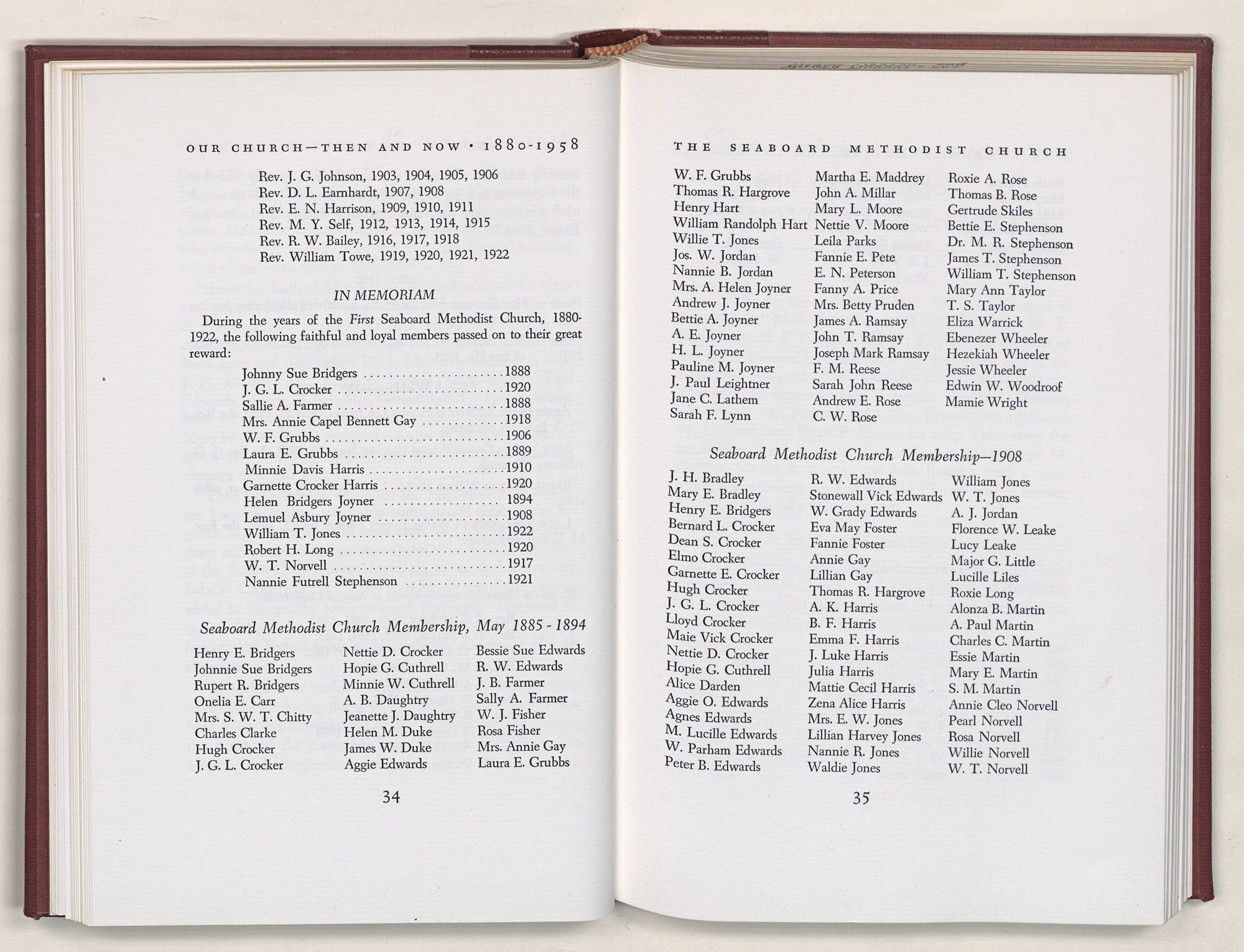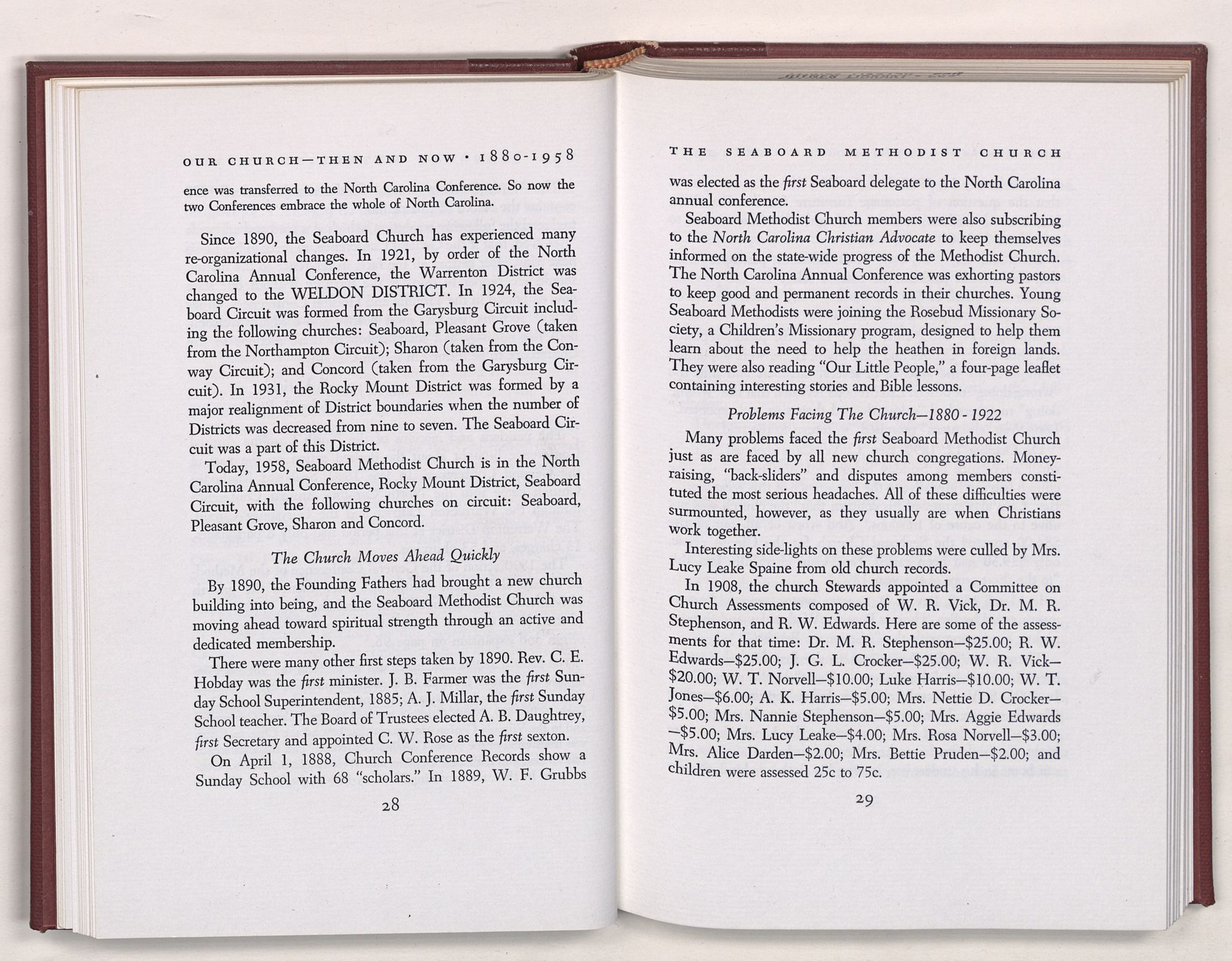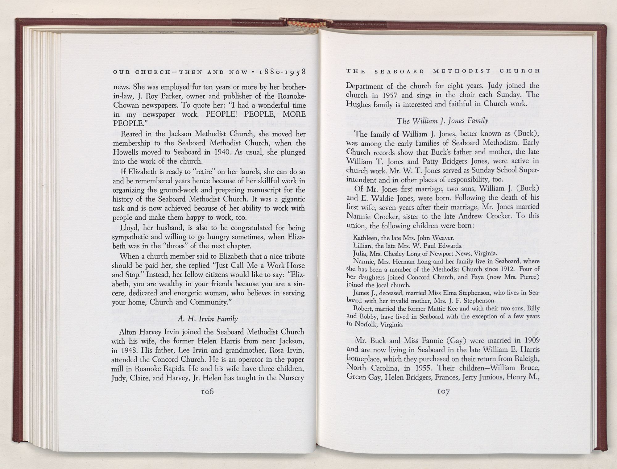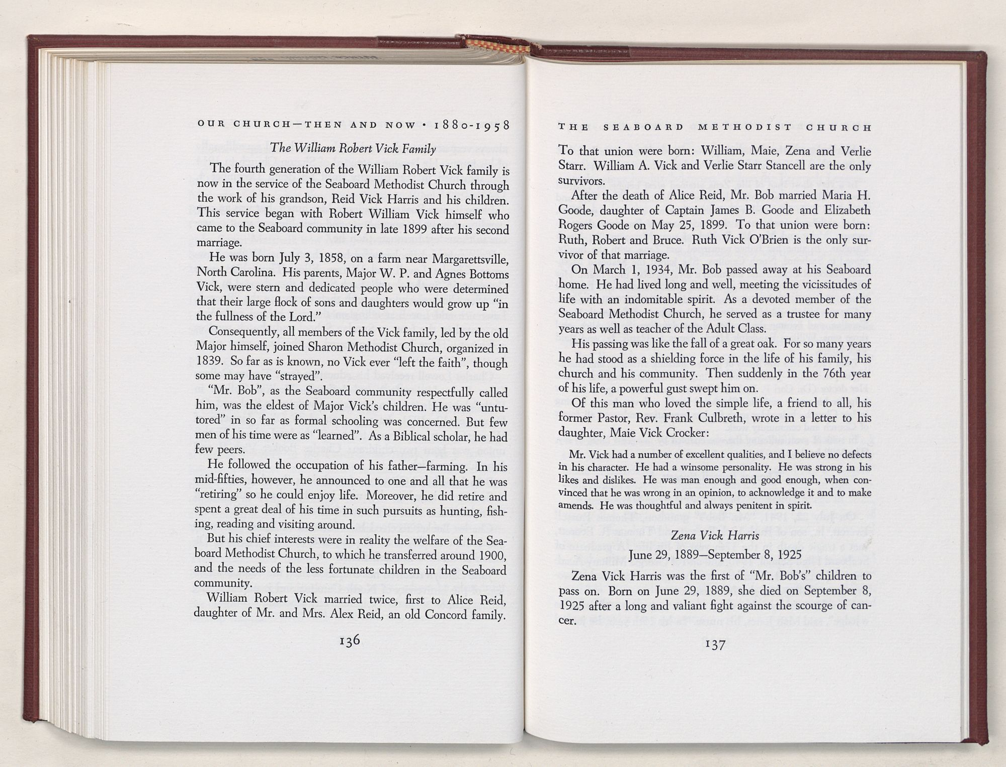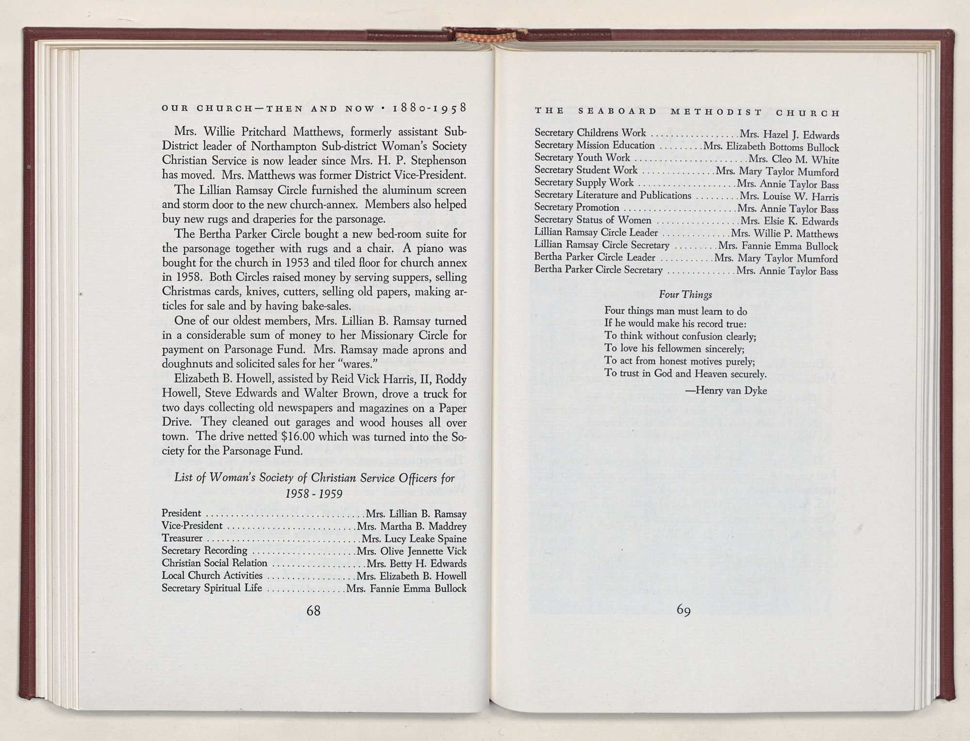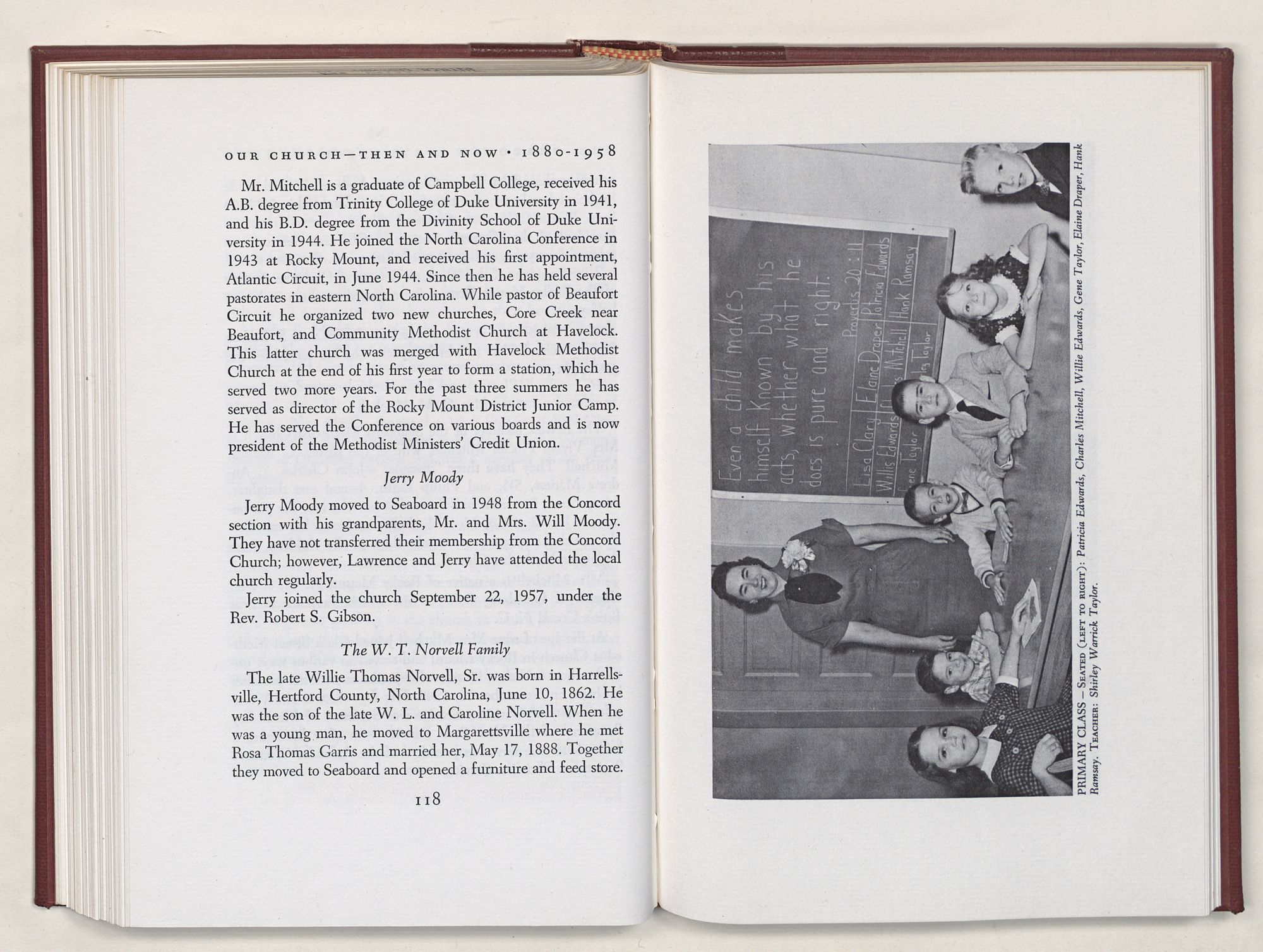 Nevertheless, it is our belief that the history of the Seaboard Methodist Church as related within these pages is basically factual. Furthermore, we believe this booklet will stimulate our Church officials and its members to keep more accurate records as well as more personal history of their families. Emerson, the great American essayist, once said: “There is properly no history, only biography.”