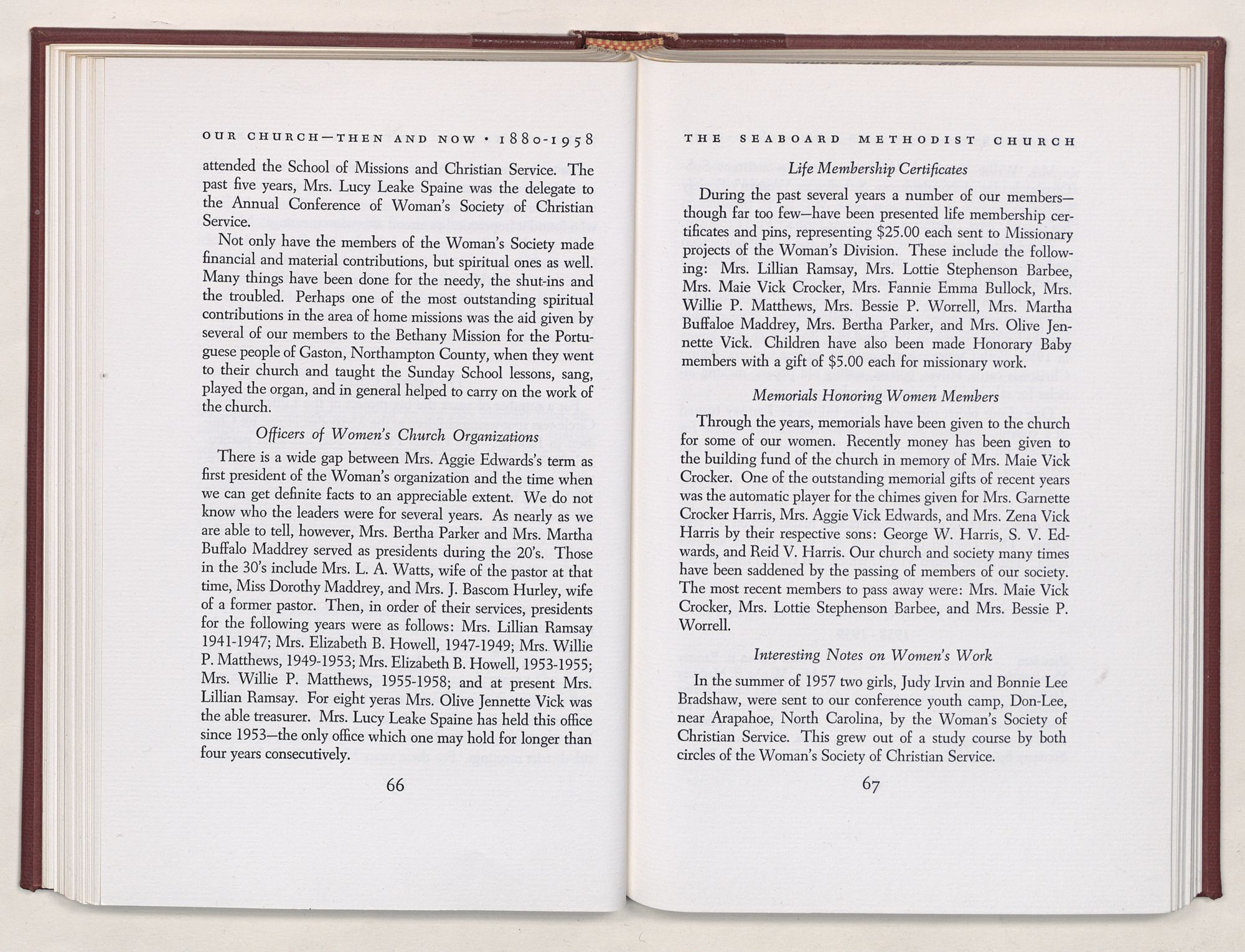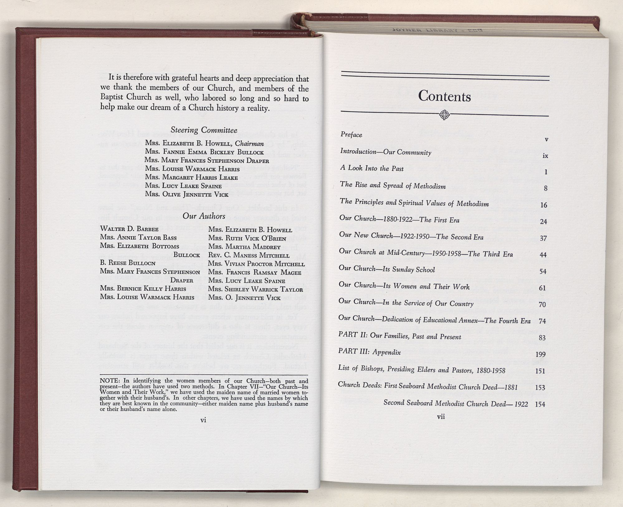 NOTE: In identifying the women members of our Church—both past and present—the authors have used two methods. In Chapter VII—“Our Church—Its Women and Their Work,” we have used the maiden name of married women together with their husband's. In other chapters, we have used the names by which they are best known in the community—either maiden name plus husband's name or their husband's name alone.