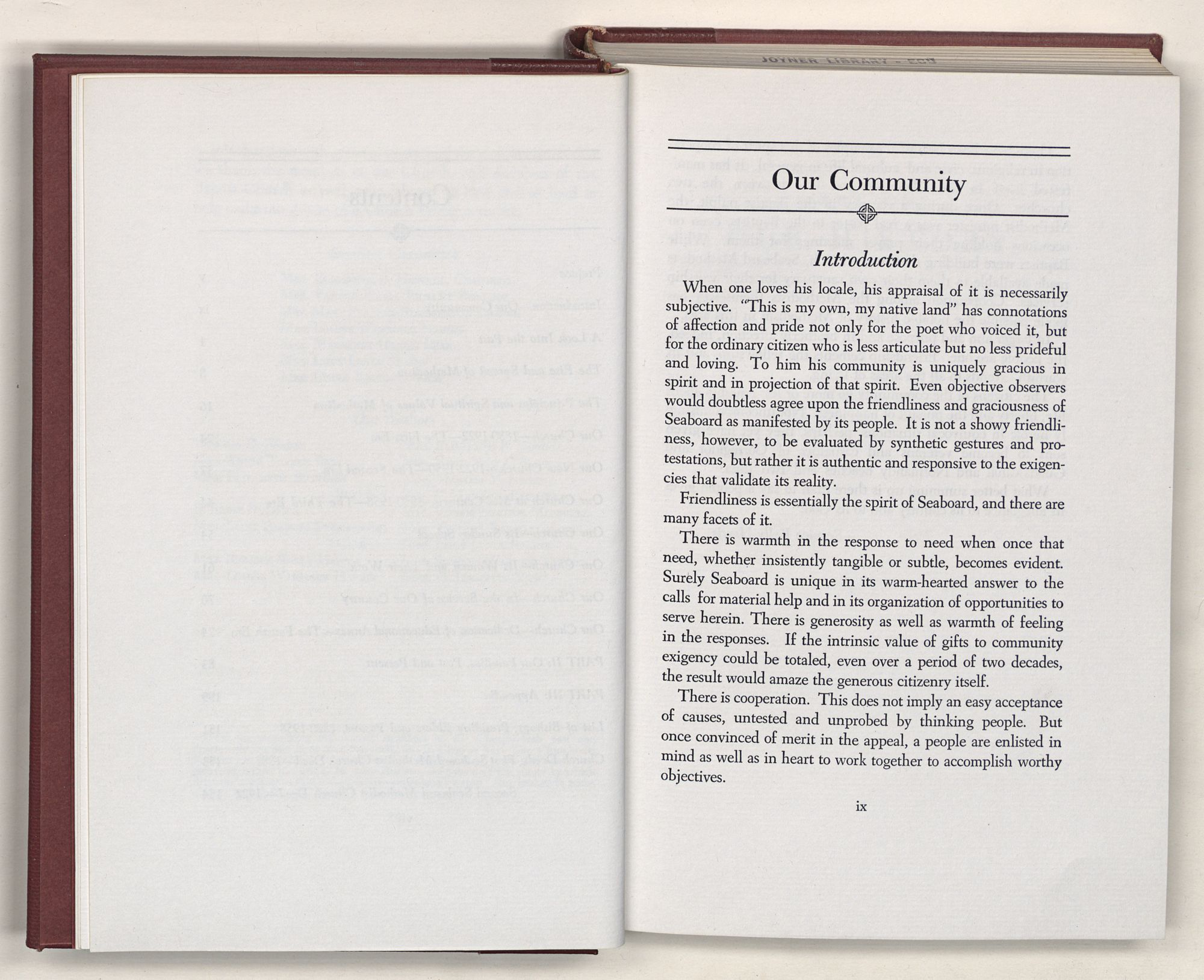 When one loves his locale, his appraisal of it is necessarily subjective. “This is my own, my native land” has connotations of affection and pride not only for the poet who voiced it, but for the ordinary citizen who is less articulate but no less prideful and loving. To him his community is uniquely gracious in spirit and in projection of that spirit. Even objective observers would doubtless agree upon the friendliness and graciousness of Seaboard as manifested by its people. It is not a showy friendliness, however, to be evaluated by synthetic gestures and protestations, but rather it is authentic and responsive to the exigencies that validate its reality.