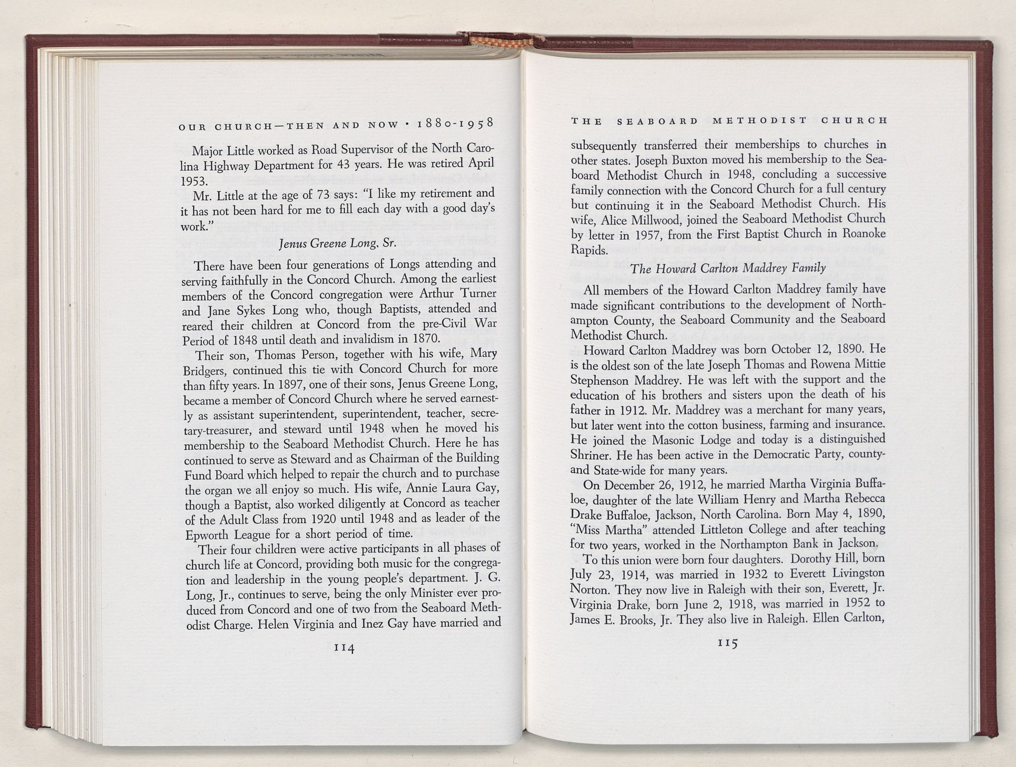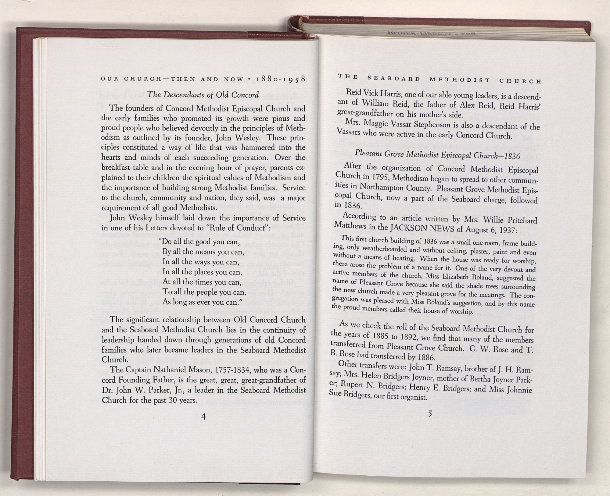 “Do all the good you can,By all the means you can,In all the ways you can,In all the places you can,At all the times you can,To all the people you can,As long as ever you can.”The significant relationship between Old Concord Church and the Seaboard Methodist Church lies in the continuity of leadership handed down through generations of old Concord families who later became leaders in the Seaboard Methodist Church.