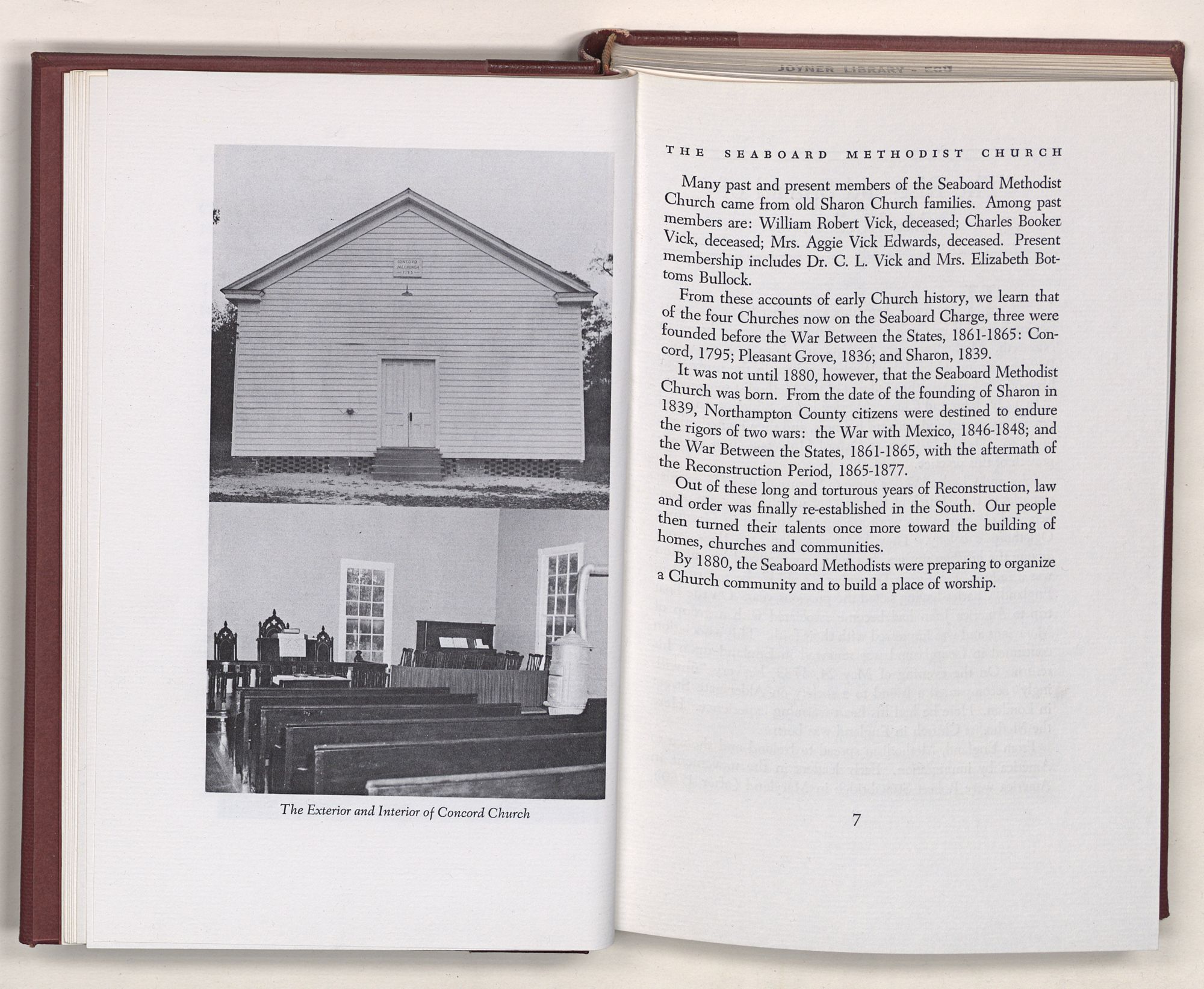From these accounts of early Church history, we learn that of the four Churches now on the Seaboard Charge, three were founded before the War Between the States, 1861-1865: Concord, 1795; Pleasant Grove, 1836; and Sharon, 1839.