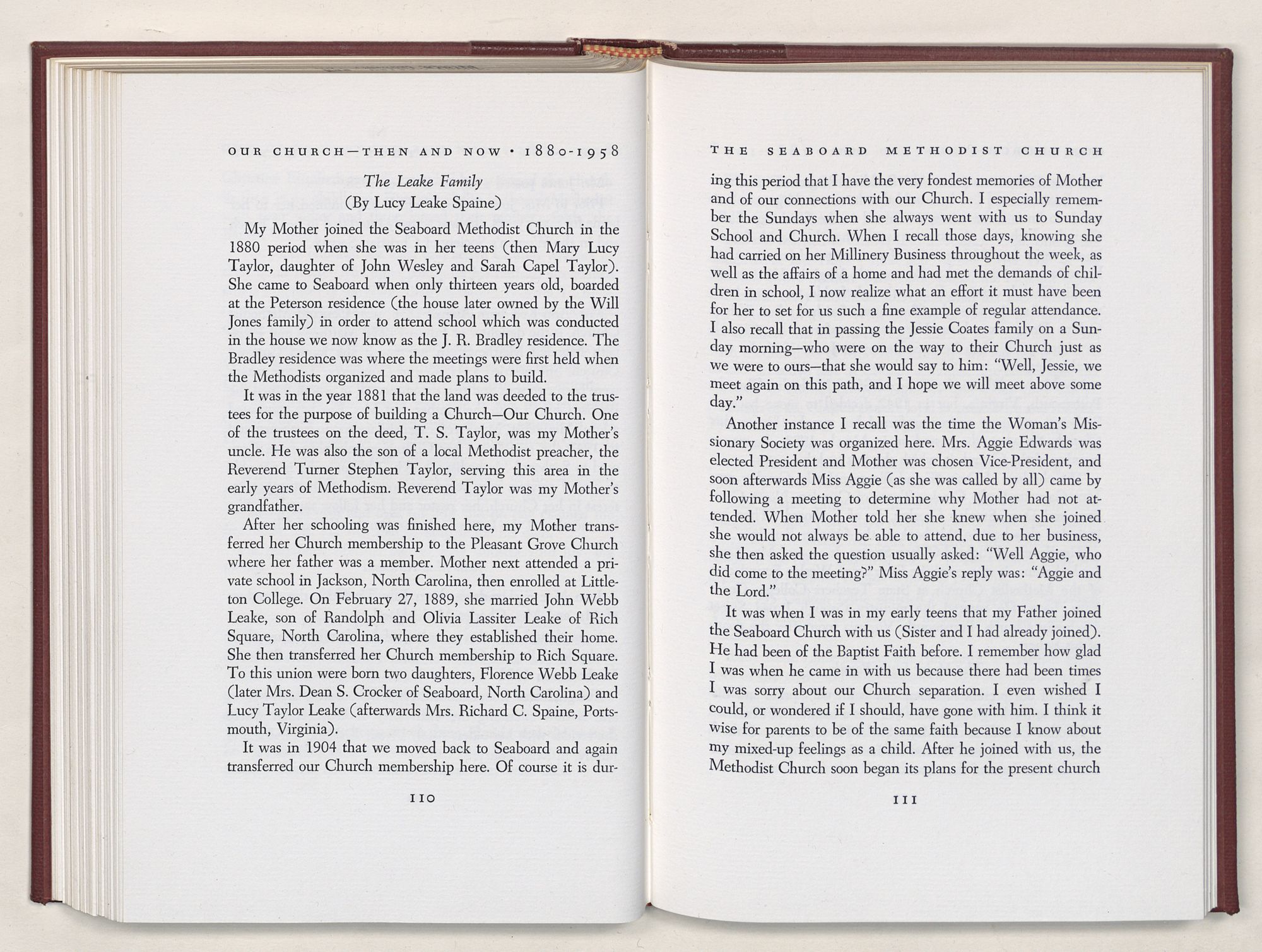 T. S. Taylor, a member of Seaboard Methodist Episcopal Church's first Board of Trustees, came from Pleasant Grove. He was the son of Rev. Turner S. Taylor, the great-grandfather of Lucy Leake Spaine and Florence Leake Crocker.