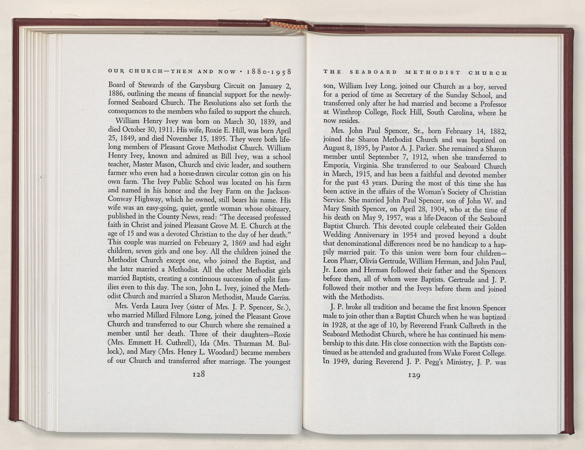 W. H. Ivey, another member of Seaboard's first Board of Trustees, was a Pleasant Grove transfer. Mr. Ivey was the father of Mrs. J. P. Spencer and Mrs. Millard Long, devoted Seaboard members, and the grandfather of J. P. Spencer, Jr., now on the Seaboard Official Board.