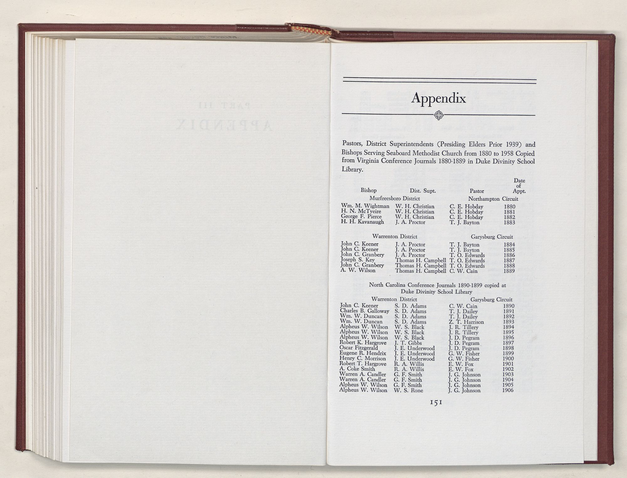 | List of Bishops, Presiding Elders and Pastors, 1880-1958 | 151 |