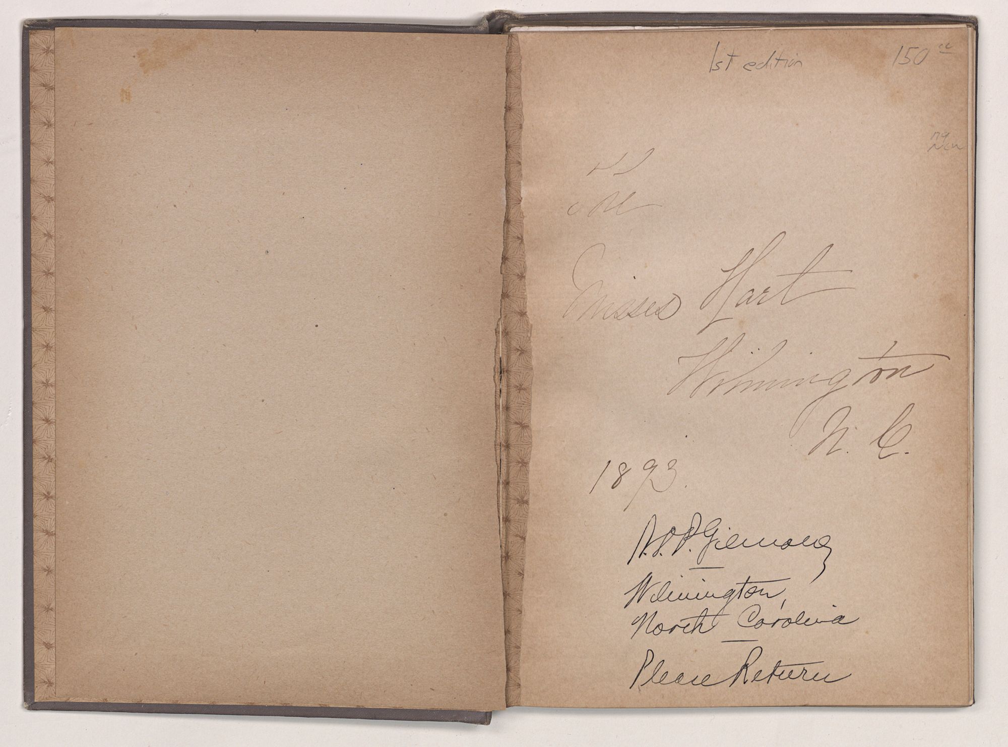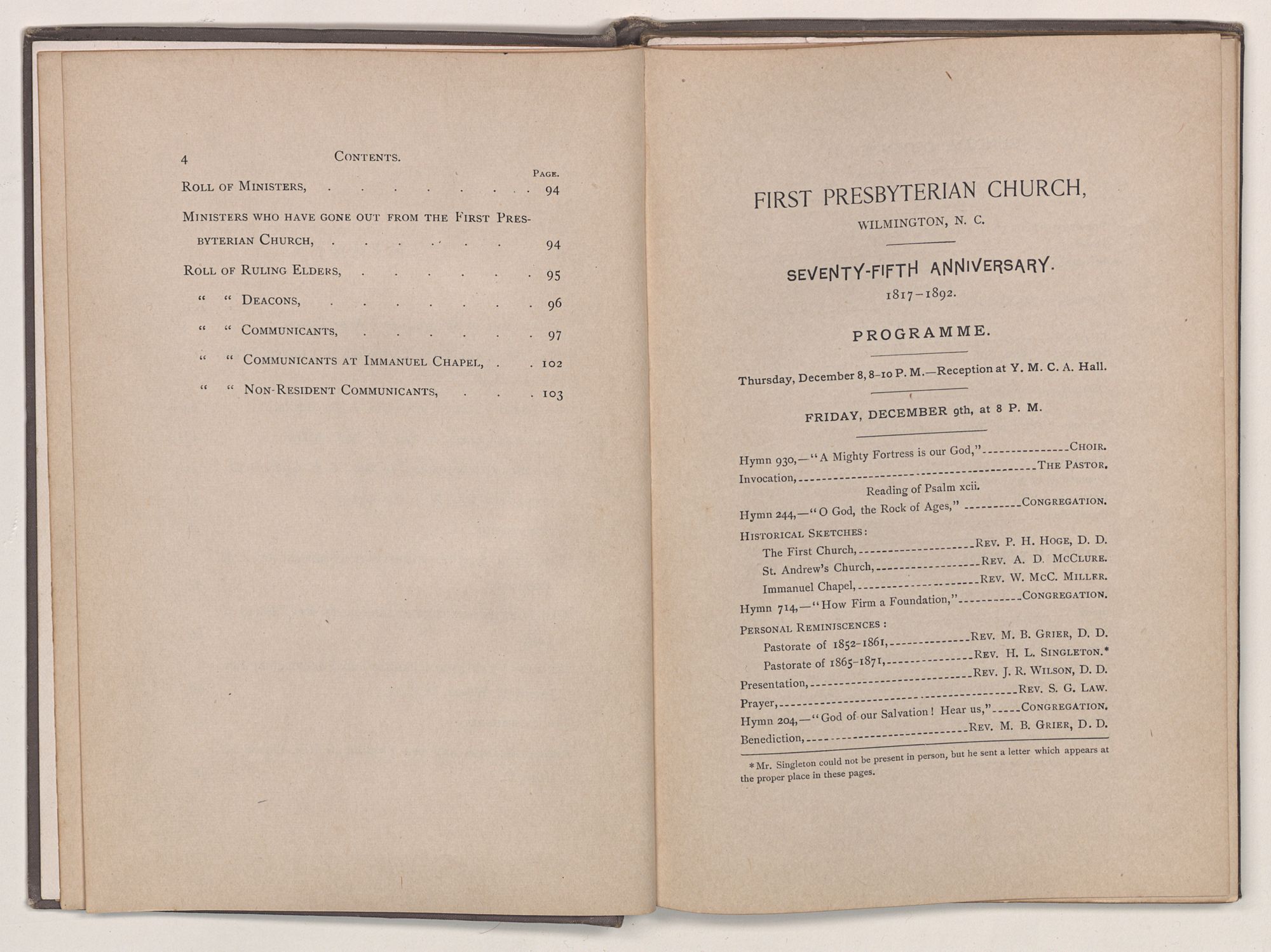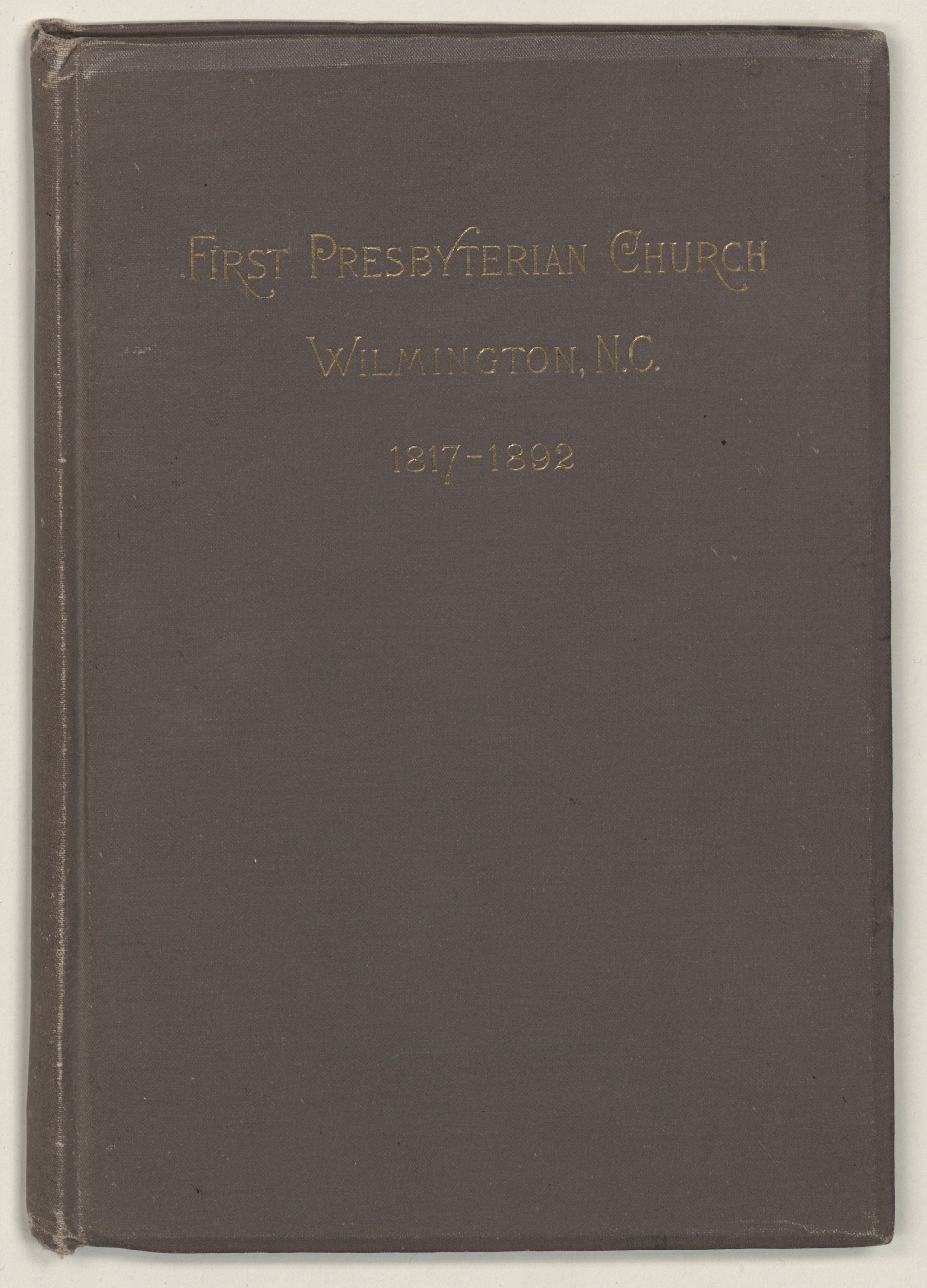 Memorial of the First Presbyterian Church, Wilmington, N. C. Seventy-fifth anniversary. 1817-1892. Richmond : Whittet & Shepperson, 1893. 101, [2] p. front., plates, ports. 21 cm. Cover title: First Presbyterian Church, Wilmington, N.C., 1817-1892.