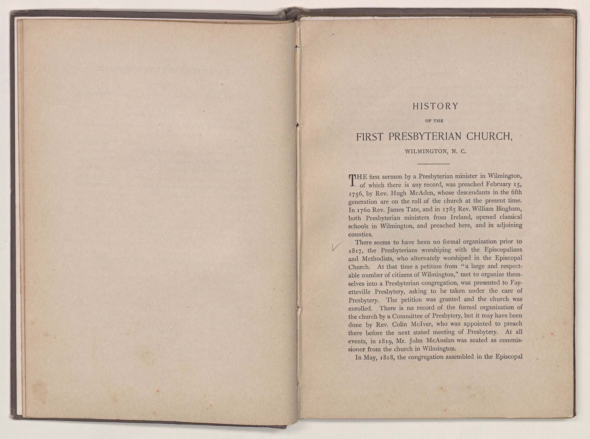 THE first sermon by a Presbyterian minister in Wilmington, of which there is any record, was preached February 15, 1756, by Rev. Hugh McAden, whose descendants in the fifth generation are on the roll of the church at the present time. In 1760 Rev. James Tate, and in 1785 Rev. William Bingham, both Presbyterian ministers from Ireland, opened classical schools in Wilmington, and preached here, and in adjoining counties.