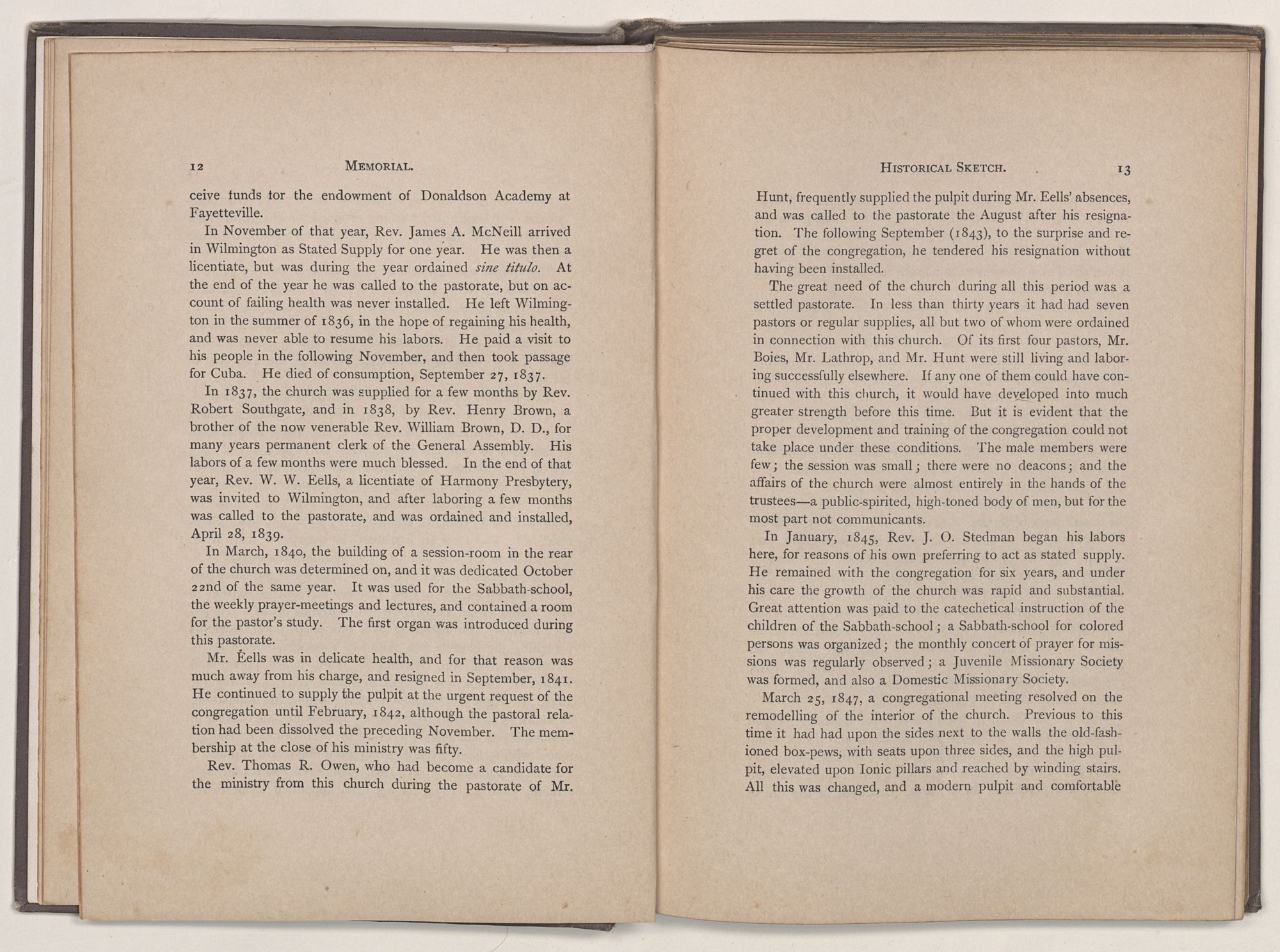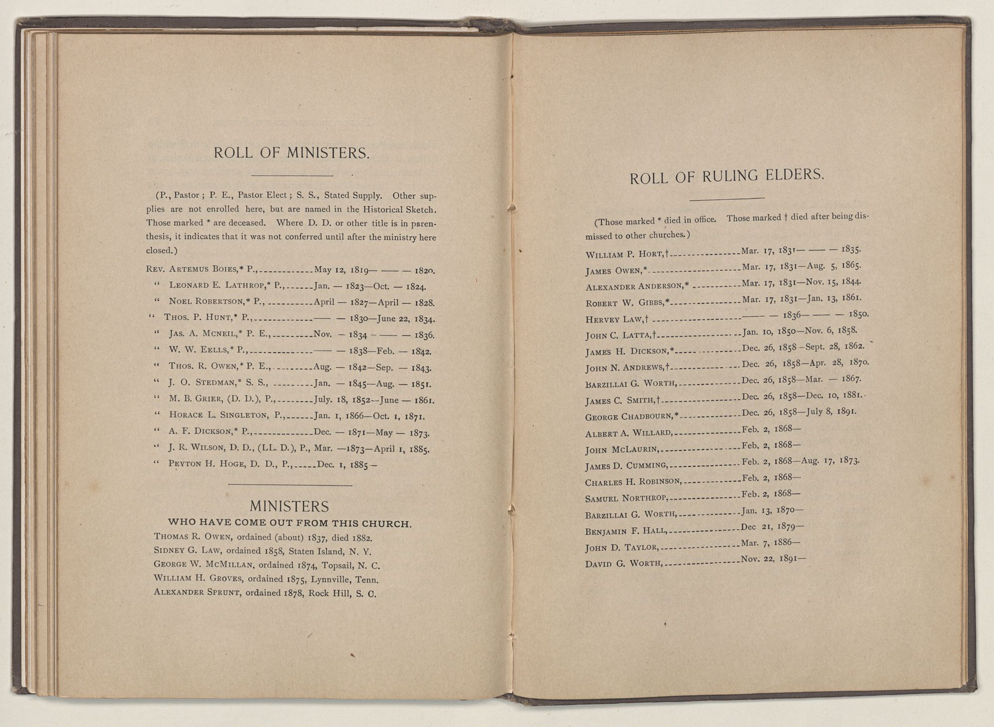 On May 12, 1819, Rev. Artemus Boies, a licentiate, having been duly and unanimously called, was regularly ordained and installed pastor of the church by Fayetteville Presbytery, convened there for the purpose.