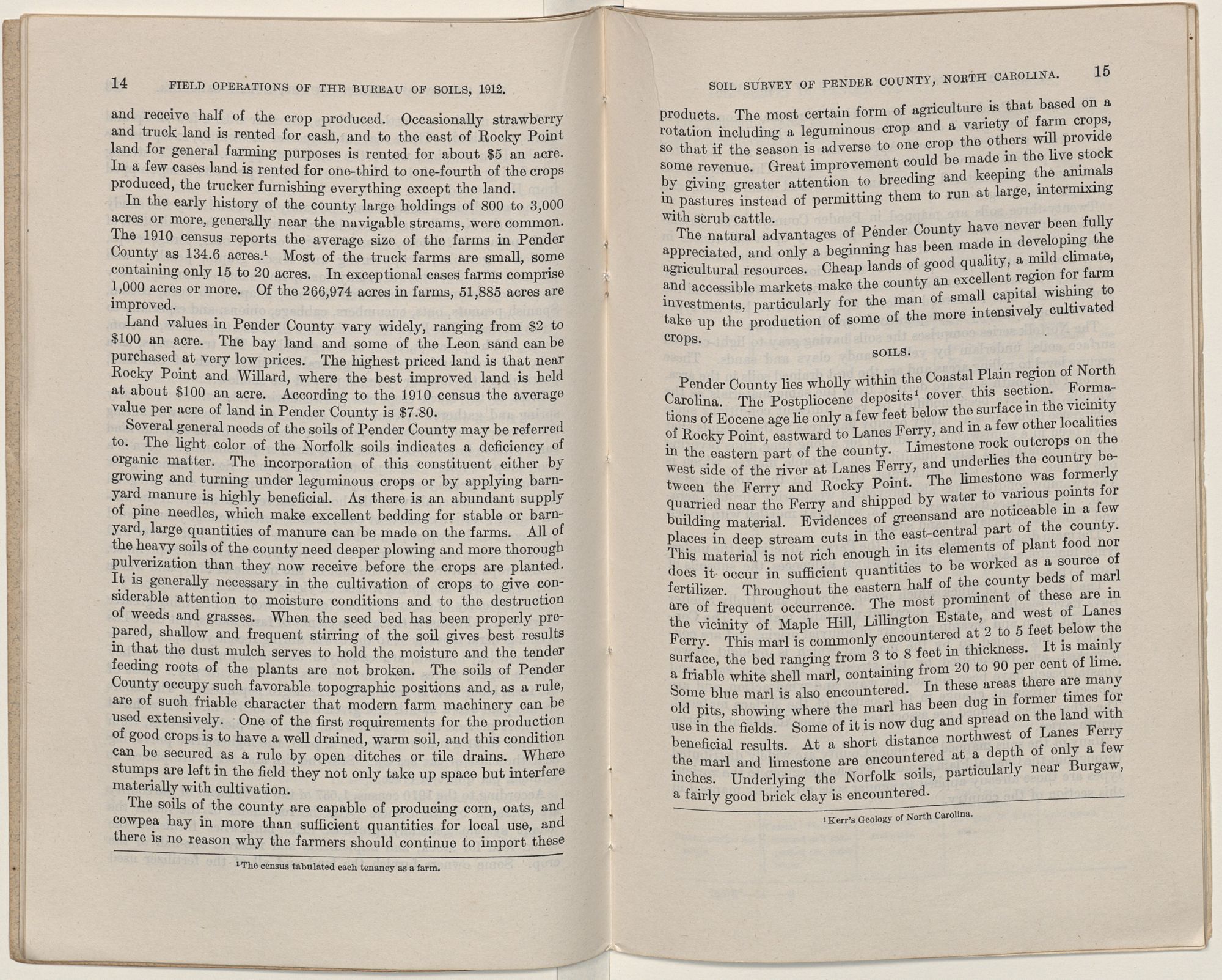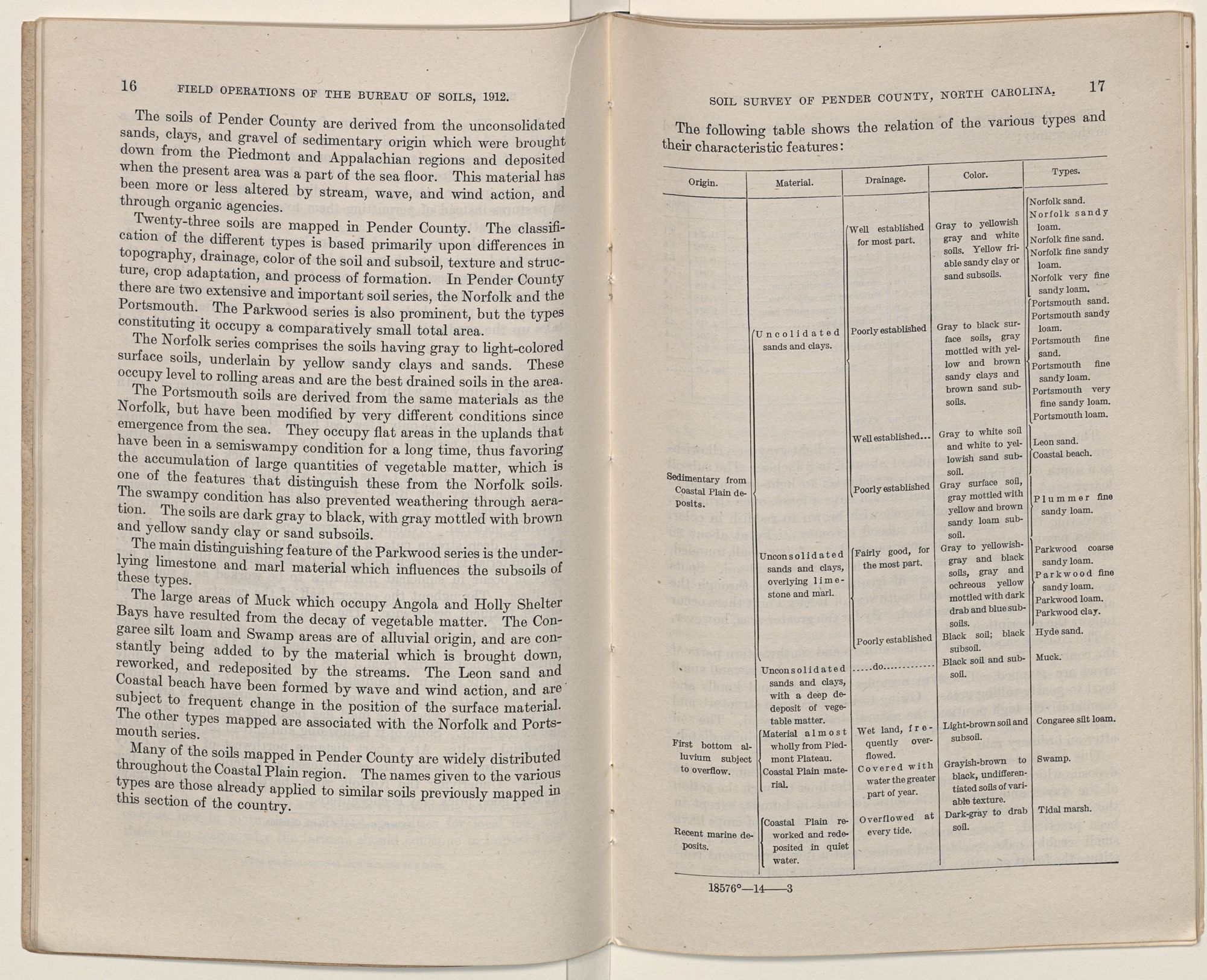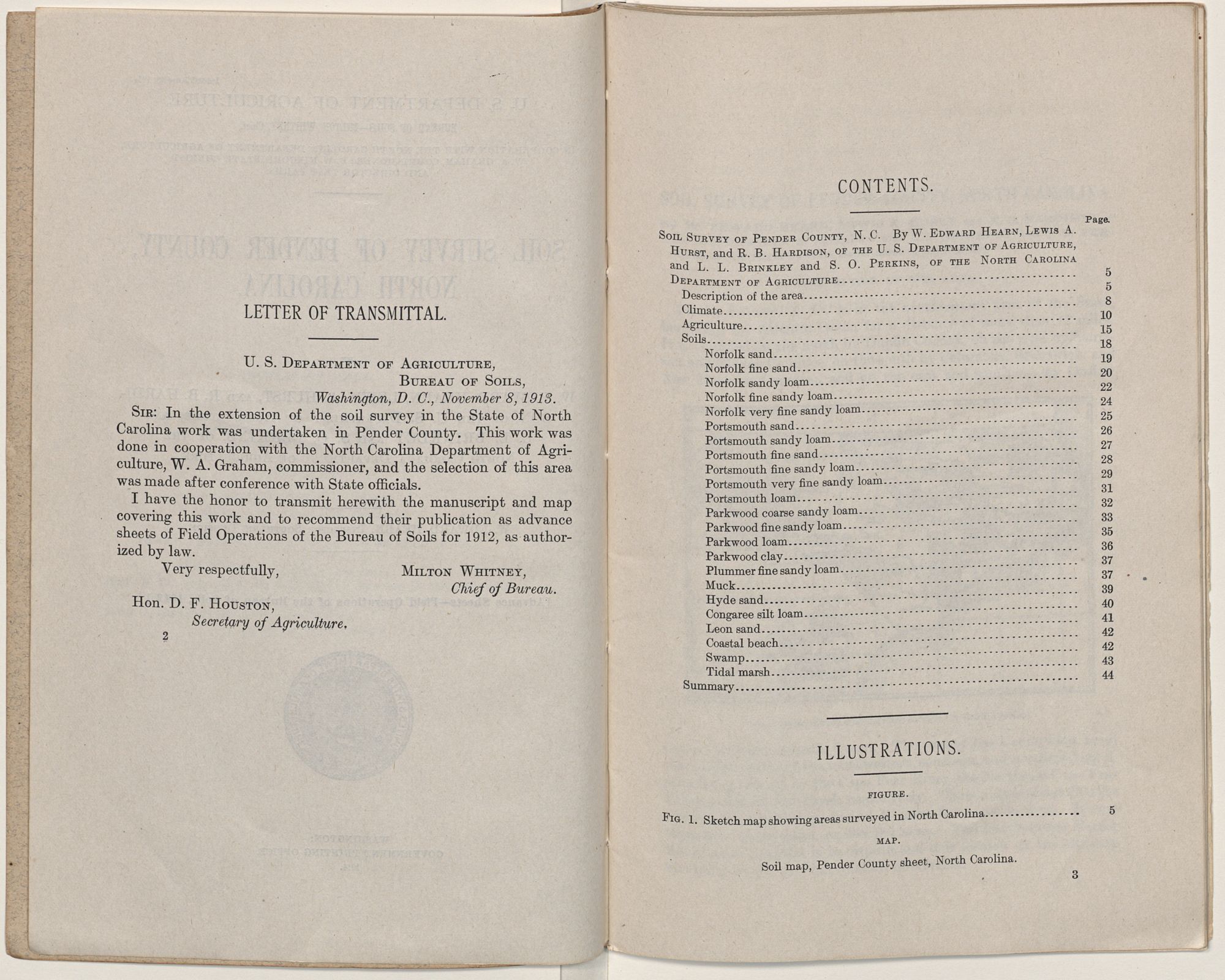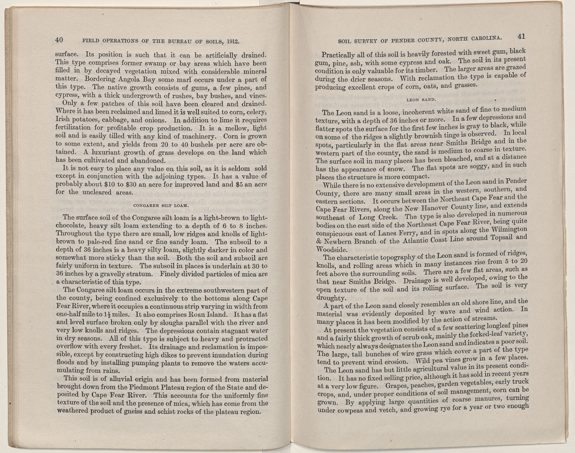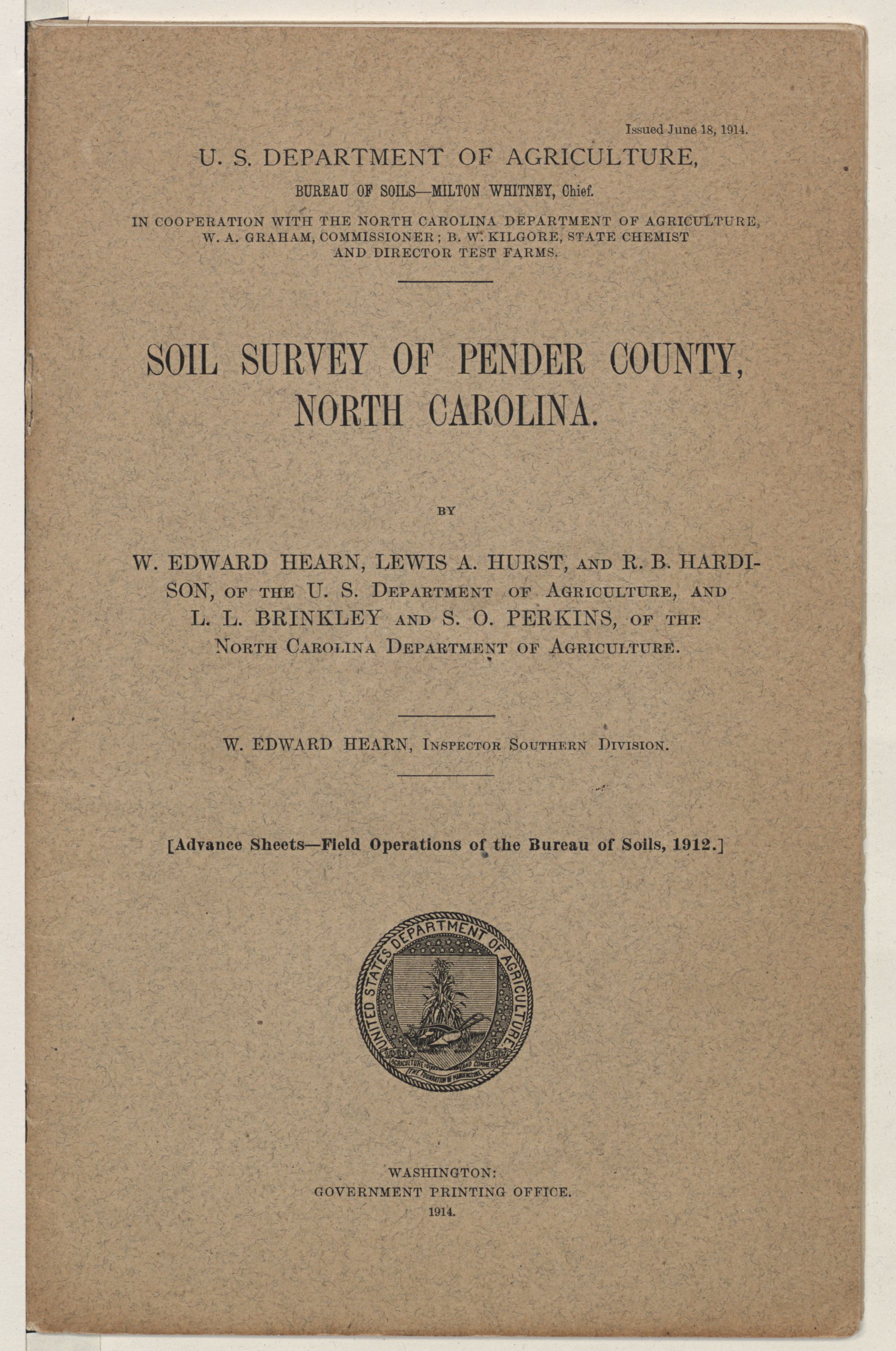 Issued June 18, 1914. U. S. DEPARTMENT OF AGRICULTURE, BUREAU OF SOILS—MILTON WHITNEY, Chief. IN COOPERATION WITH THE NORTH CAROLINA DEPARTMENT OF AGRICULTURE, W. A. GRAHAM, COMMISSIONER; B. W. KILGORE, STATE CHEMIST AND DIRECTOR TEST FARMS.SOIL SURVEY OF PENDER COUNTY, NORTH CAROLINA.BY W. EDWARD HEARN, LEWIS A. HURST, AND R. B. HARDI- SON, OF THE U. S. DEPARTMENT OF AGRICULTURE, AND L. L. BRINKLEY AND S. O. PERKINS, OF THE NORTH CAROLINA DEPARTMENT OF AGRICULTURE.W. EDWARD HEARN, INSPECTOR SOUTHERN DIVISION. [Advance Sheets—Field Operations of the Bureau of Soils, 1912.]United States Department of Agriculture 1862 Agriculture is the Foundation of Manufacture and Commerce 1889Seal of the United States Department of AgricultureWASHINGTON:GOVERNMENT PRINTING OFFICE.1914.