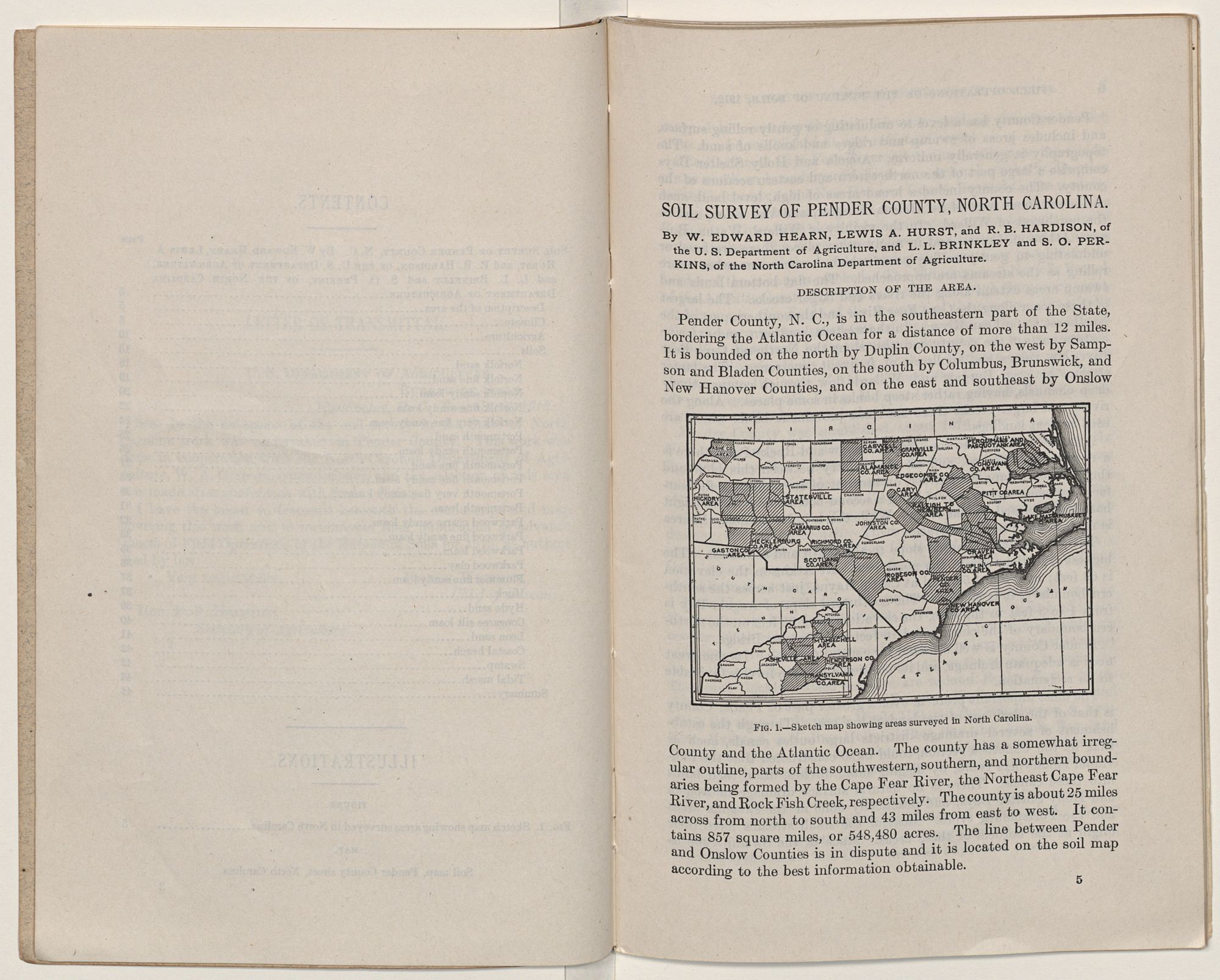 | SOIL SURVEY OF PENDER COUNTY, N. C. By W. EDWARD HEARN, LEWIS A. HURST, and R. B. HARDISON, OF THE U. S. DEPARTMENT OF AGRICULTURE, and L. L. BRINKLEY and S. O. PERKINS, OF THE NORTH CAROLINA DEPARTMENT OF AGRICULTURE | 5 |