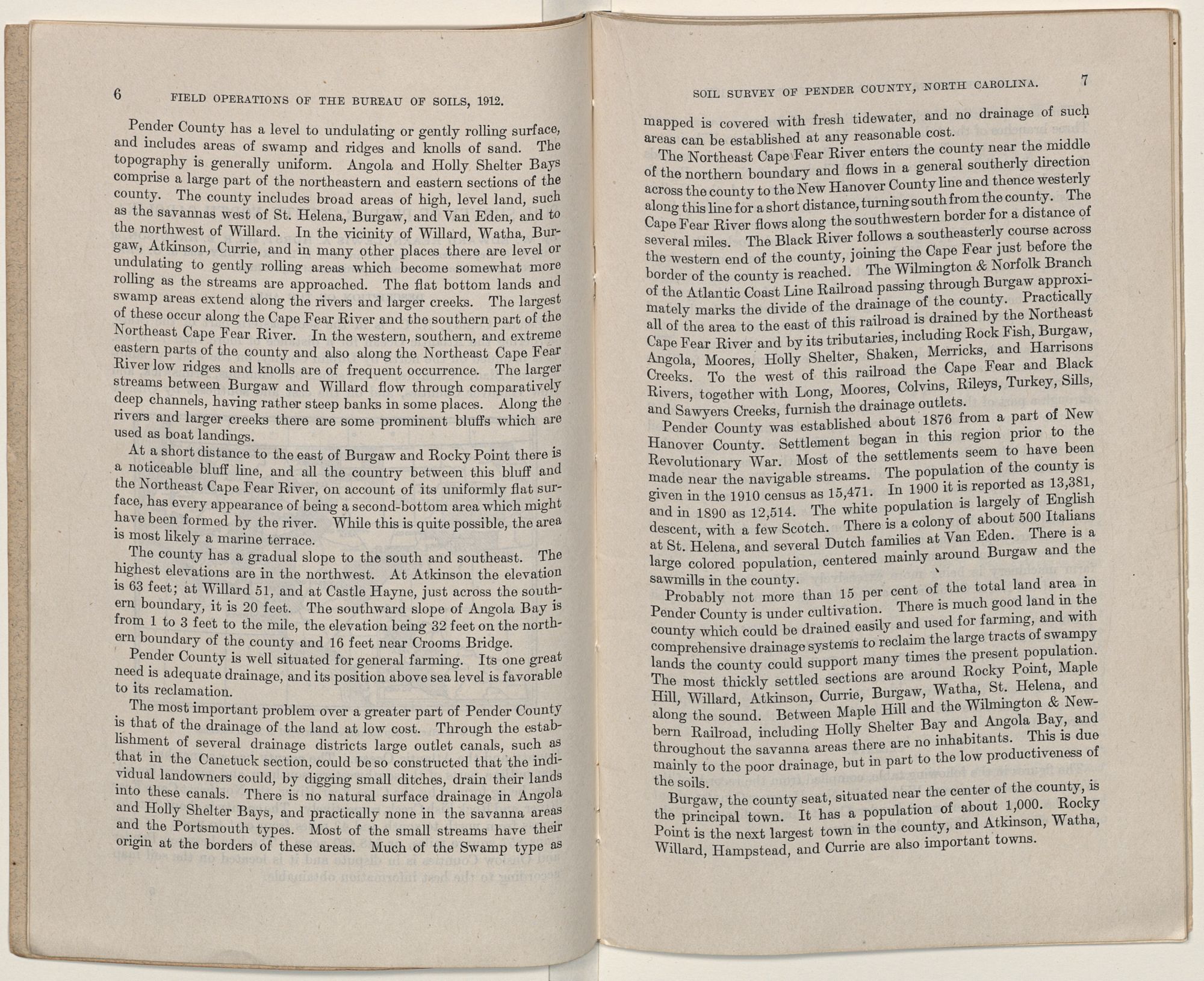 Probably not more than 15 per cent of the total land area in Pender County is under cultivation. There is much good land in the county which could be drained easily and used for farming, and with comprehensive drainage systems to reclaim the large tracts of swampy lands the county could support many times the present population. The most thickly settled sections are around Rocky Point, Maple Hill, Willard, Atkinson, Currie, Burgaw, Watha, St. Helena, and along the sound. Between Maple Hill and the Wilmington & Newbern Railroad, including Holly Shelter Bay and Angola Bay, and throughout the savanna areas there are no inhabitants. This is due mainly to the poor drainage, but in part to the low productiveness of the soils.