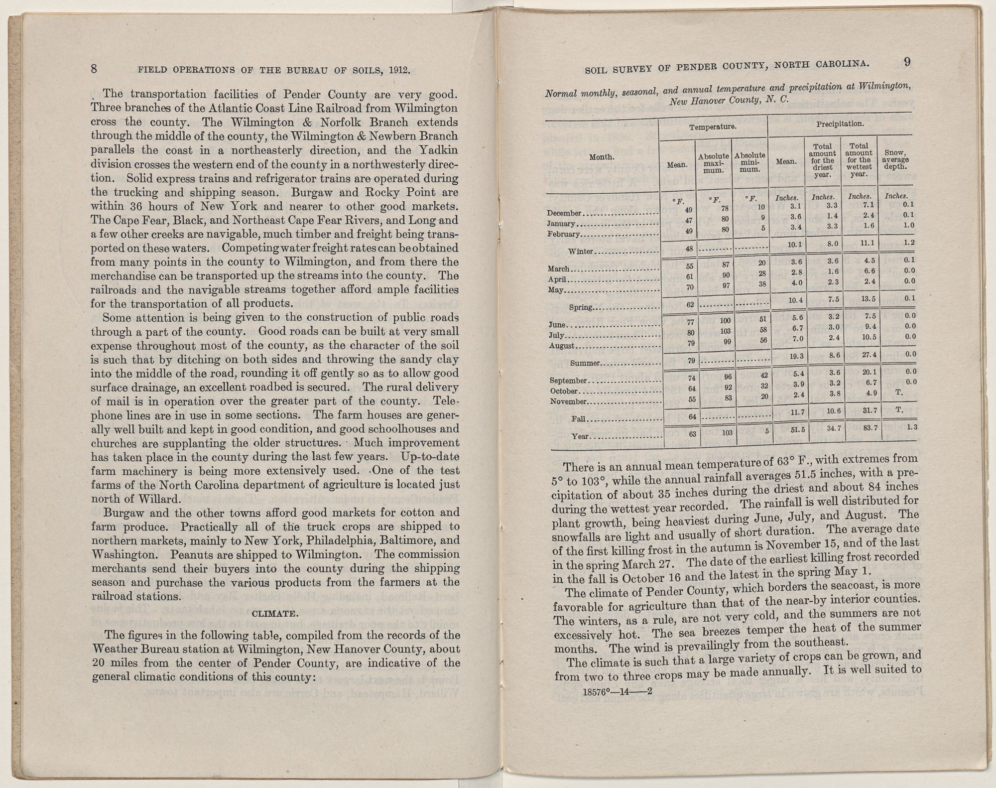 CLIMATE.The figures in the following table, compiled from the records of the Weather Bureau station at Wilmington, New Hanover County, about 20 miles from the center of Pender County, are indicative of the general climatic conditions of this county: