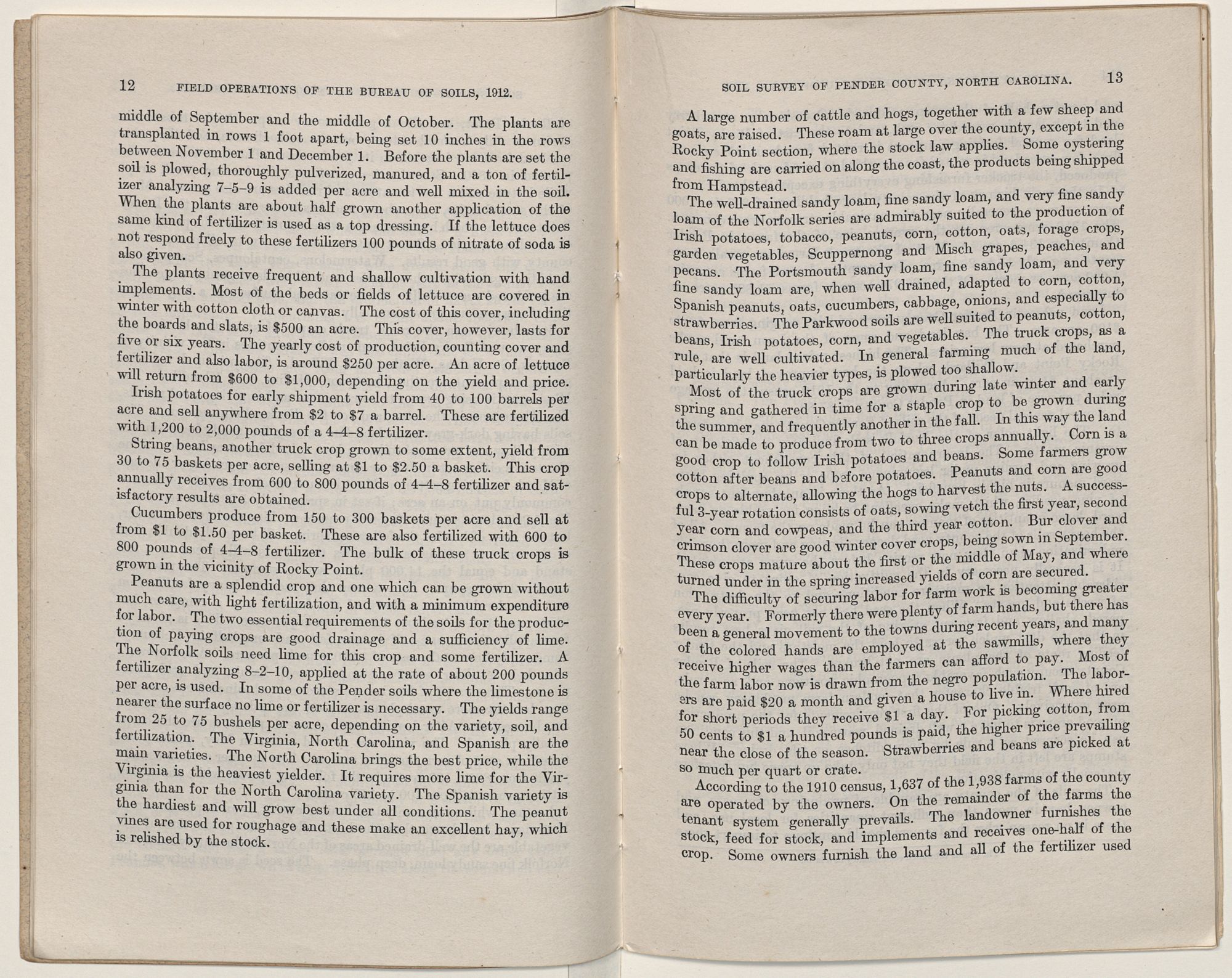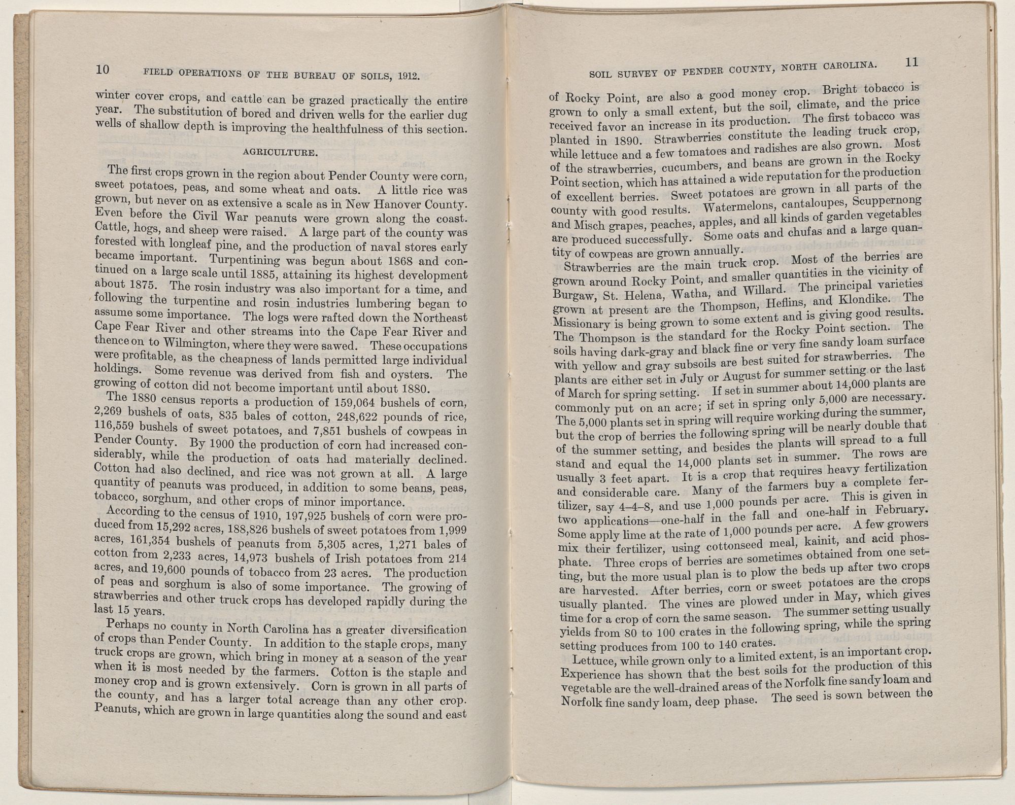 Cotton, corn, peanuts, and other general farm crops are produced. In addition to these staple products, strawberries are grown commercially, and a few Irish potatoes, cucumbers, string beans, some lettuce, radishes, and other truck crops are also grown for shipment. Rocky Point is the main shipping station for the truck, particularly for strawberries, although some of these products are shipped from Burgaw. The growing of peanuts is the most important industry along the coast.