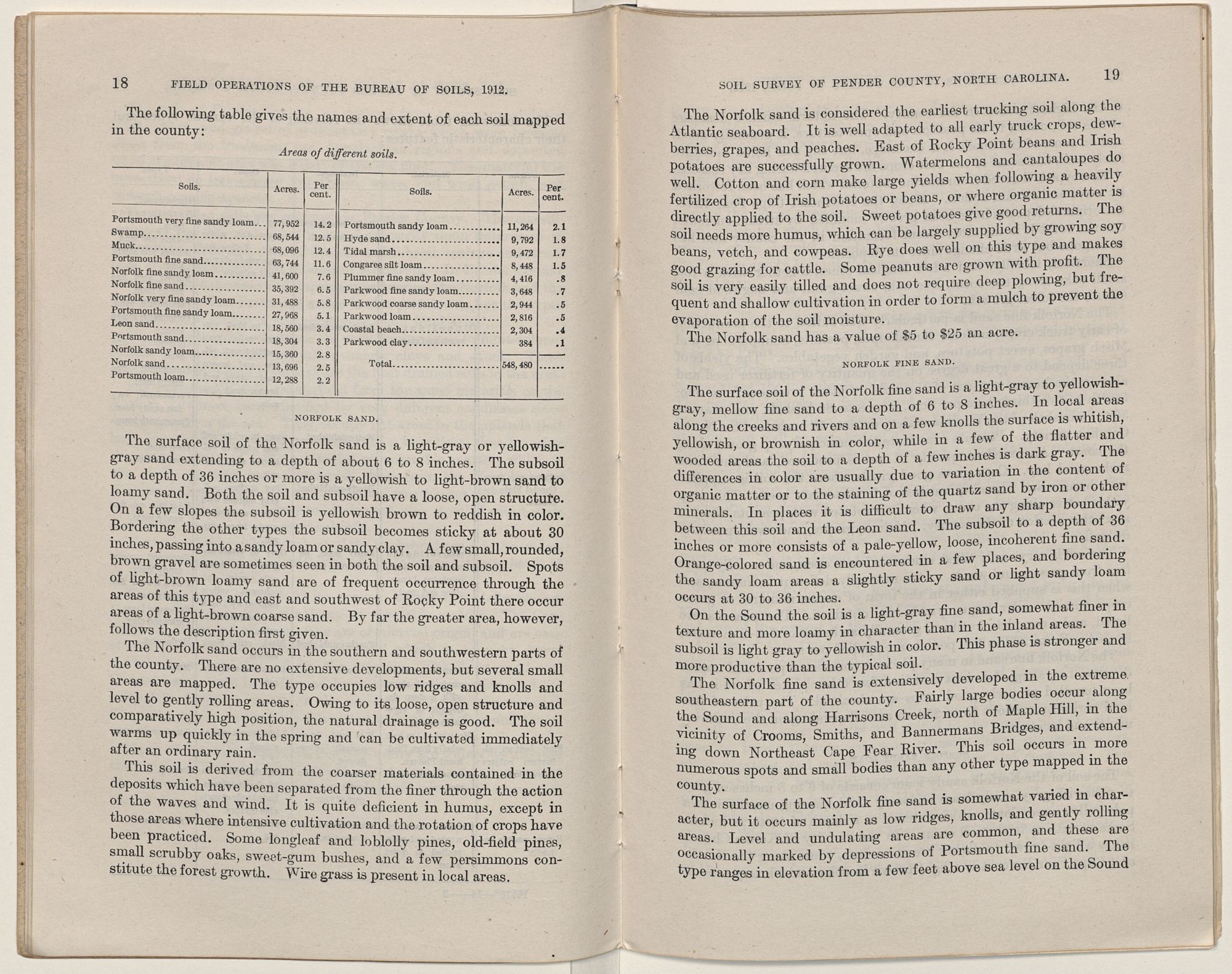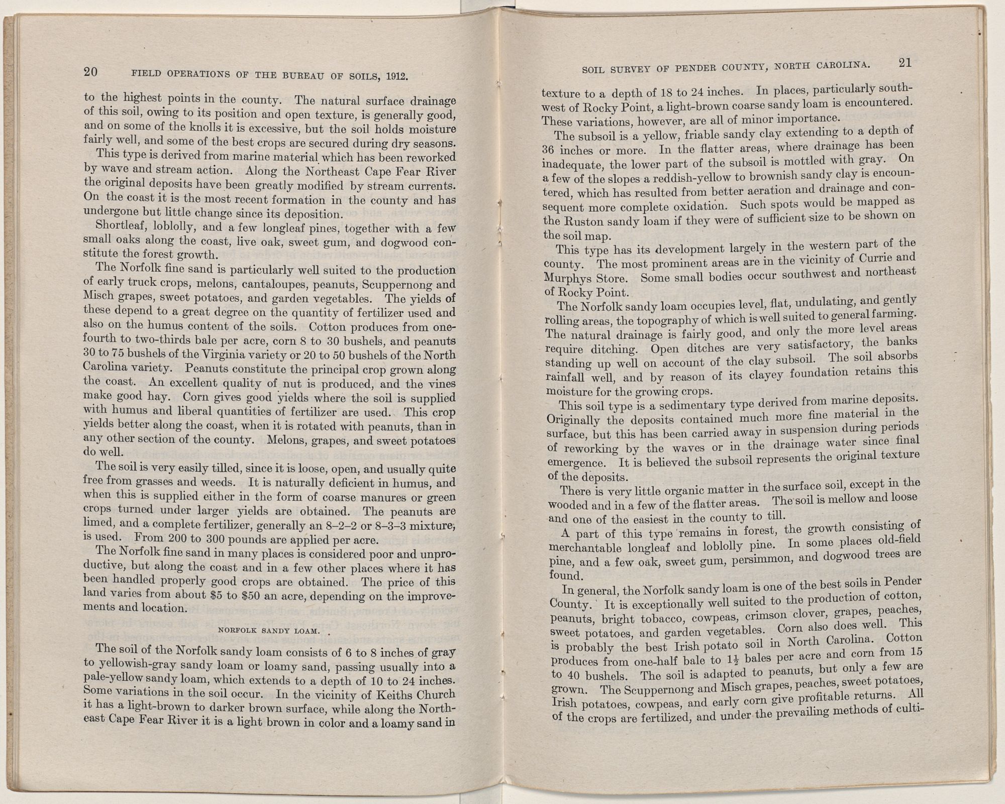 The Norfolk series comprises the light-colored soils with yellow friable subsoils. These soils have a wide distribution over the county and possess the best drainage of any of the types mapped. They are adapted to cotton, corn, tobacco, peanuts, cowpeas, crimson clover, sweet potatoes, grapes, tree fruits, small fruits, and a large variety of truck crops.