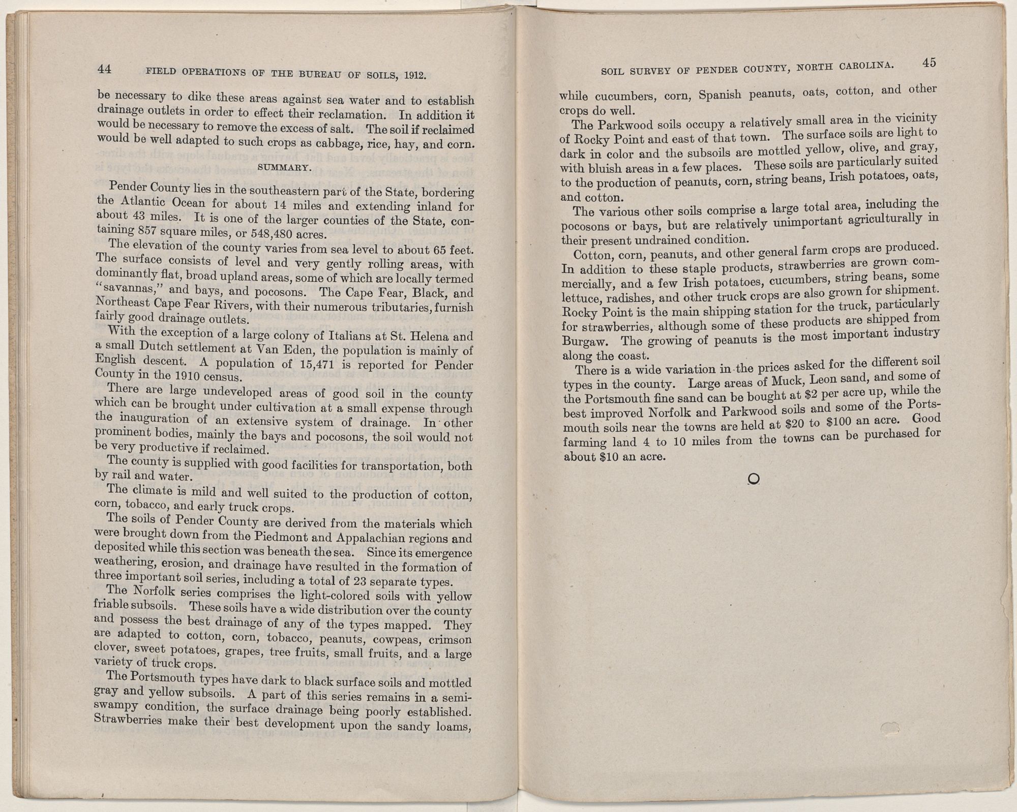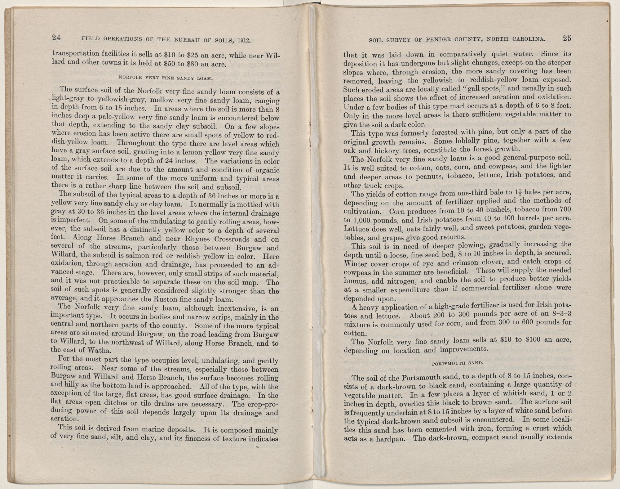 There is a wide variation in the prices asked for the different soil types in the county. Large areas of Muck, Leon sand, and some of the Portsmouth fine sand can be bought at $2 per acre up, while the best improved Norfolk and Parkwood soils and some of the Portsmouth soils near the towns are held at $20 to $100 an acre. Good farming land 4 to 10 miles from the towns can be purchased for about $10 an acre.